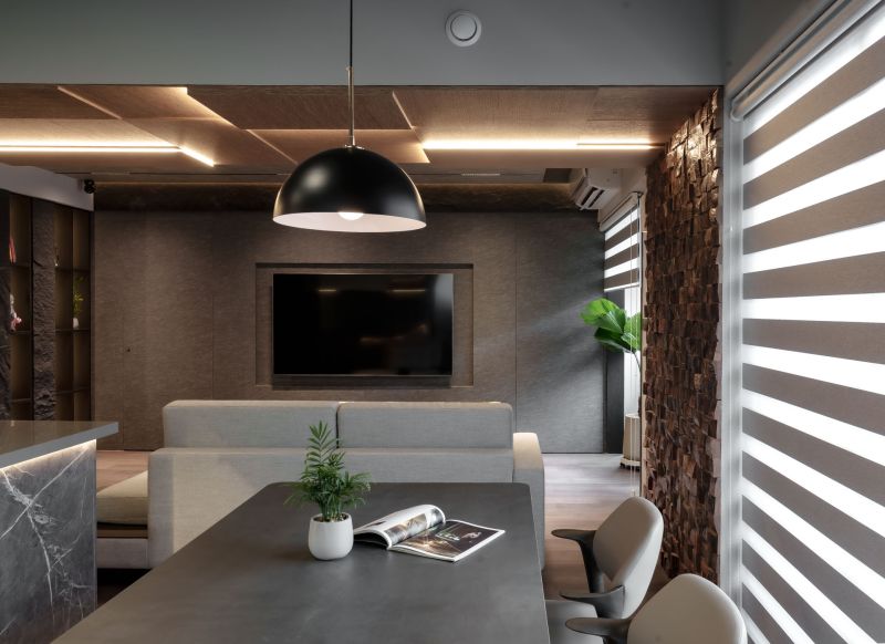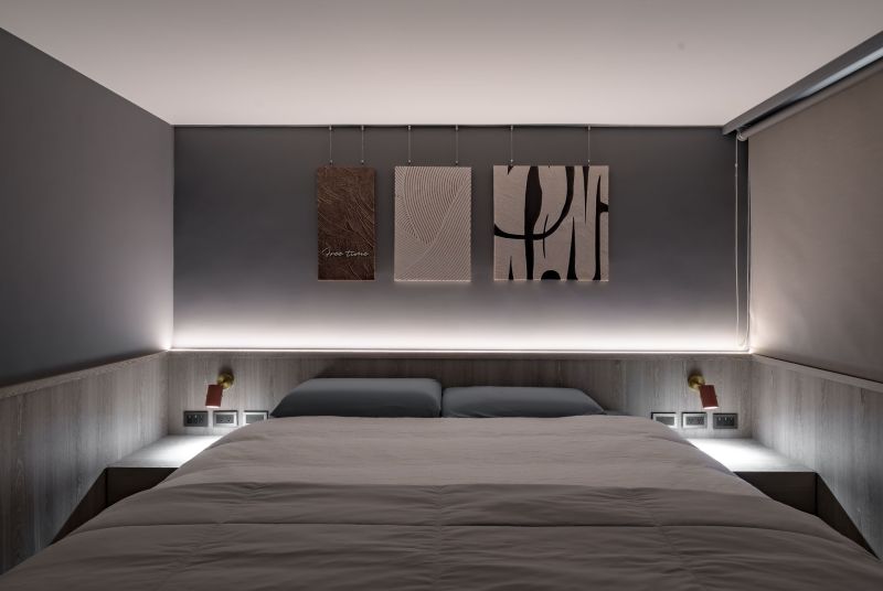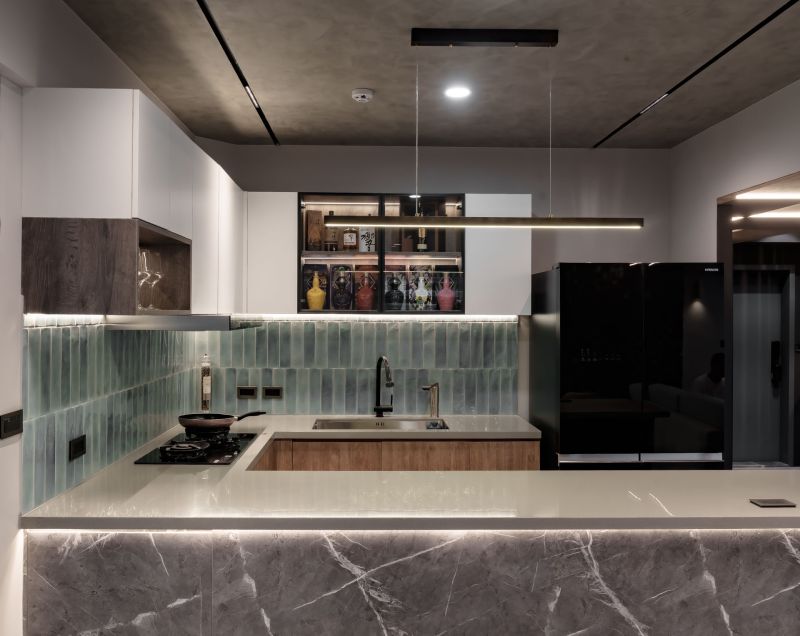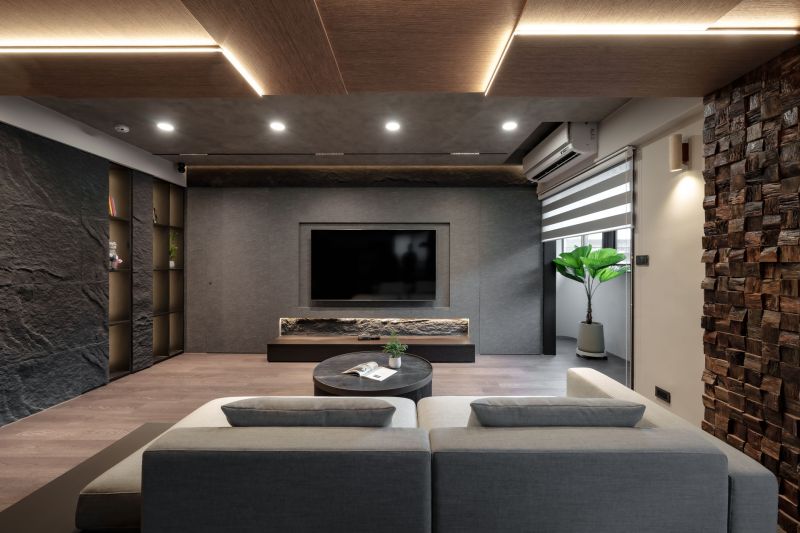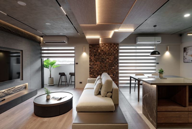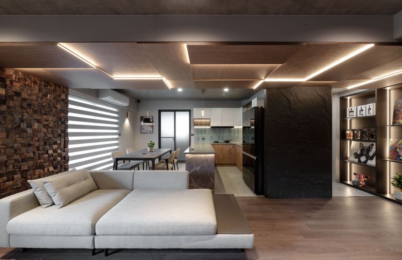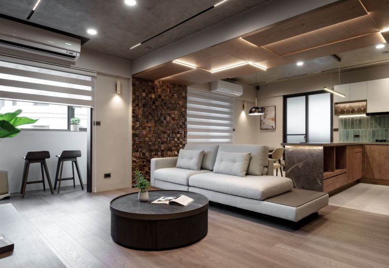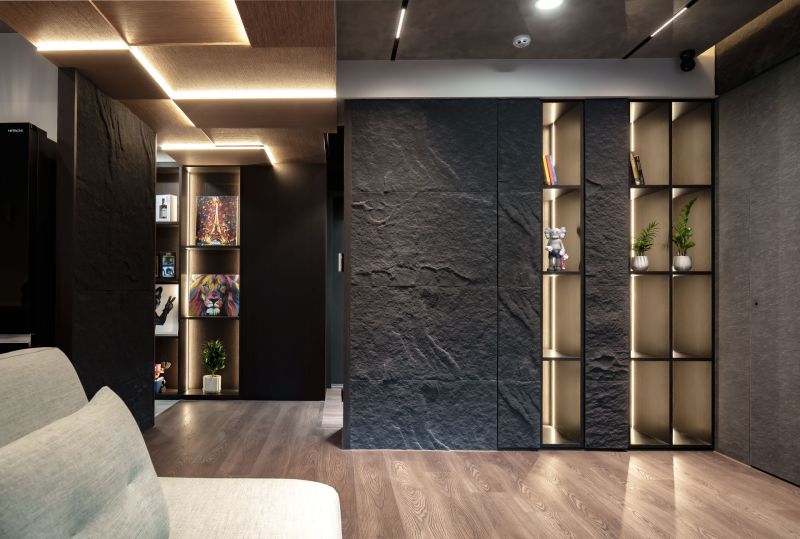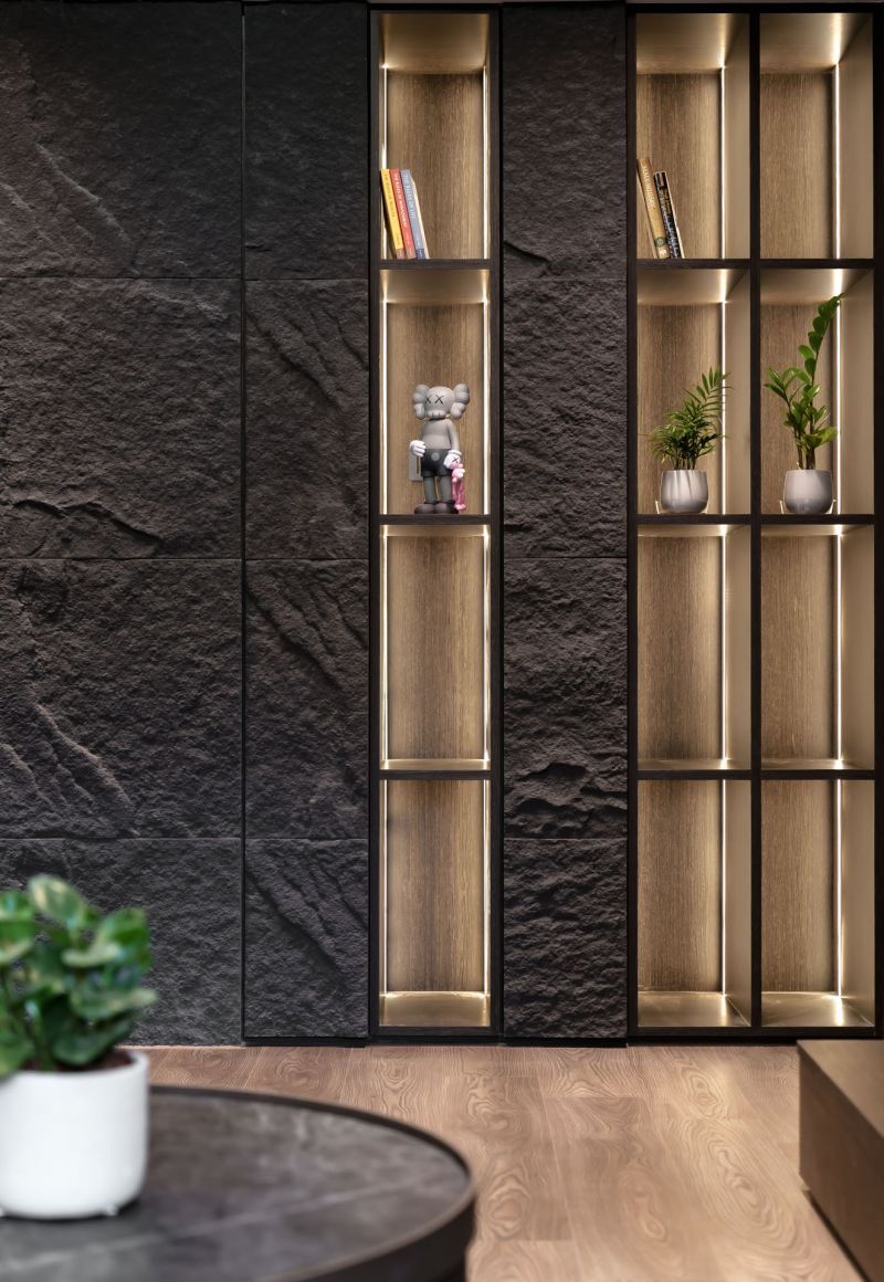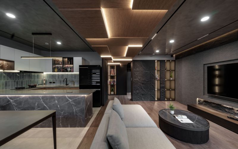 The design embraces “landscape” as its central theme. Stepping inside, the entryway’s lattice unfolds like a woodland path, setting the tone for the journey within. In the public area, stone textures, wood tones, and shifting light interplay recreate the richness of a forest. The slightly elevated kitchen at the center mirrors the serenity of a mountain lake, with sightlines extending toward the sunlit balcony, opening onto a vast, cliffside-like view — creating a layout that offers a smooth connection between indoor and outdoor areas.