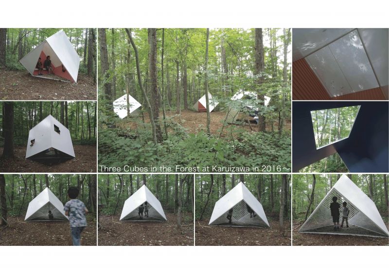 Playground equipment for children, public furniture, art objects, meditation rooms, small rest spaces, waiting rooms. “Three Cubes in the Forest“ are the micro‐architectures with the various characteristics and functions. Three Cubes can be easily transported by a truck and can be installed.