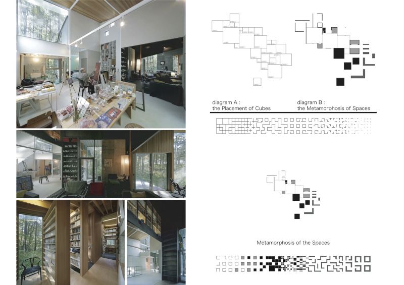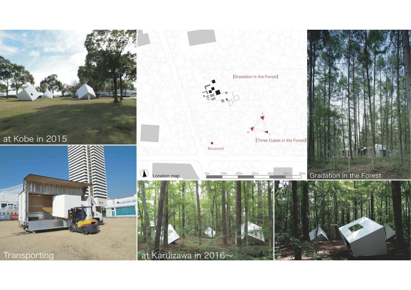 “Metamorphosis in the Forest“ consists of “Gradation in the Forest” and “Three Cubes in the Forest”. The theme of this project is that spaces penetrates deeply into the forest.
