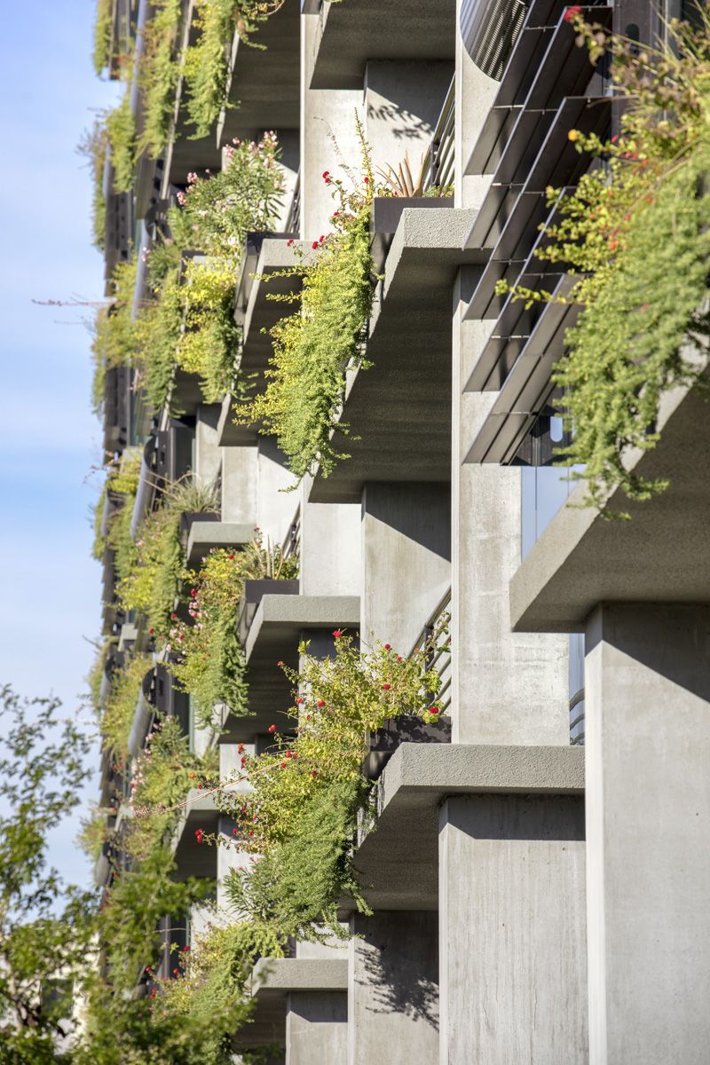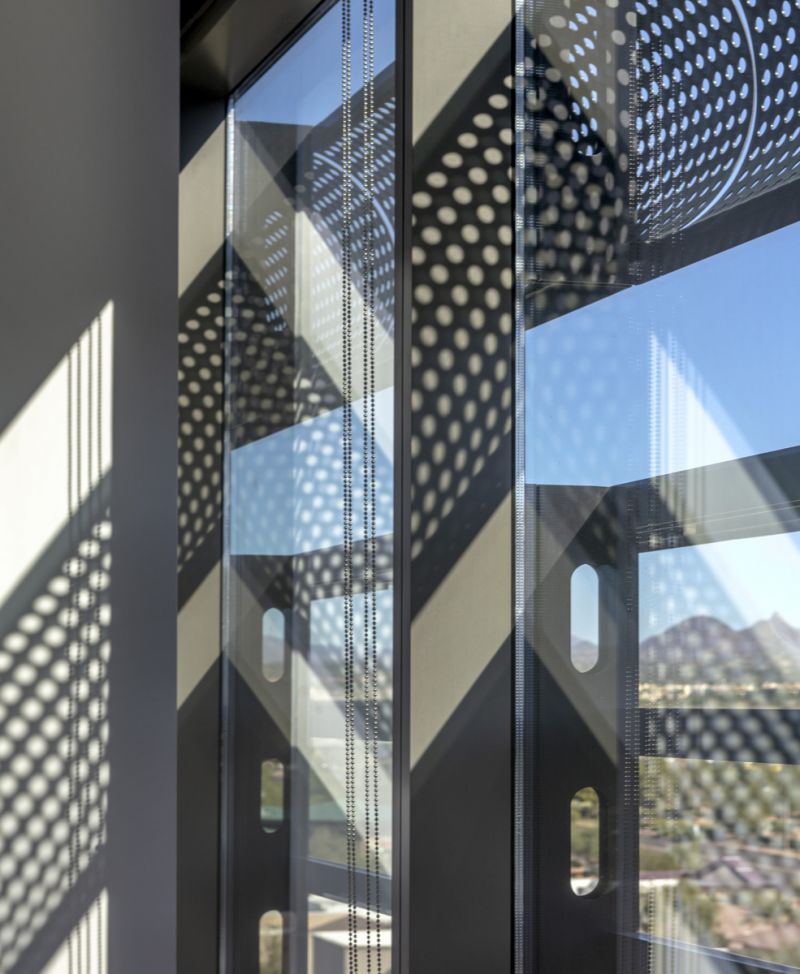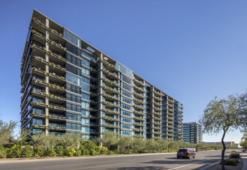 Optima Kierland Center is a 9.5-acre mixed-use residential development located in Phoenix. The architecture is a 21st century urban solution to residential design. The vibrant undulating façade with perforated panels and sunscreening louvers creates shade and shadows, voids and textures. The vertical landscaping system provides sun protection and privacy to each unit. This innovative system with self-containing irrigation and drainage enables a palette of vibrantly colored plants to grow up and over the edge of each floor of the building.