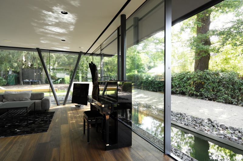 The aim was to define generous relationships between inside and outside on the small property with valuable trees and the given building scale. The play of light and shades of the trees as well as the reflections of the water surface in front of the glazed facades create intense room atmospheres.