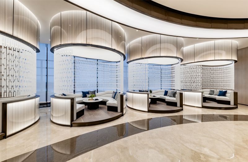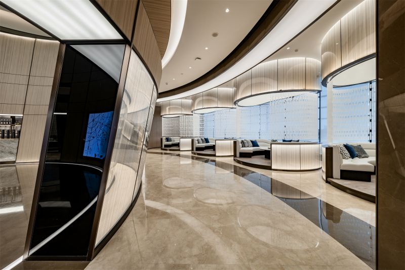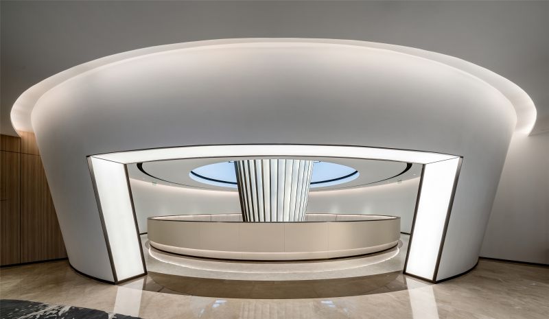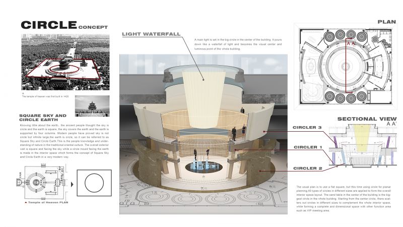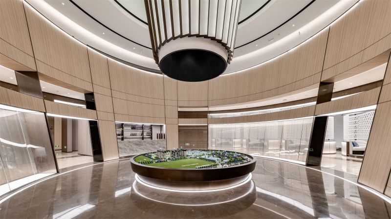 The project is sales center of residence area.We introduced the philosophical thought in the oriental culture of Square Sky and Circle Earth.The overall exterior wall is square and facing the sky while a circle mould facing the earth is made in the interior space which forms the concept of Square Sky and Circle Earth.40 types of circles in different sizes are applied to form the overall interior space layout.The sand table in the center of the building is the biggest circle in the whole building.A main light is set in the big circle in the center of the building.