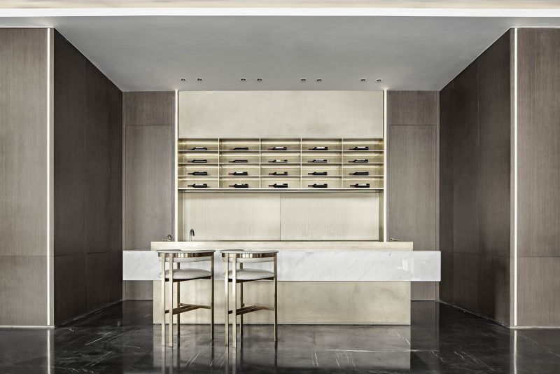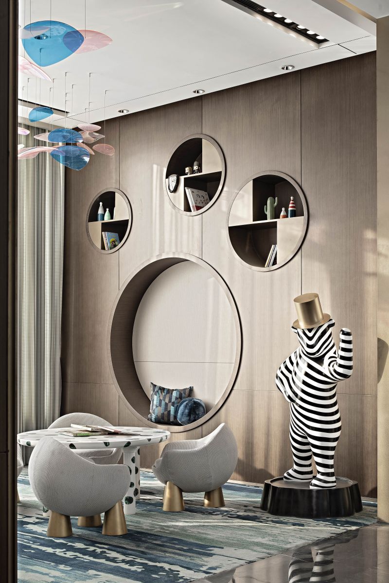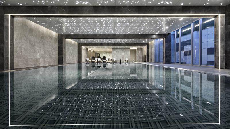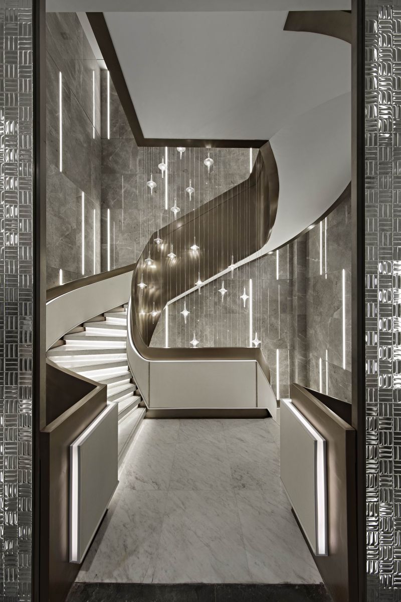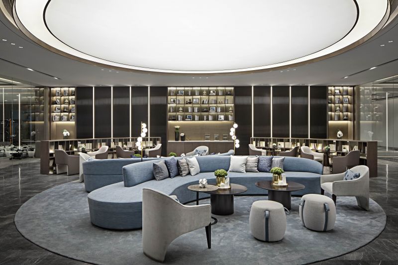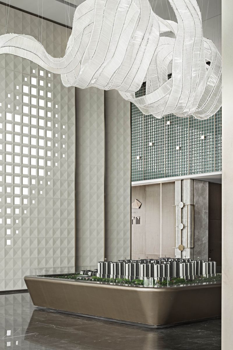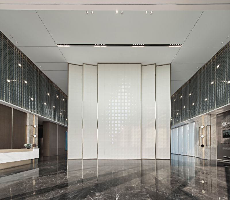 “Constructing” is extracted as a design term for the project. The symbolic element of city wall is disintegrated and refined into the key words of pattern, void and solid, light and shadow to interpret the visual, spatial and spiritual etherealness. Functional requirements are followed and an intensive and flowing integrated layout is achieved. “For integrated presentation of various spaces, restraint is exercised in design methods and material selection. The jointing method is used to inlay refined metals into columns and decorate wall lamps.