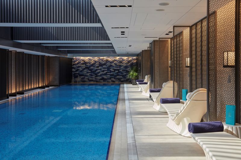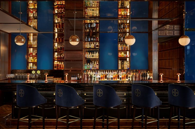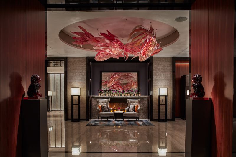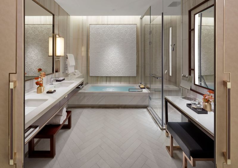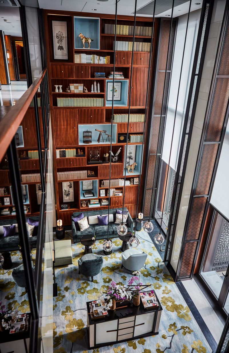Located in the protected zone of the Forbidden City, the 73-room hotel marks the brand’s debut in Beijing. The interiors were designed as a modern-day princely courtyard mansion, with a modern residential style combined with subtle traditional Chinese elements. A transit lobby greets guests with an open skylight court. Inside, a central water feature surrounded by dark stone facades and soft-lit lampshades pays homage to the ancient well. A large entryway leads into the main lobby where warm timber walls are trimmed with dark lacquer shelves, area rugs in autumnal colors.