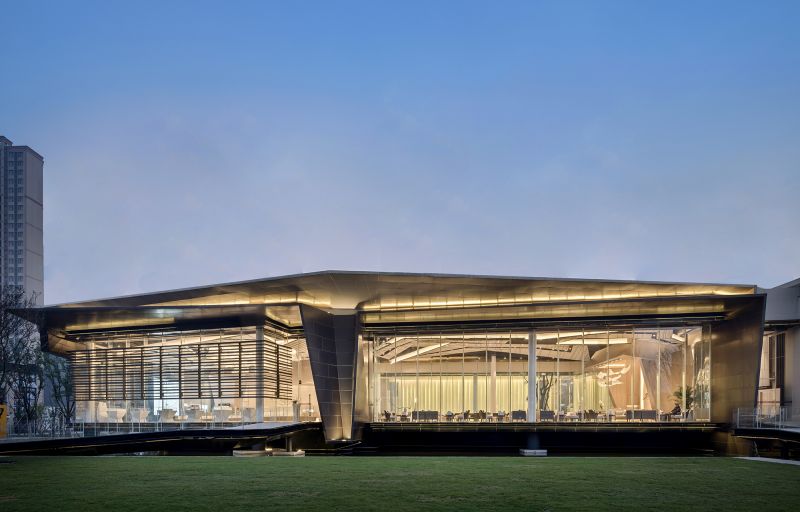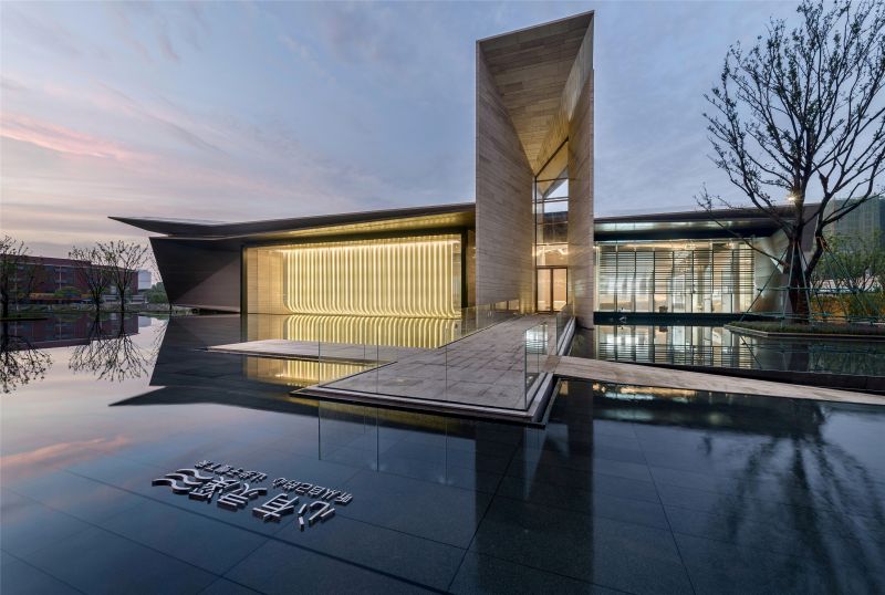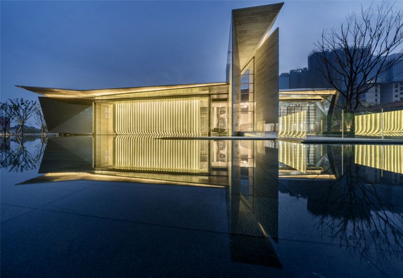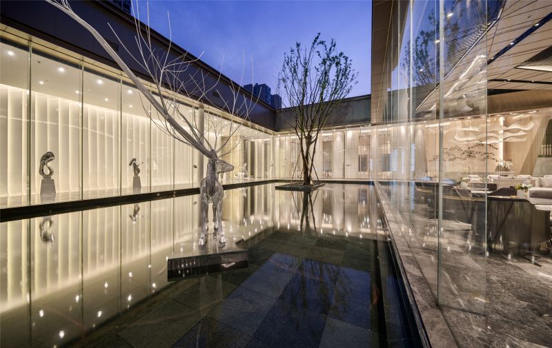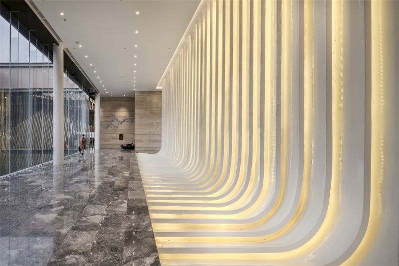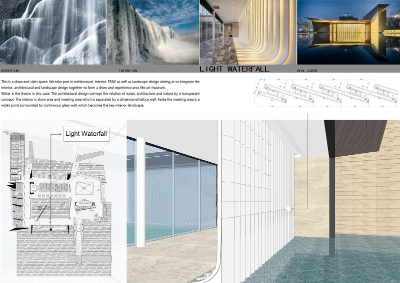 We design a luminous water curtain wall for exterior elevation of the architecture to echoing the theme of water.Luminous water curtain wall is consisted by LED light strips,the running light strip looks like running water,which is reflected in the water pond.The water curtain wall has two surfaces,one is the exterior elevation of the architecture and the other is the interior background wall.