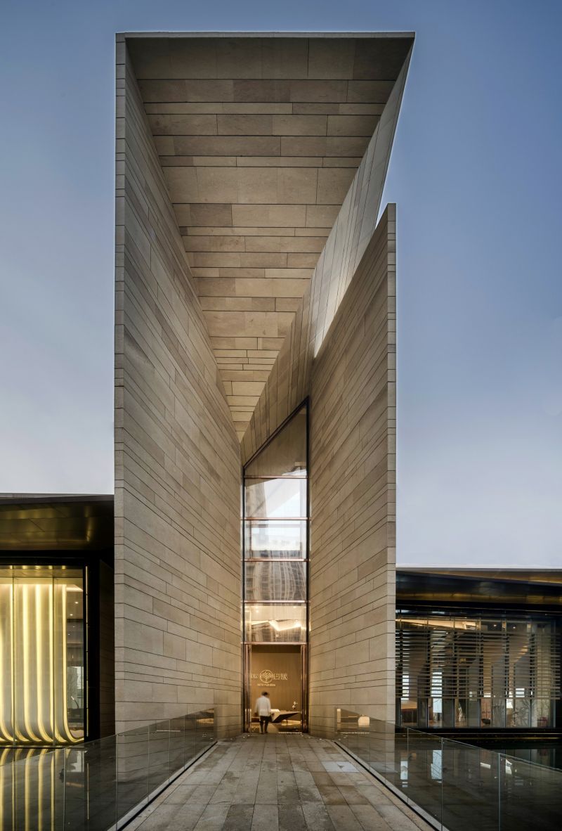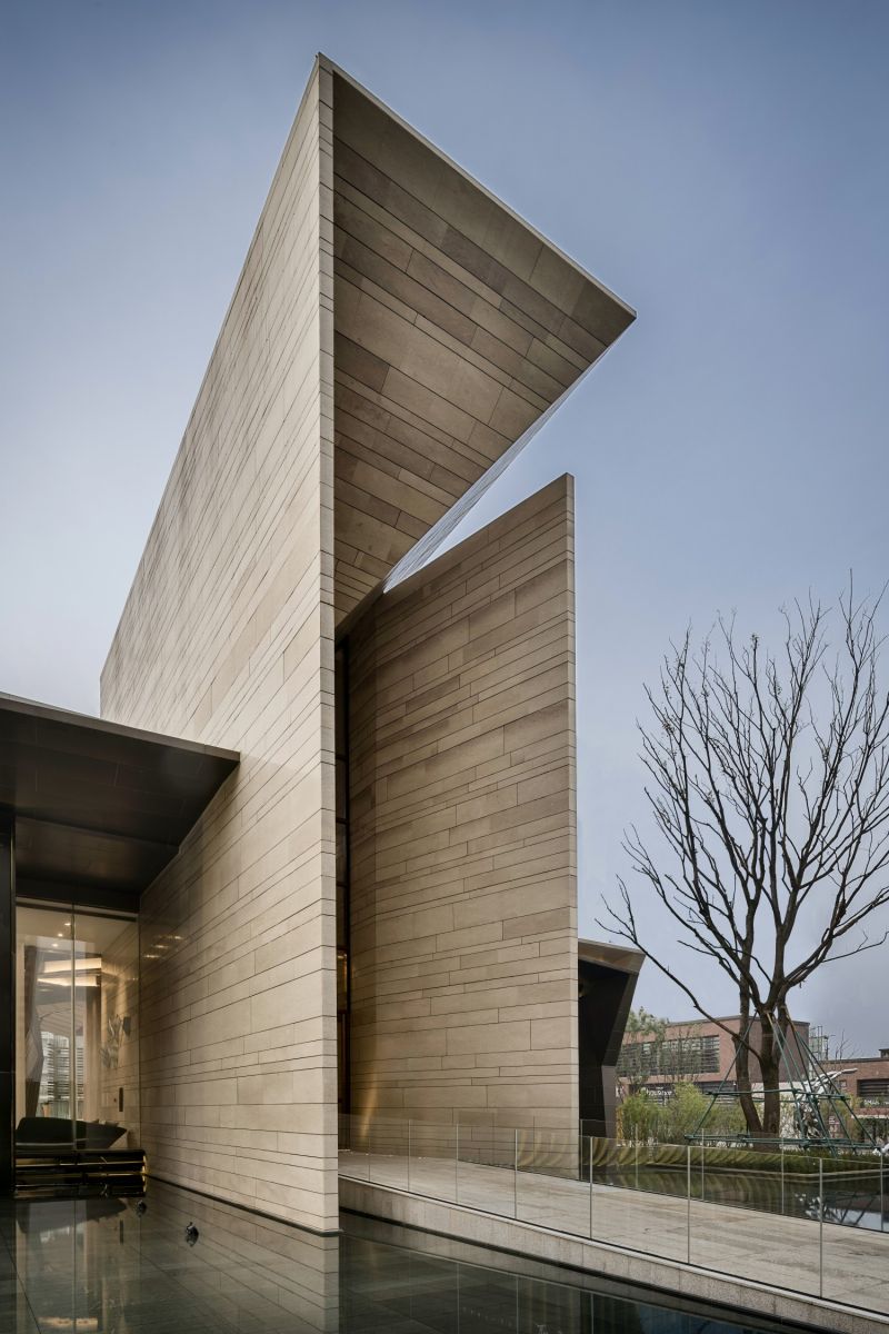 A large pool is designed in front of the architecture and it looks like that the whole building is floating on the water.