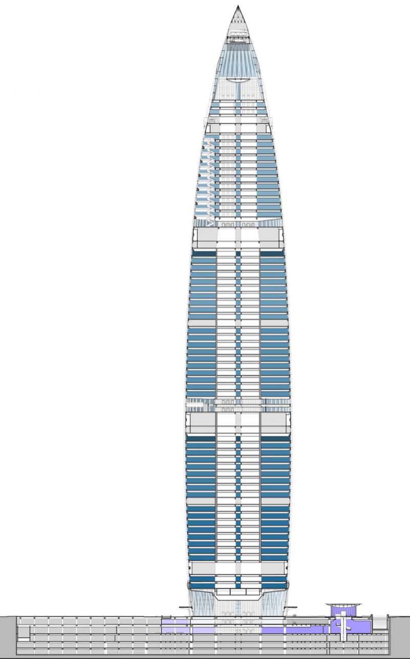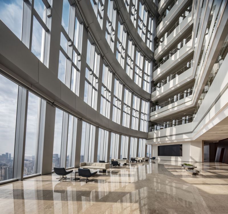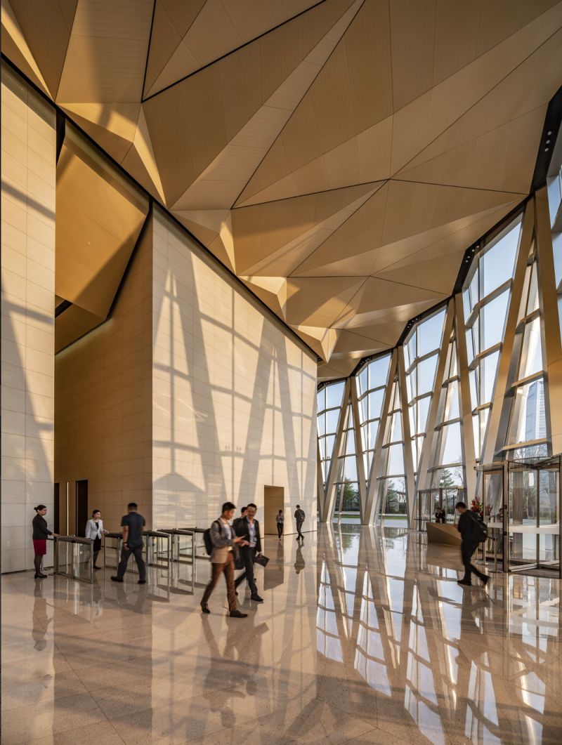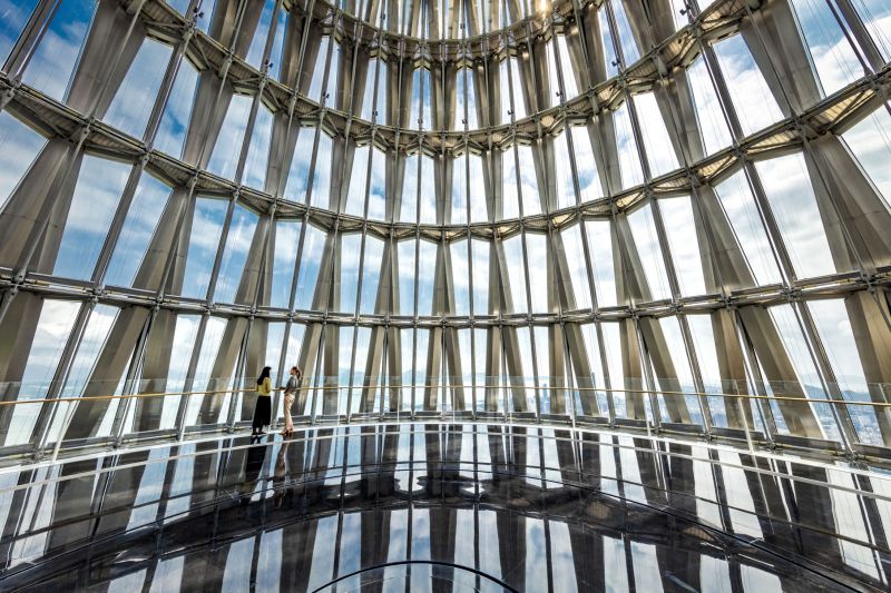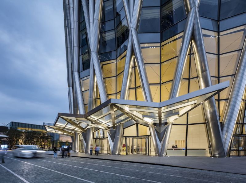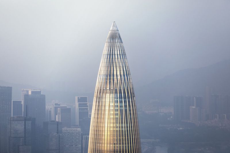The China Resources Tower is Shenzhen’s latest vertical icon, marking the city’s cultural development with its distinctive form. Inspired by the organic shape of the bamboo shoot, the 400m tall building’s 56 stainless-steel-clad exo-columns converge into 28 pillars at the top and bottom to create a diagrid system, emphasizing the tower’s verticality and tapered composition. The diagrid structure allows the interior floorplan to be free of columns, opening the floorplates to panoramic views. The apex culminates at a sky hall, featuring a unique interior view of the spire at its pinnacle.