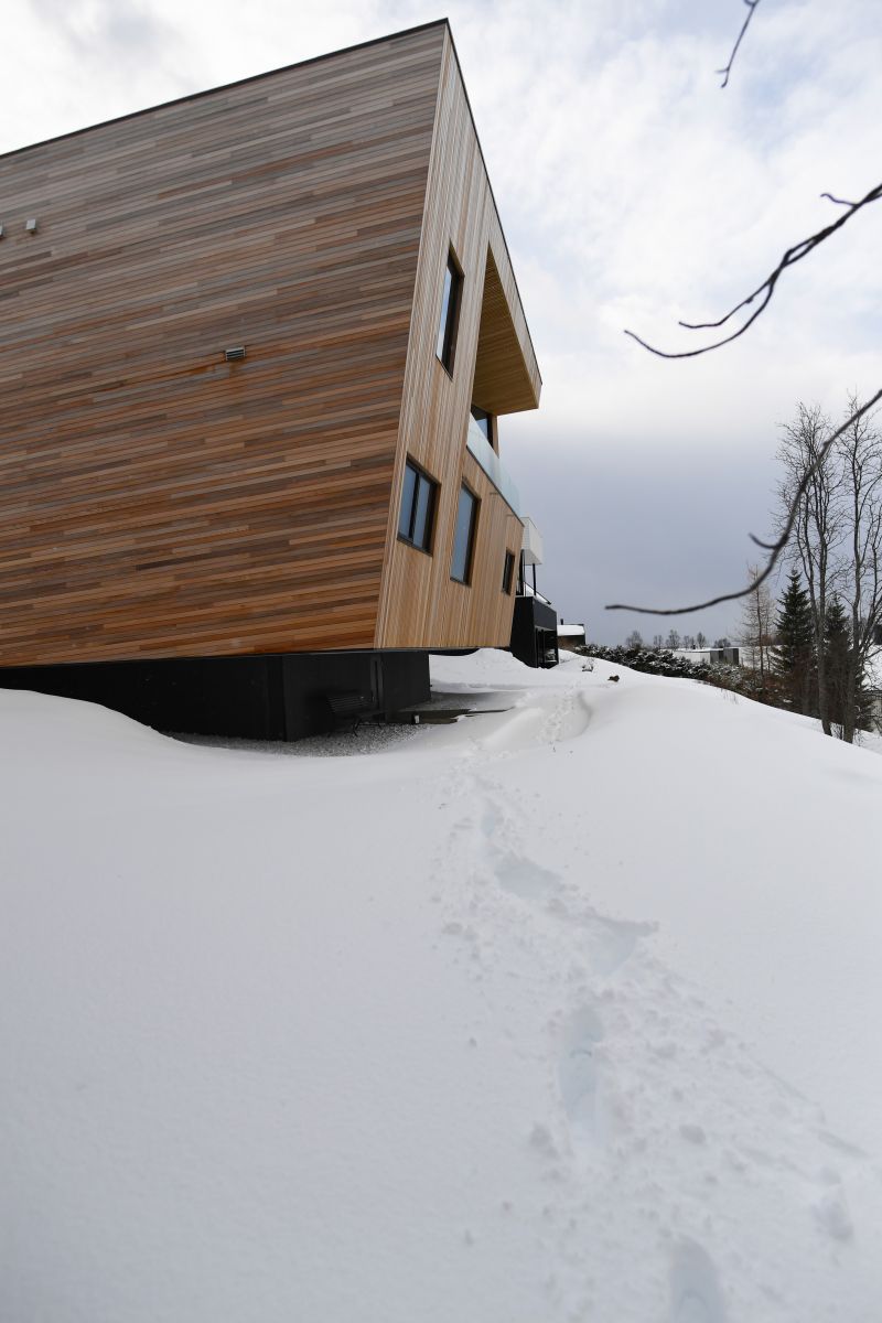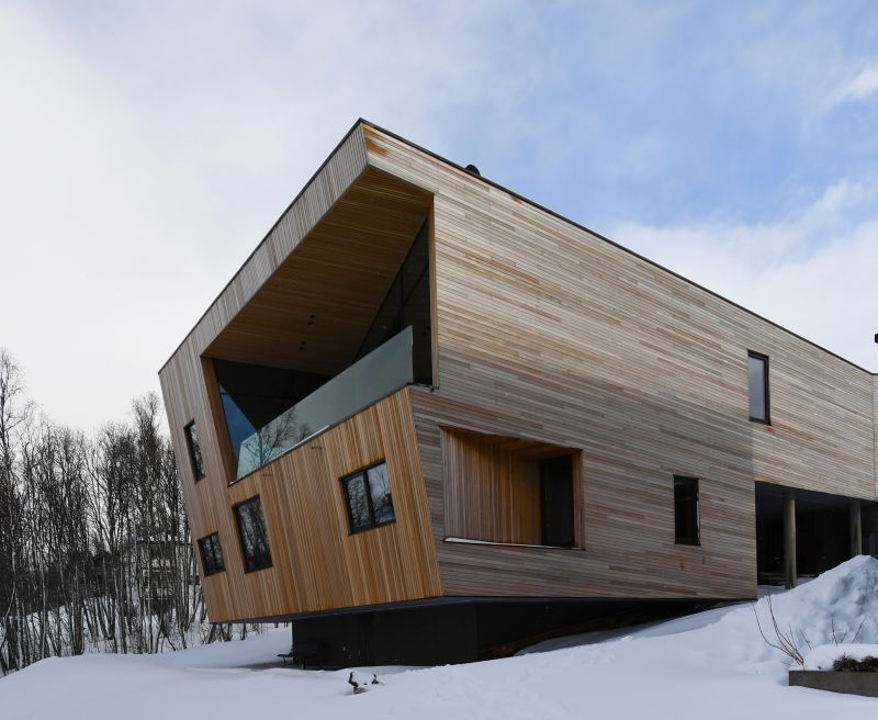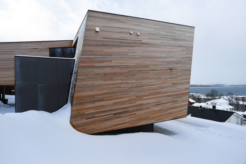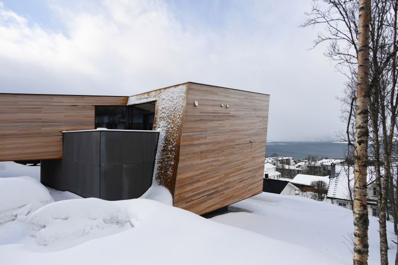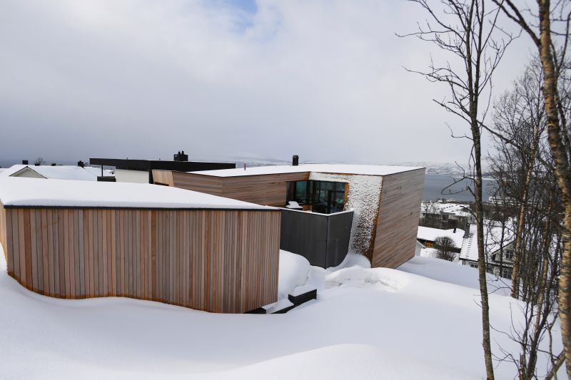 A single family villa in the city of Tromsø on a unoccupied slanting site enjoying panoramic views towards the sea and the mountains in the west, but in an urban area which demands a conscious design to not only embrace views and the movement of the sun, but also enhance privacy. The design utilizes the natural height differences in the terrain to ensure the main floor with living room and kitchen/dining area enjoy the beautiful view and still stay within the height regulations in the area. The entire building is set to float above ground accessible only via the entrance that forms a bridge.