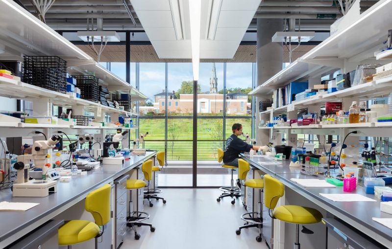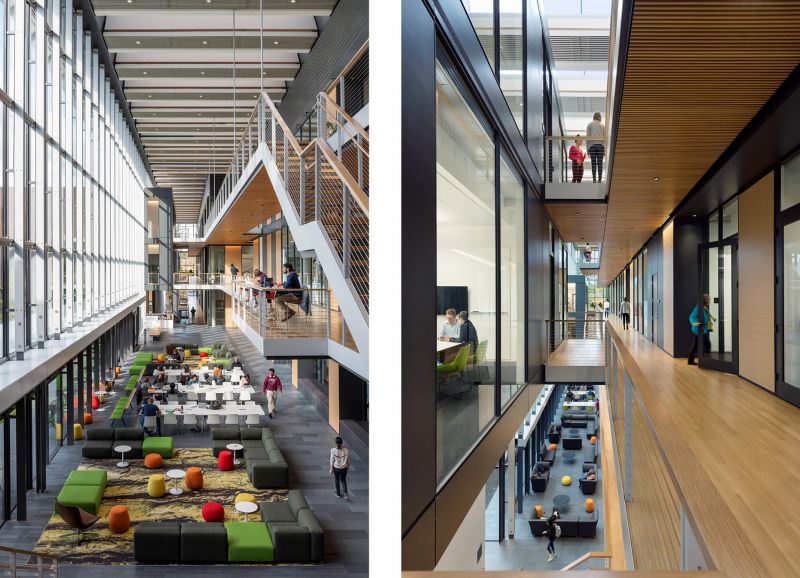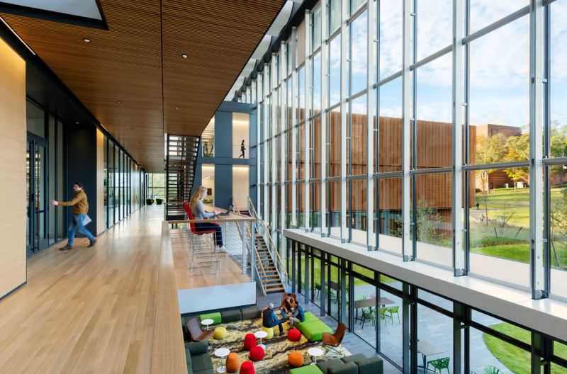 Amherst College sought a new, forward-looking building that would create an open learning environment for the entire campus community for the next 100 years. The components—two high energy laboratory wings tucked into the hillside to the east, and three pavilions of low intensity uses extending west toward the hilltop academic core—are organized around a central commons and unified by dramatic roof canopy. Predicted energy usage of 91 kBtu/SF is 76% lower than the 2030 baseline and 15% below the current reduction target goal.