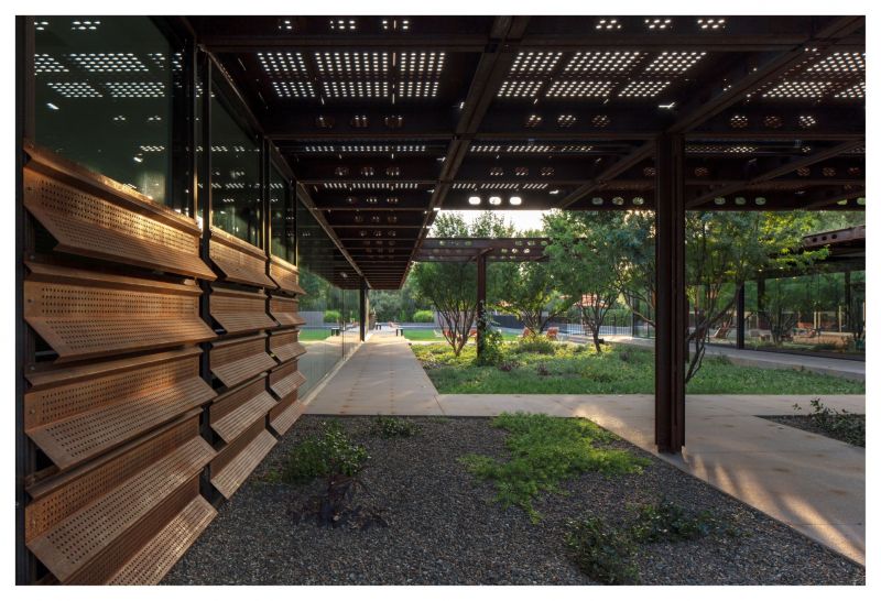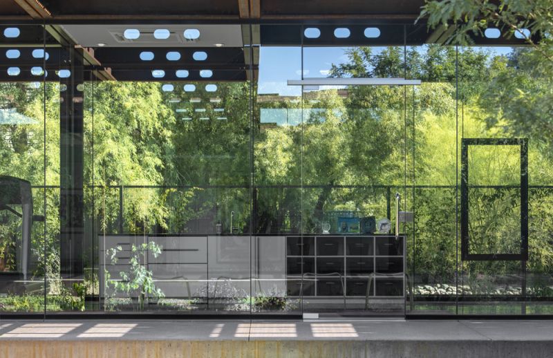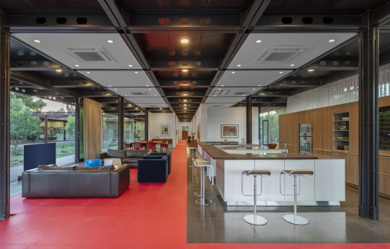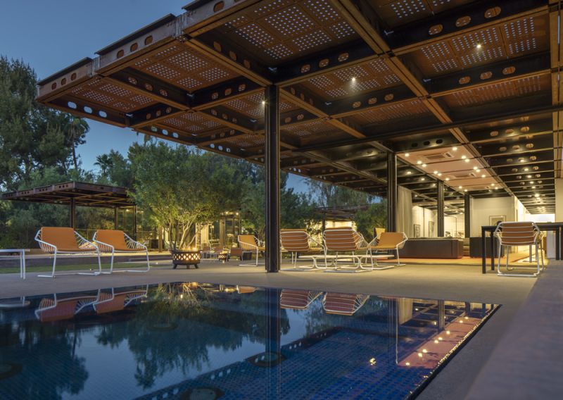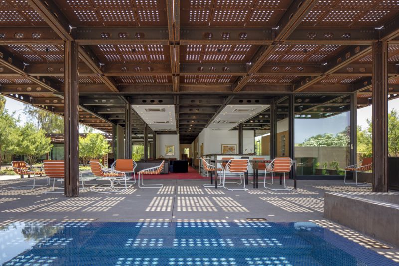 Arizona Courtyard House is a pavilion constructed with a system of standardized Corten steel structural components. The home demonstrates the flexibility of this sustainable building system to create a house of linear volumes, arranged to define a courtyard, with the house to the south and east, a fitness center and lap pool to the north, and mountain views to the west. The house is an open plan, based on a 7’ x 7’ modular system with columns spaced at 21’ on center. The two-way structural framing system allows for extensive cantilevers. The home was built in under five months.