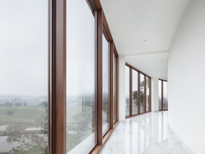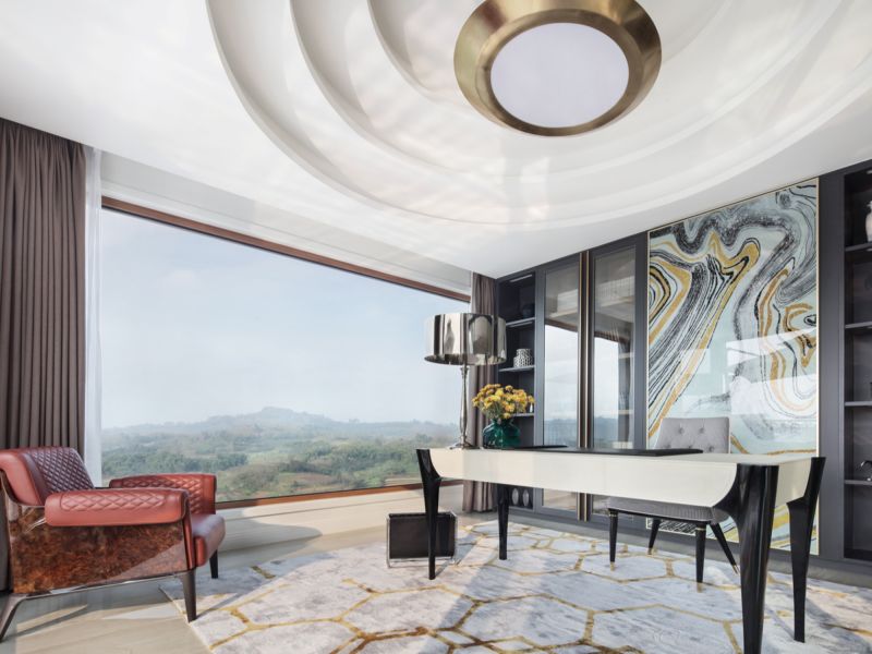 The building is located on the mountain top and at the foot of the mountain lies a large wetland park. The designer transforms exterior walls of each floor that faces the mountain into huge monolithic glass. Floor-to-ceiling glass exterior walls are used in the 60-meter corridor that surrounds the whole building on the negative layer to create spectacular view of the landscape.