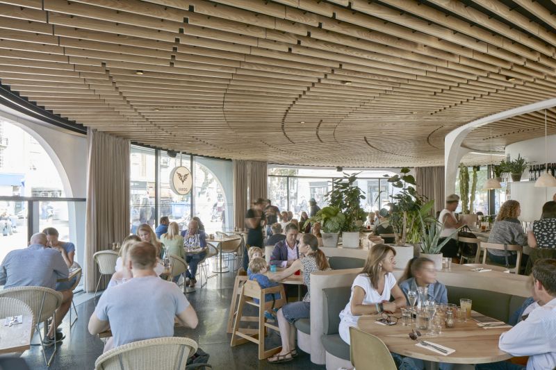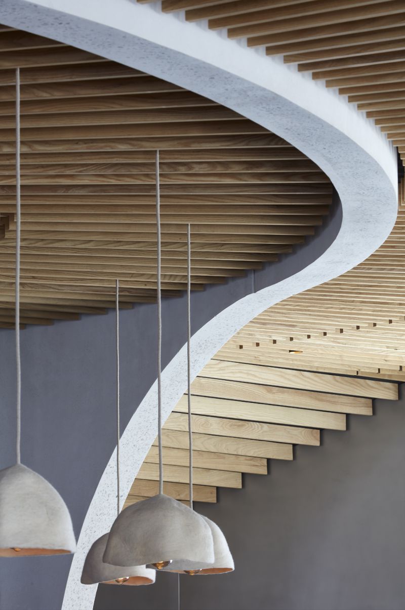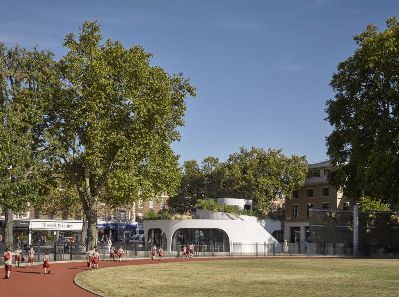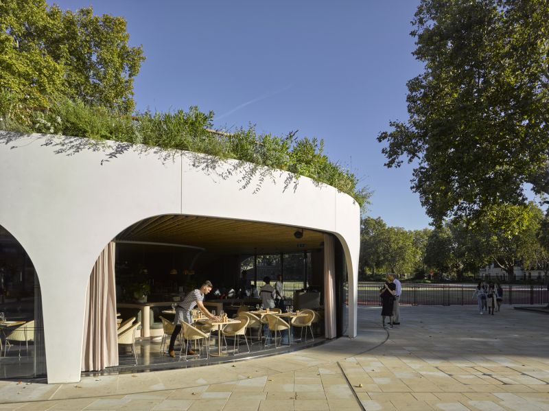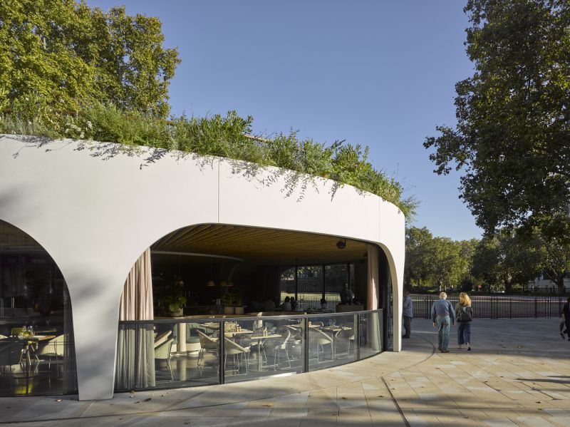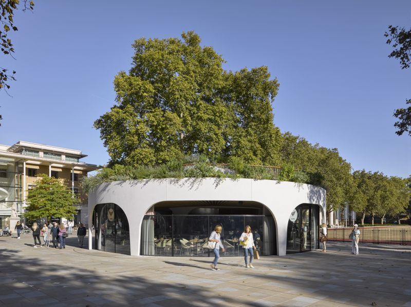 The building’s spiralling, sculptural form references the adjacent Grade II listed wall of the Duke of York Headquarters, and features a pioneering, retractable curved glazing system, allowing dining to spill onto the surrounding square in summer. Above, a public roof garden offers a peaceful retreat from the streetscape.