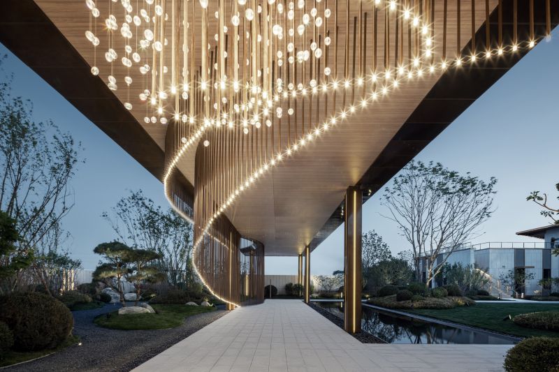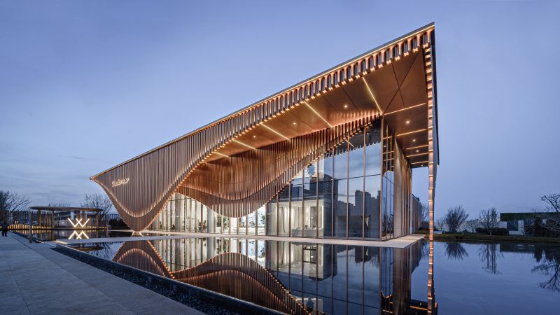 The project is located in the core area of Shenbei New City,Shenyang. It makes full use of geometry and curve elements, and fully excavates the aesthetic feeling of the body with modern techniques and materials. The clean glass surface substrate and the outer multi-layer staggered flowing copper like grille are cantilevered and surrounded, which greatly improves the sense of quality.