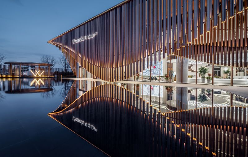 The project is located in the core area of Shenbei New City,Shenyang. It makes full use of geometry and curve elements, and fully excavates the aesthetic feeling of the body with modern techniques and materials. The clean glass surface substrate and the outer multi-layer staggered flowing copper like grille are cantilevered and surrounded, which greatly improves the sense of quality.