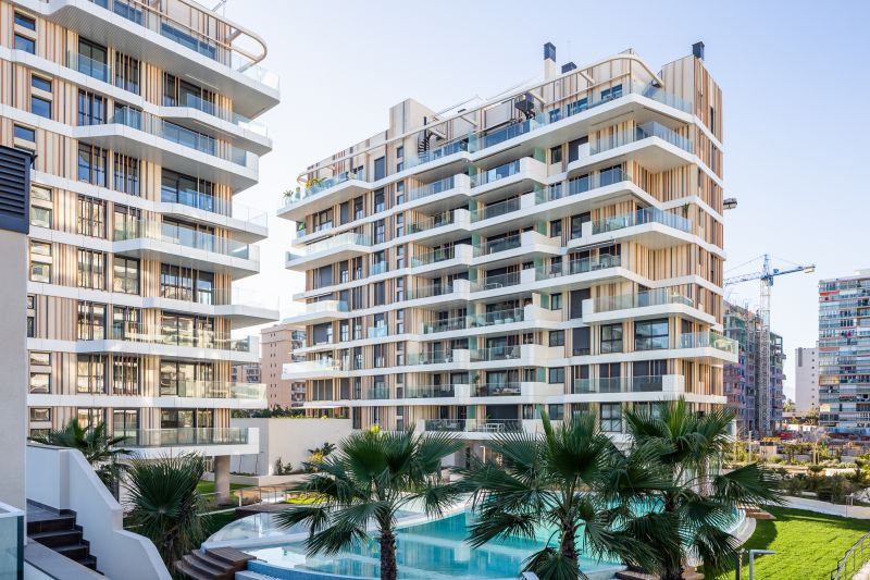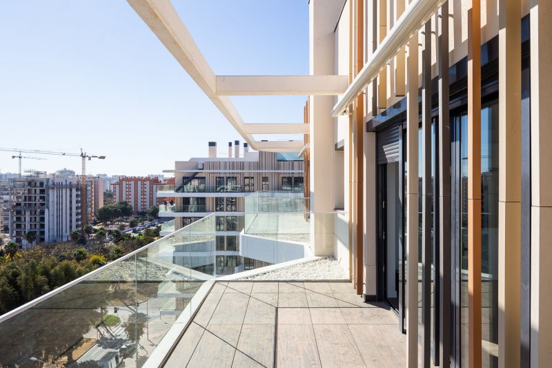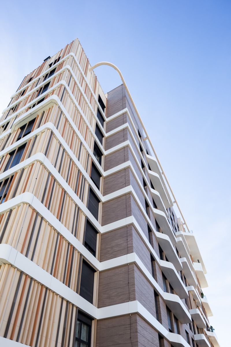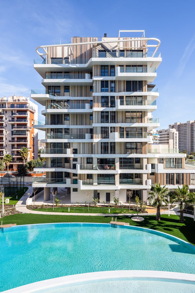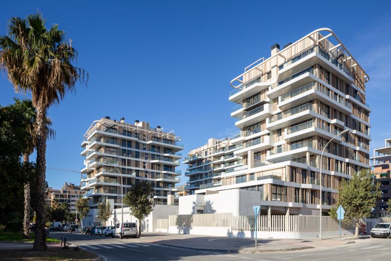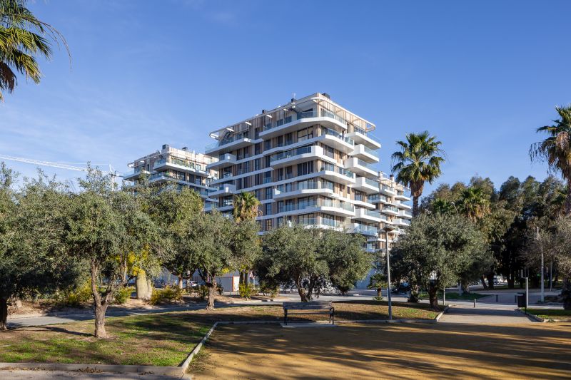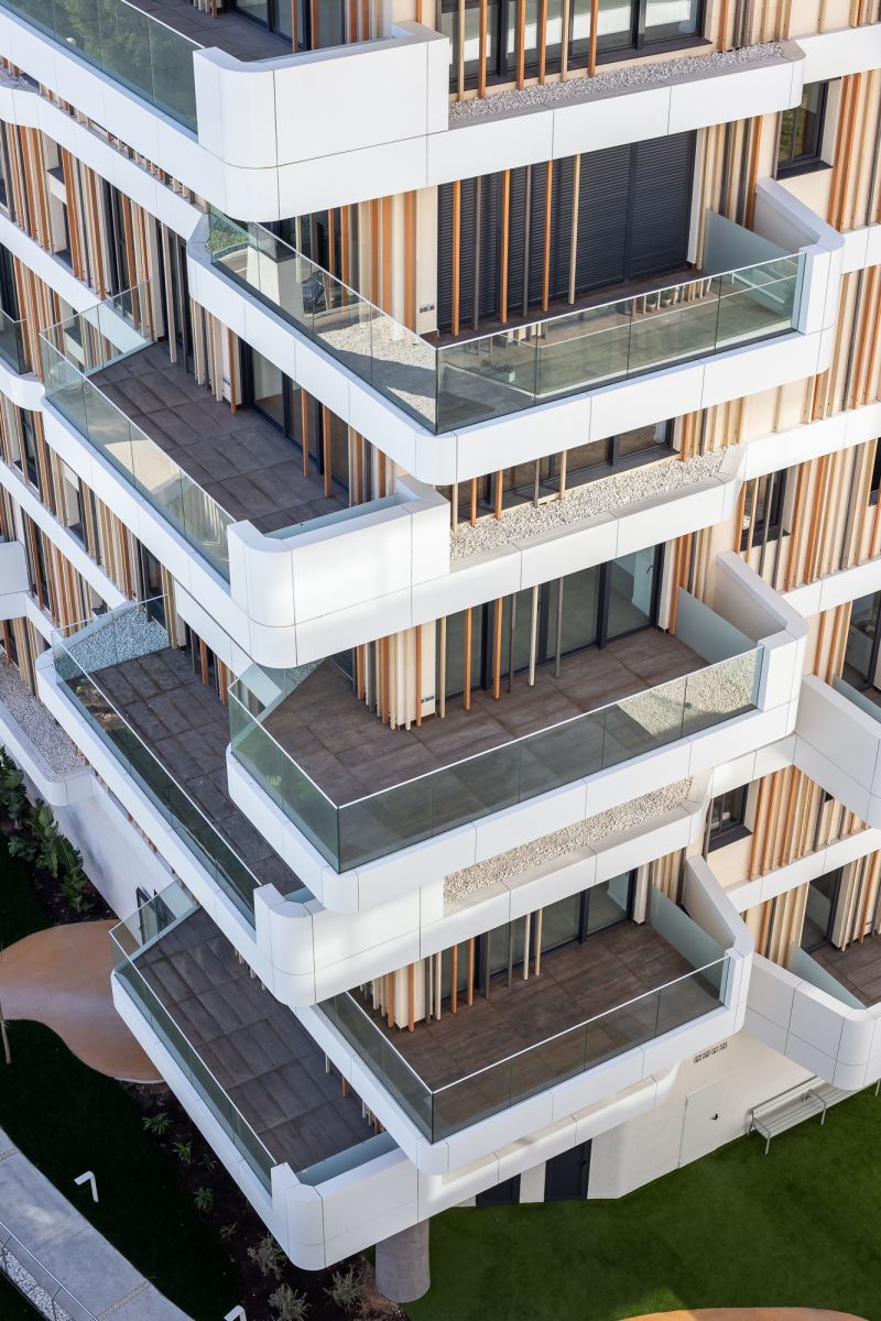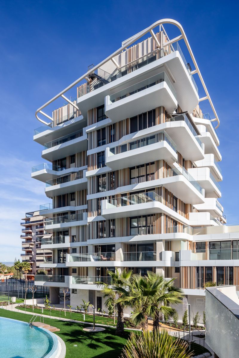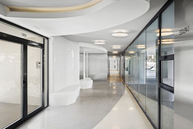 Nature is that contact with the outside environment, chasing the oxygen, the relief and the sea breeze. Two elements define its external appearance: the white aluminum rings that generate sinuous lines surrounding the buildings and the ceramic “baguettes”, forming a second skin of variable density that protects the facades from sunlight. Nature is adapted to its location and it was designed to provide the services of a large city without leaving its natural hábitat. The landscape is designed as a green gradient towards outside, organized by a grey amoeba that distributes all the uses.