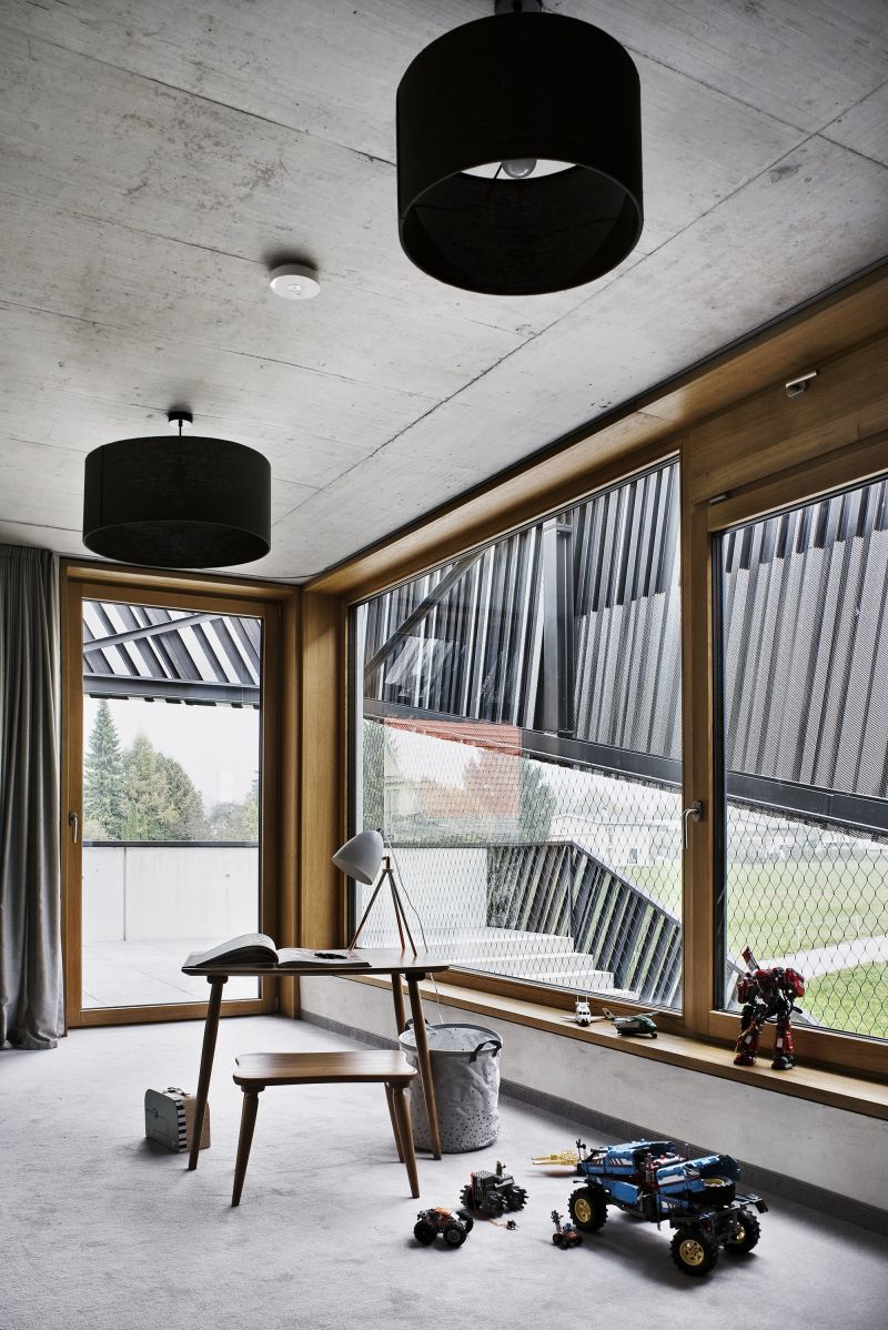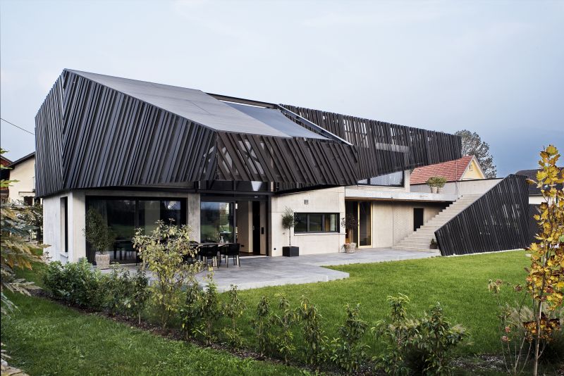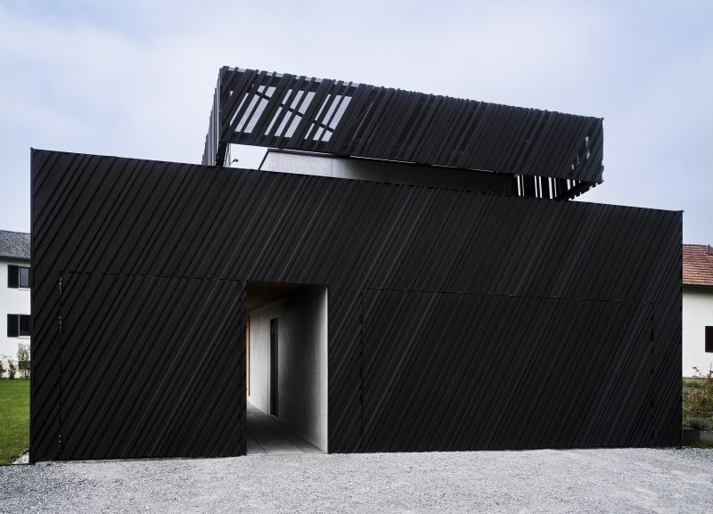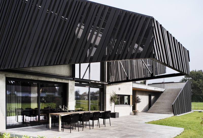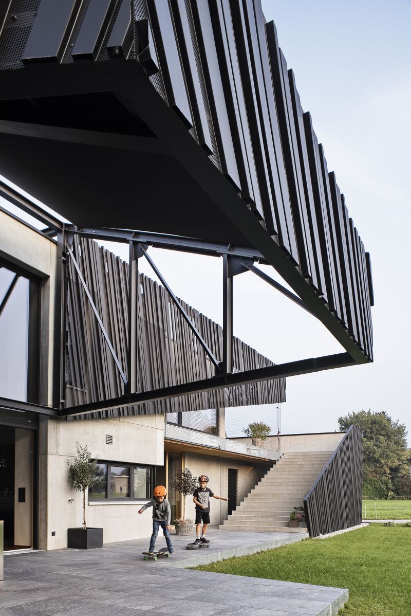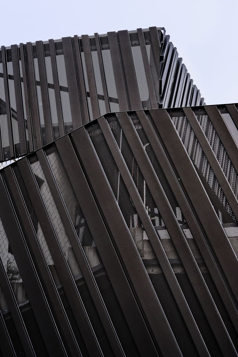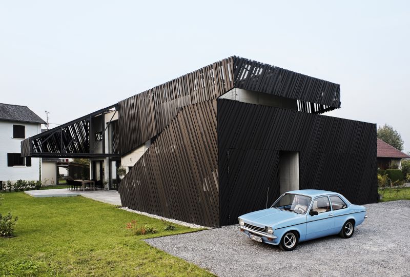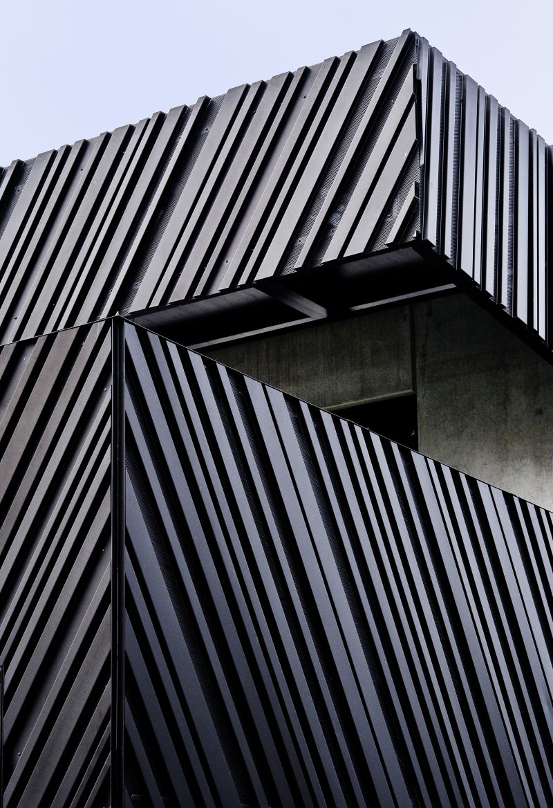 The building consists of precast concrete elements creating a reduced cube. The facade is made up by especially developed and folded bands of pre-oxidized zinc, which is set onto a steal support structure placed around the cube. These folded sheets of zinc were applied onto the building in such a way, that the facade dislodges itself repeatedly from the volume of the cube, creating empty space that is blurring the line between indoor and outdoor living-space.