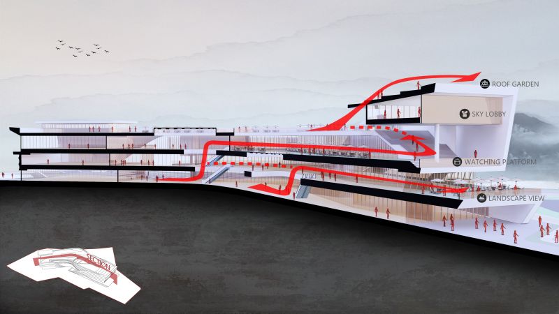 Spatially, Through a path connecting with different levels of roof garden and landscape platform(green terraces)to provide an array of public open spaces.