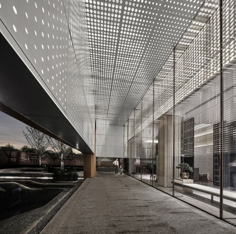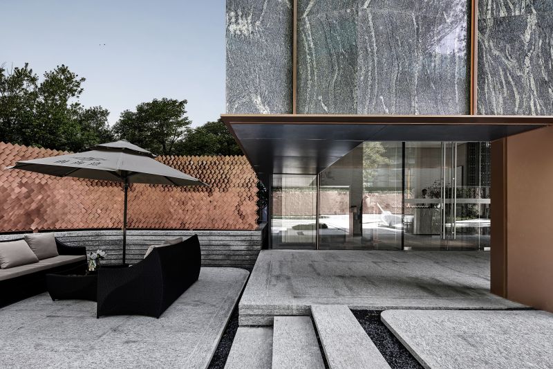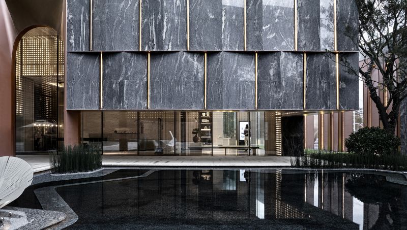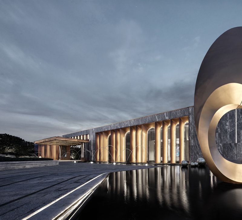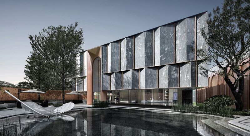 The architectural appearance adopts geometric and sculptural design languages. Arches are extracted and interpreted as its symbols, and exquisite metal lines are set at the boundaries of different surfaces to showcase a modern aesthetic. All the lines, whether convex or concave, add exquisiteness to the architecture and highlight the dynamic and flexible architectural form. The unique stone materials featuring blue gray hue and ink-wash-like patterns unify the simplistic visual effects of the entire building and also produce a sea island ambience which echoes the site.