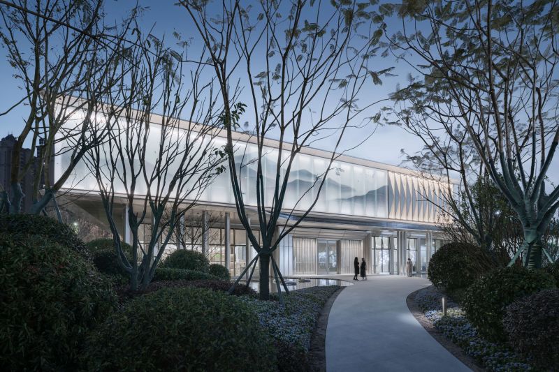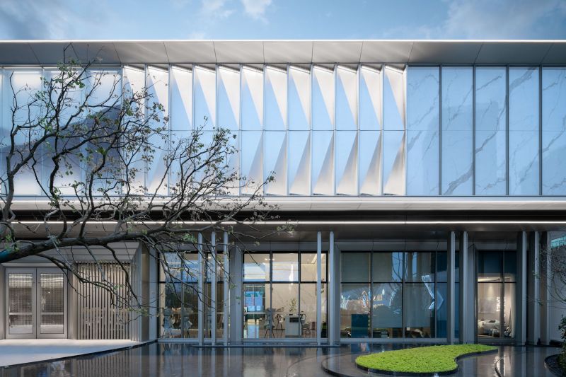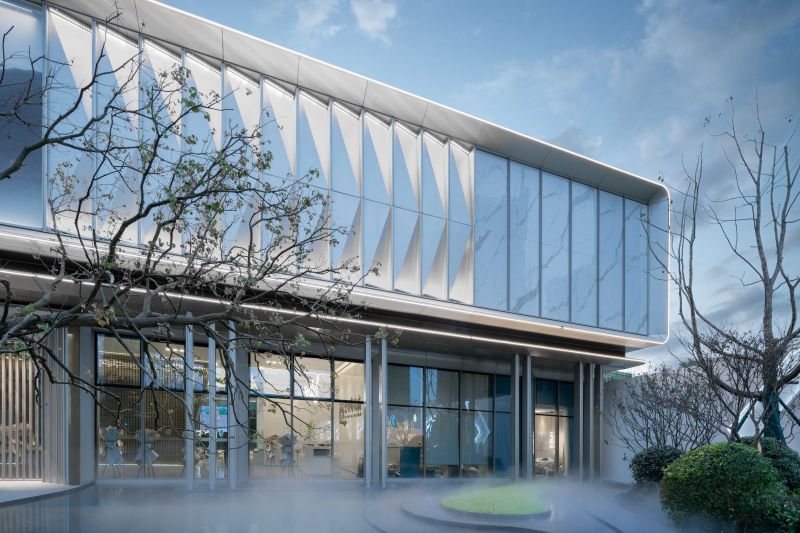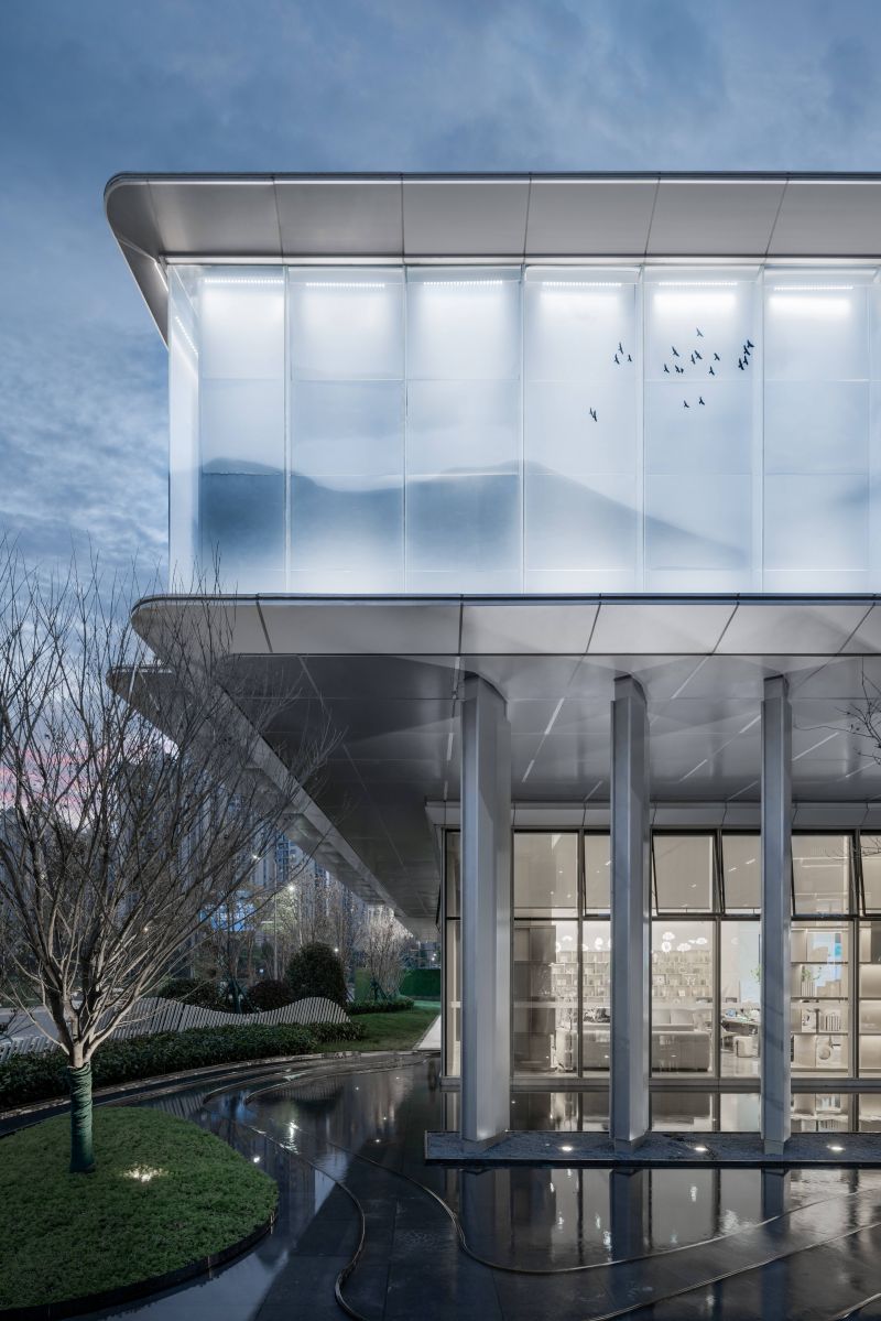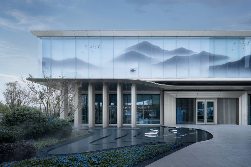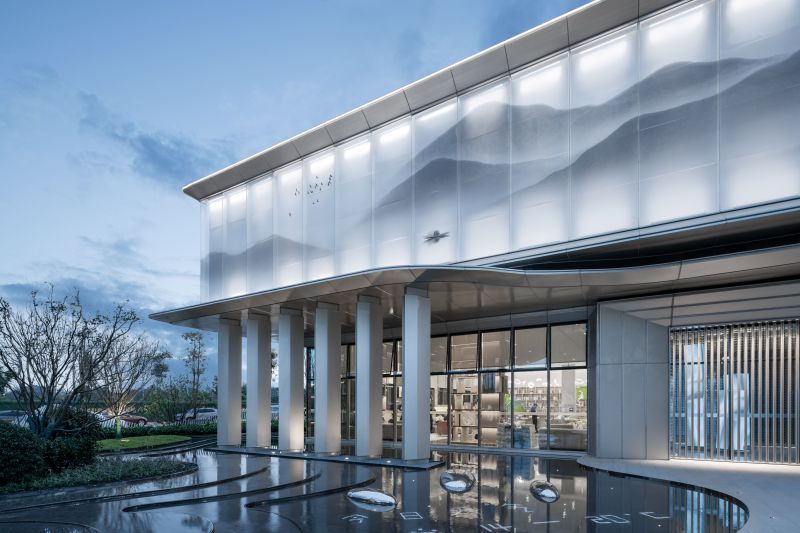 Adhering to the architectural design concept respecting regional, cultural, and epochal characteristics, the project draws semitransparent landscape paintings with traditional Chinese style on glass curtain walls to display classical aesthetics by means of modern techniques.The entire external facade of the experience center is mainly covered by champagne silver aluminum plates to build a graceful and noble building. On the second floor, ultra-clear silk glass printed with landscape paintings and backed by silver-gray aluminum plates are used to create a beautiful landscape roll.