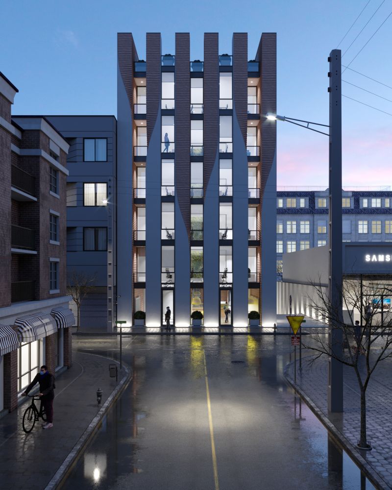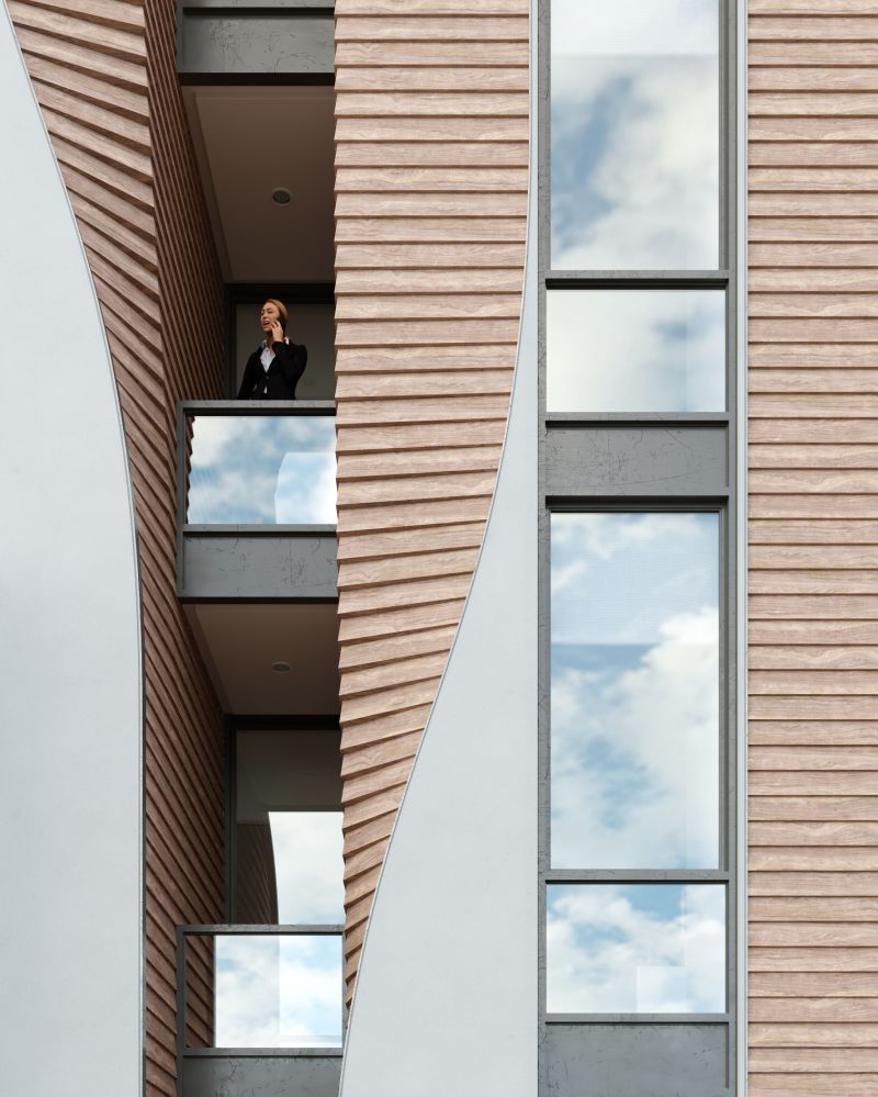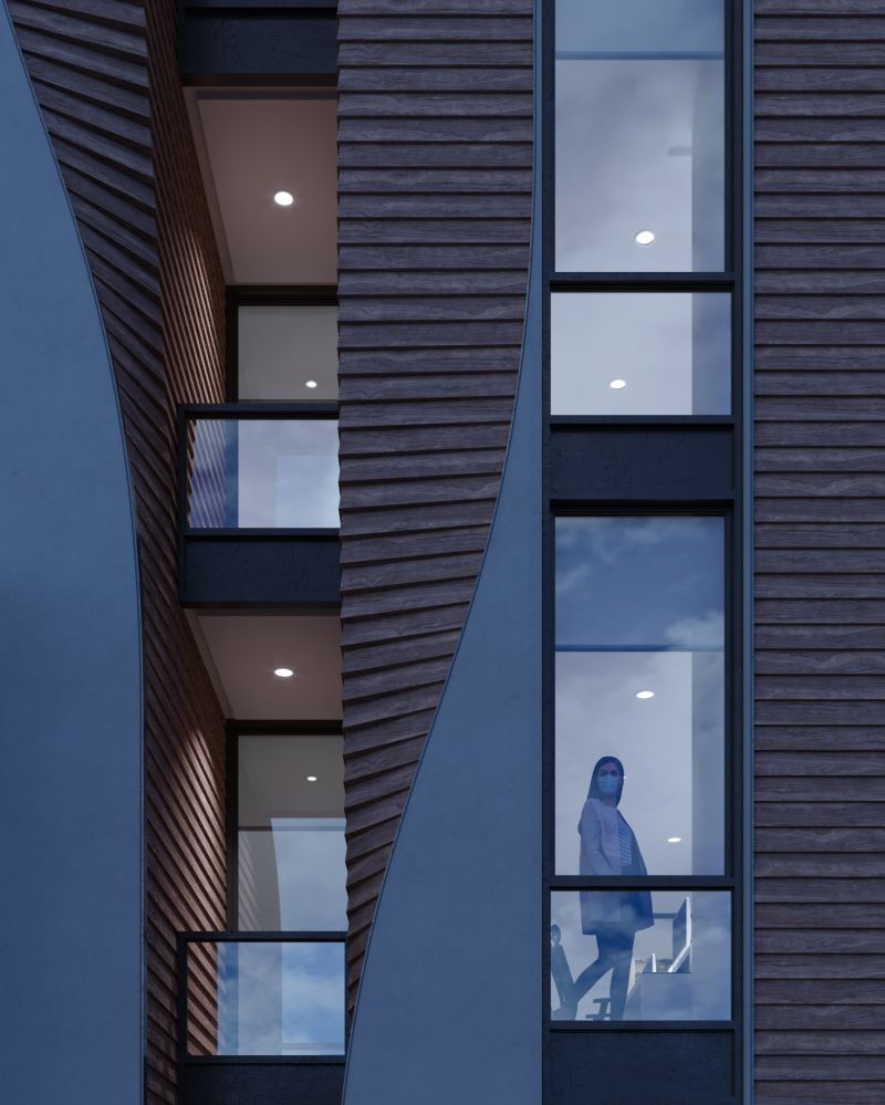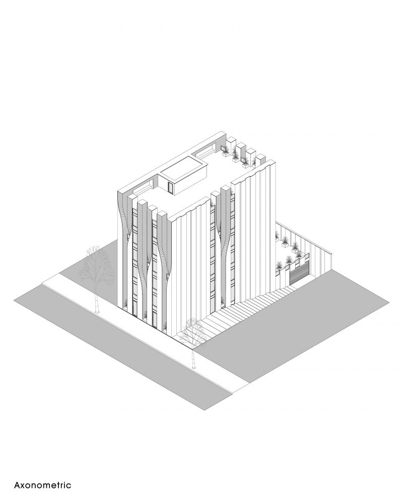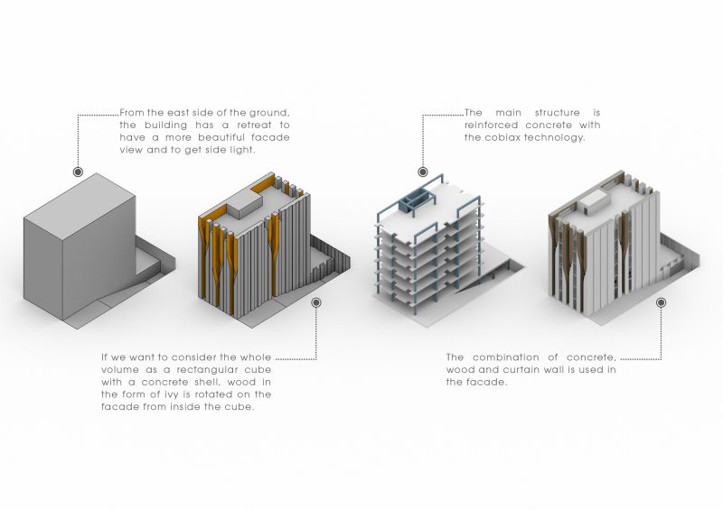 Office building as a second home is an issue that I want to mention it. In the design of Ivy office building, by considering the presence of users in their working place in most hours of the day, I have achieved a different quality. Design of this building delivers an environmental concept to the observer. Located in a site of 620 m2. If we want to consider the whole volume as a rectangular cube with a concrete shell, wood in the form of ivy is rotated on the façade from inside the cube. The combination of concrete, wood and curtain wall is used in the façade.