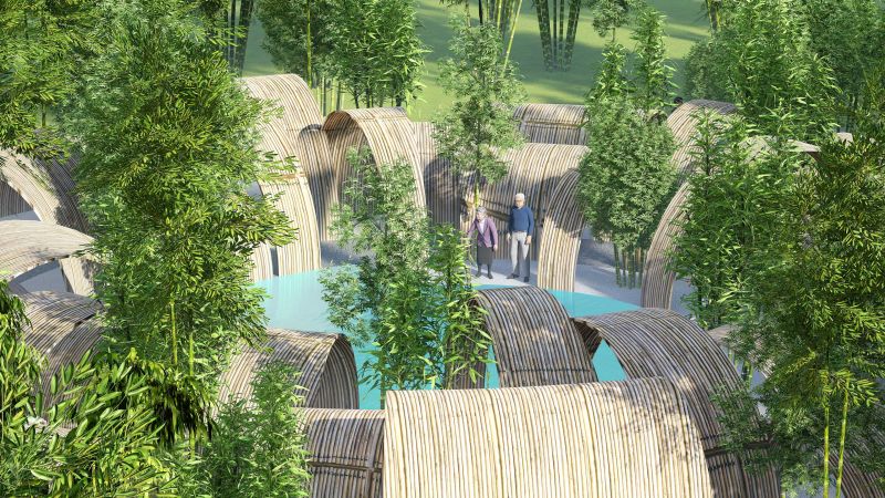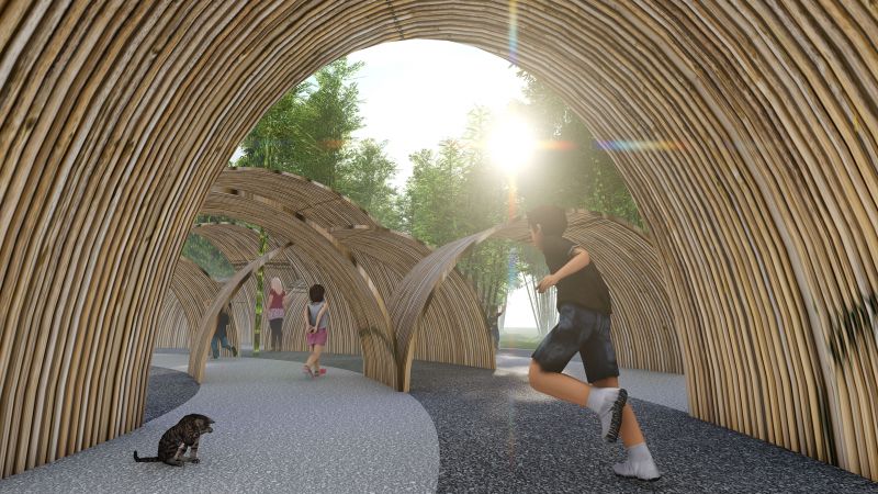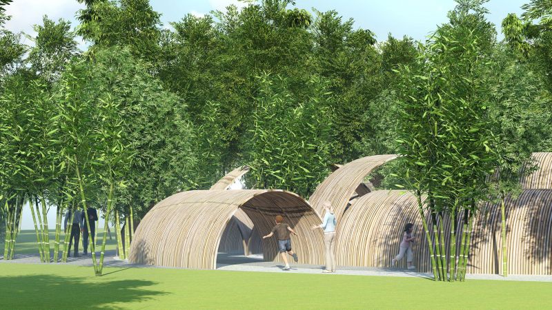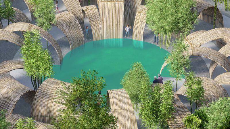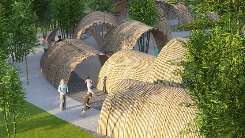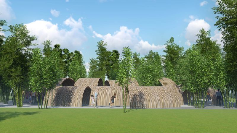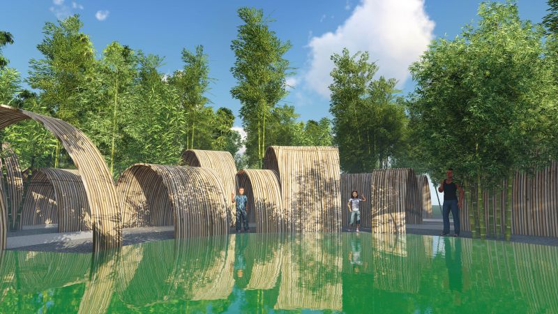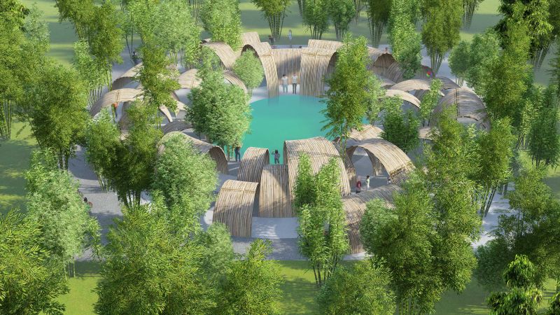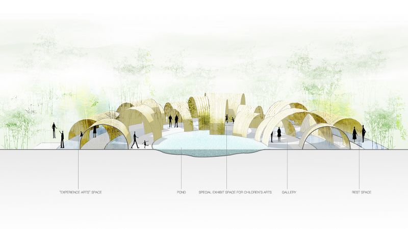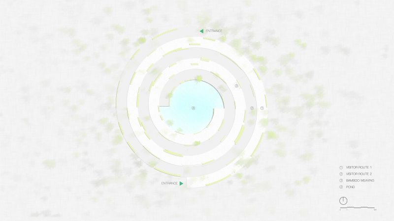 In the Shunan Bamboo Forrest in Sichuan of China, is there a unique geological landscape called Gem Lakes, which are small blue ponds formed by underground water containing copper sulfate. The site is right by a small Gem Lake in a bamboo forest around the village. Our client wants to donate a community center to host a variety of local cultural events. In this project, building disappears and nature reveals. Our primary strategy is to lead life into natural field by hand-making a bamboo building in its original way, where intersected arches generate a garden of forking paths.