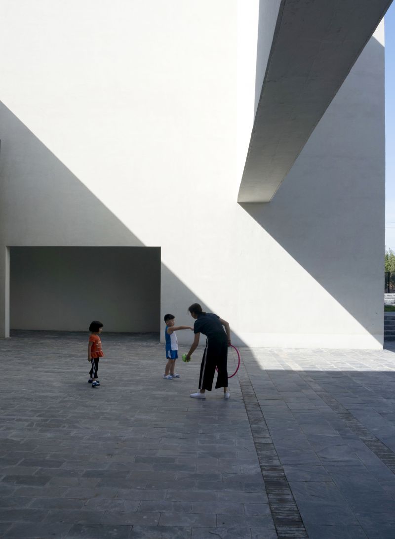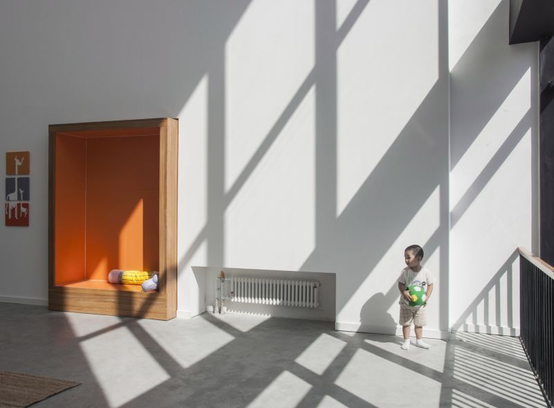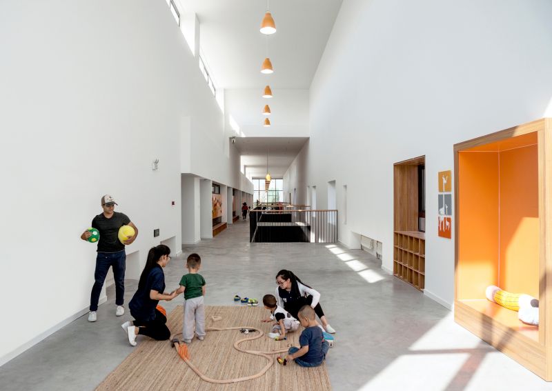 Instead of using small corridors to connect all the classrooms, we proposed a 6m-wide-and-80m-long space that connects all the classrooms across three levels and functions as an indoor playground and learning spaces. In this linear multi-purpose indoor playground, children play, dance, ride bicycles, crawl, sit and read. Circulation spaces are no longer mere spaces of passages, but have become spaces for learning, playing and communication.