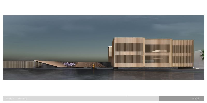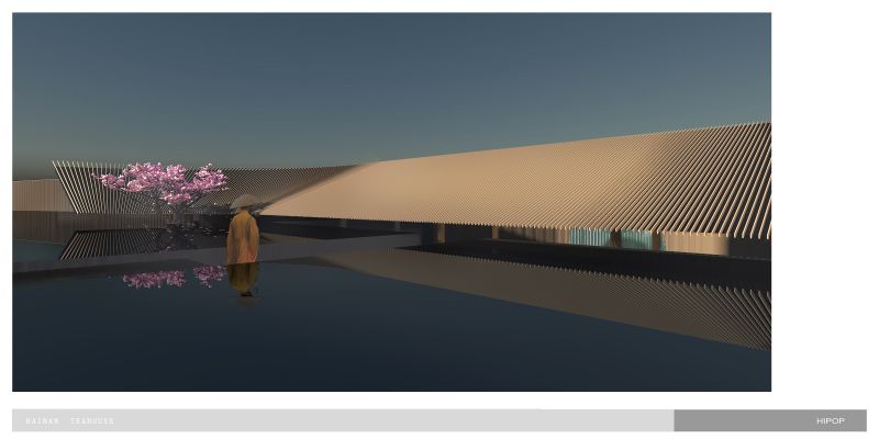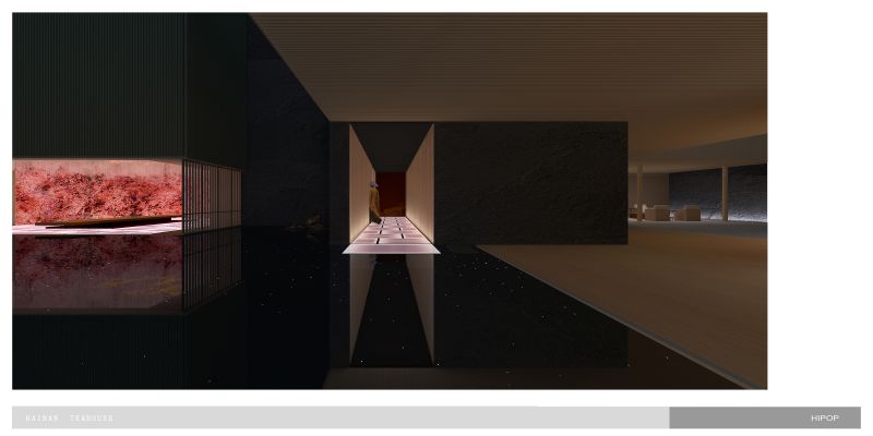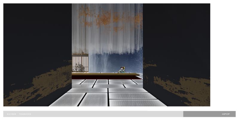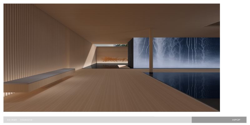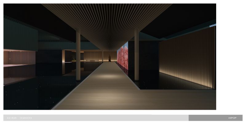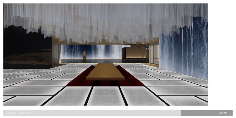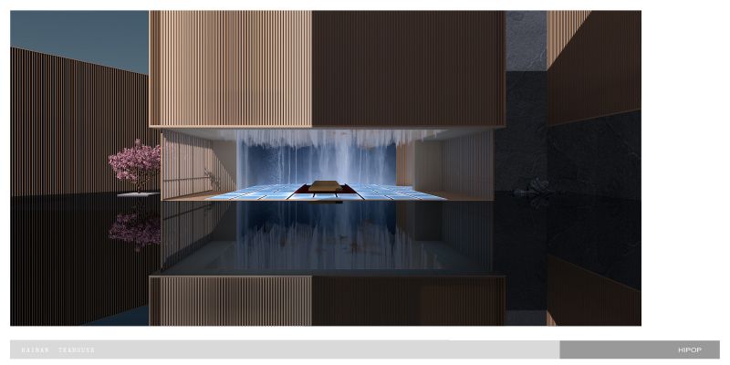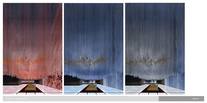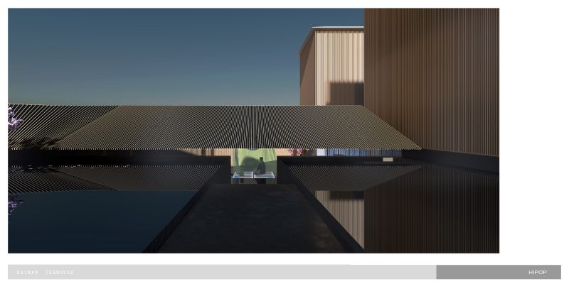 we sink the teahouse on the underground, which gives up better natural lighting to the living areas on the ground and first floor, yet gets more freedom to control the light and atmosphere inside of the teahouse.Circulation fully interacts with the water trail. Traverse the low-hanging and secrete entrance, we stand on a deep dark water and the underwater light source give it a starry sky feeling that carries the tea tasters to enter the rooms. The main tearoom is 3 levels void which also has a glass roof beneath the top floor pool.we correct the light with silk cloth and floating metal leaves