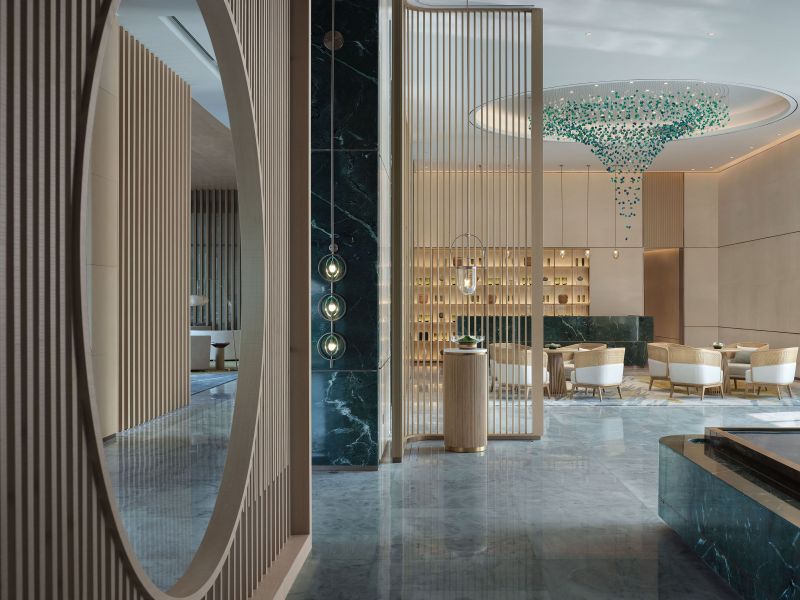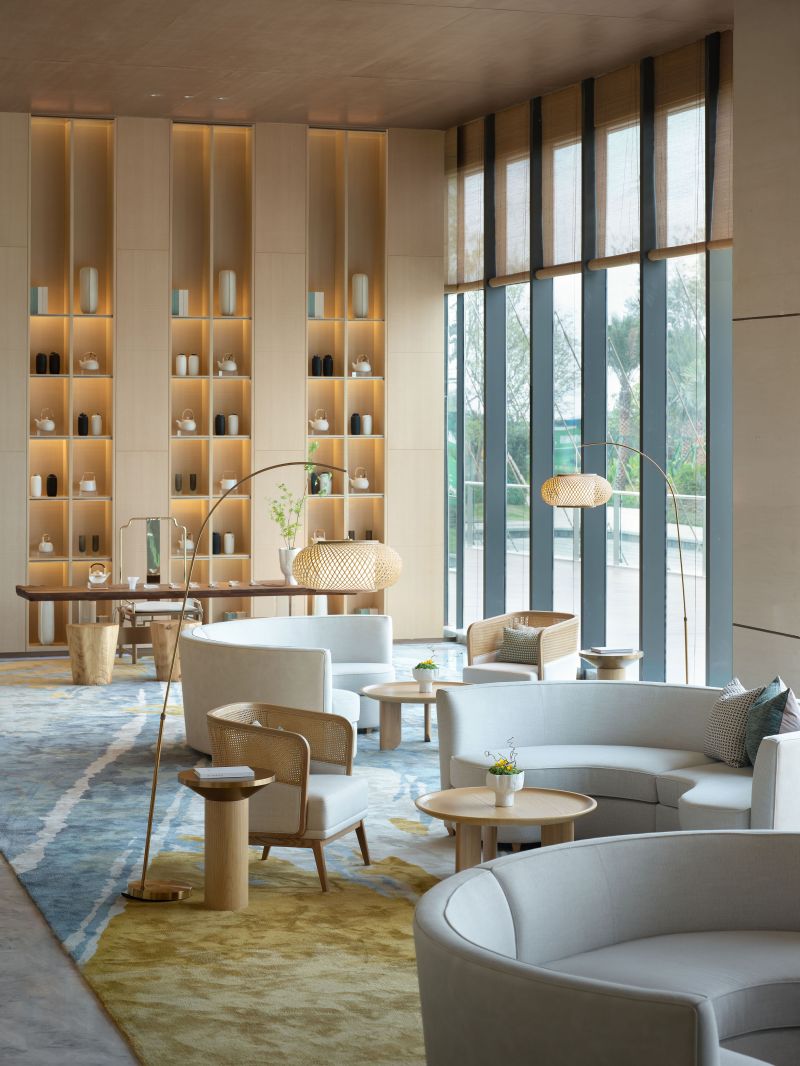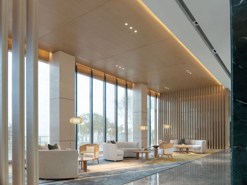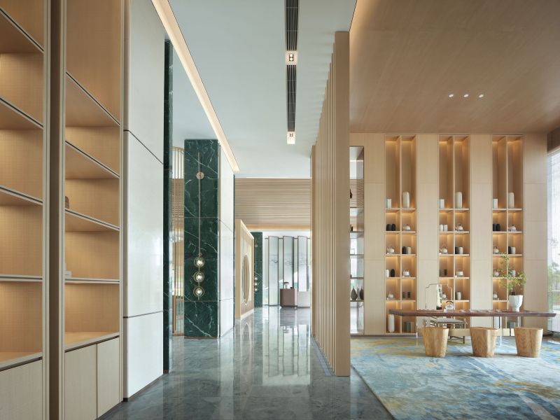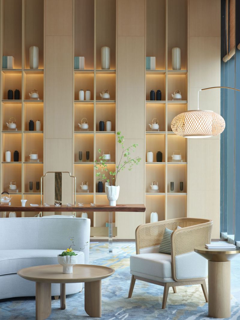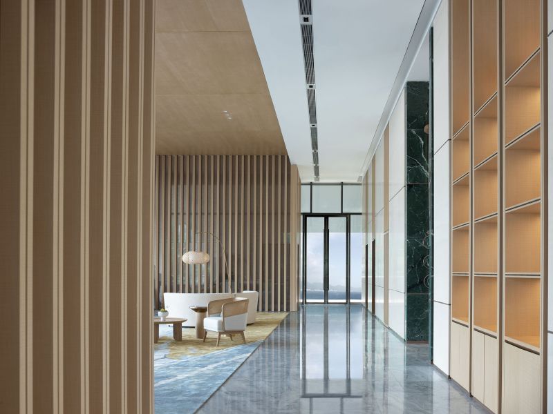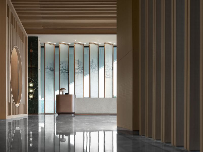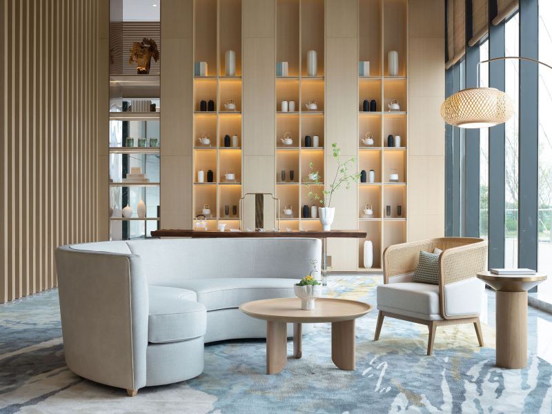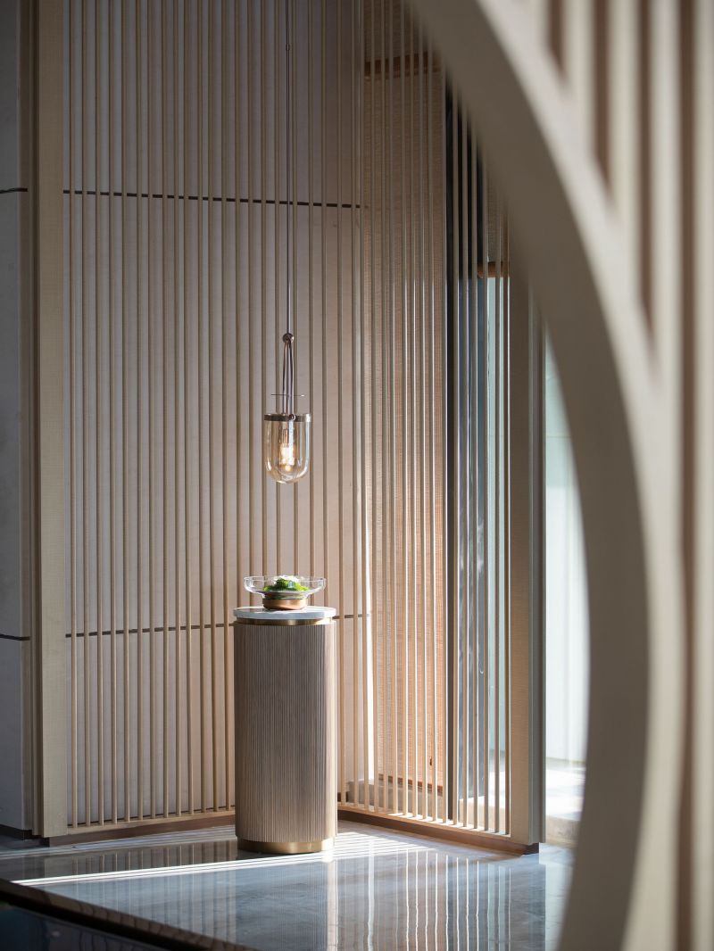 By taking inspiration from nature, the circle expresses the universe and creation, and pursues the extreme beauty of high simplicity and modern technology. The combination of natural wood color and outdoor scenery forms a balanced aesthetic feeling of slight warmth in the space.