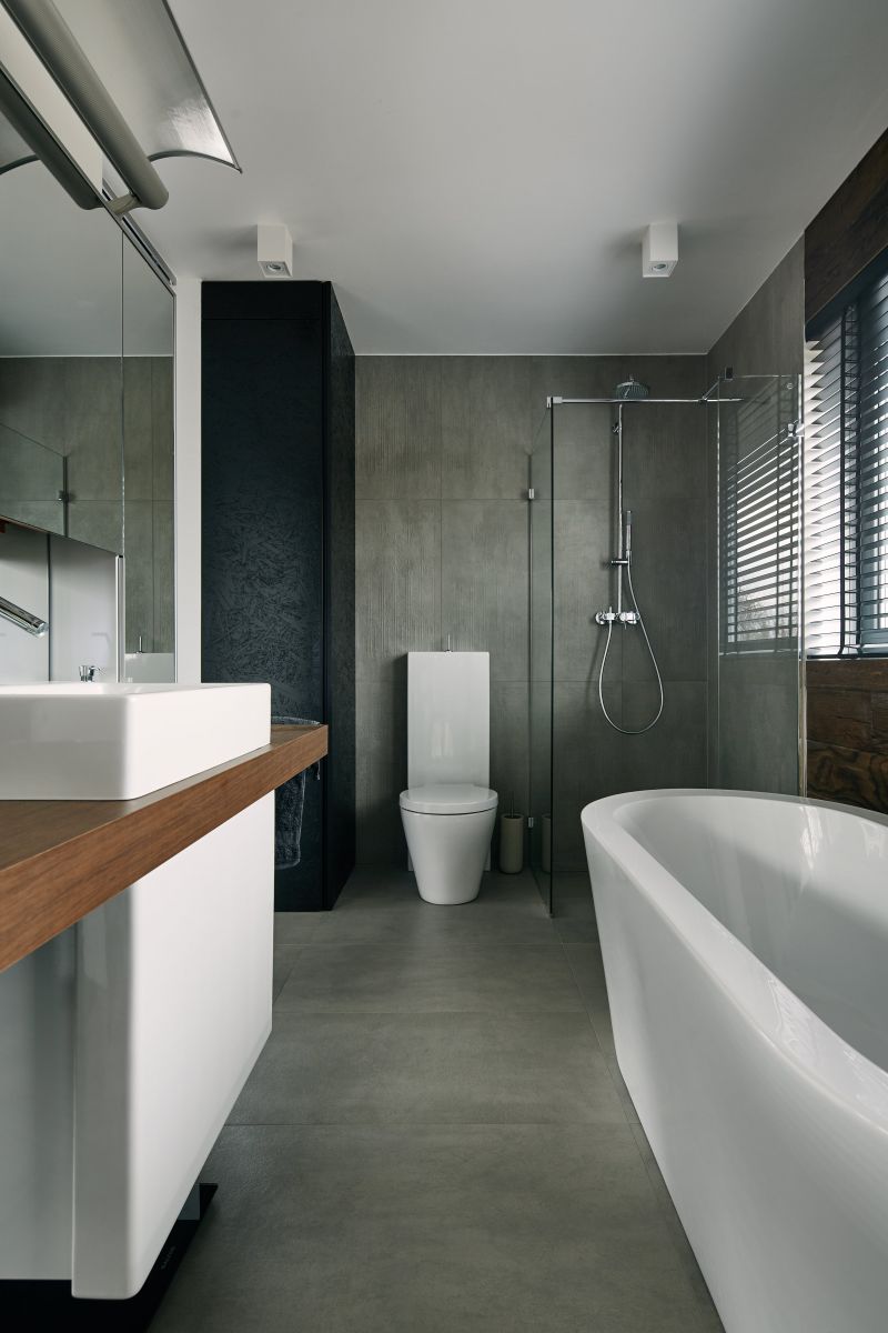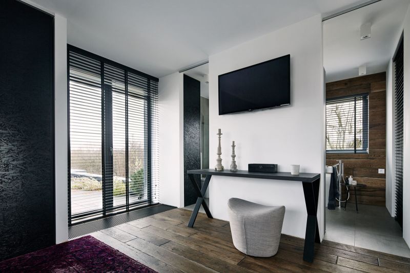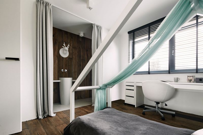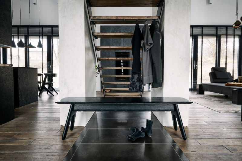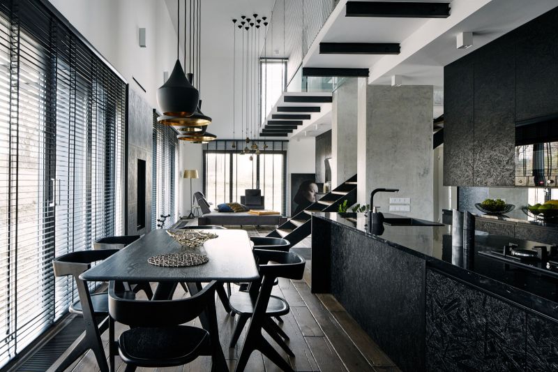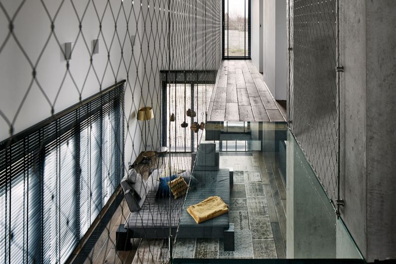 The peculiar house.Both the shape and interior of the house were created in the spirit of family integration.The initial idea of the project wasn't a building's shape but the interior of the house.The most important thing was the space and light coming in all day from east to west.The ground-floor is a roomy space open to two floors for family daily life and two studies.A stairs in the middle of the House leads to a mezzanine with three bedrooms with bathing annexes.Interiors are permeated with natural materials and limited range of colours.Most of the furniture is the architect's own designs.