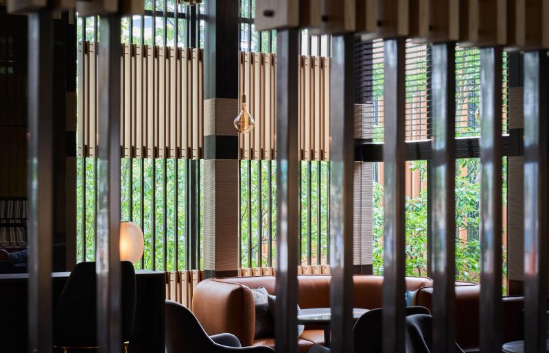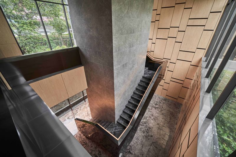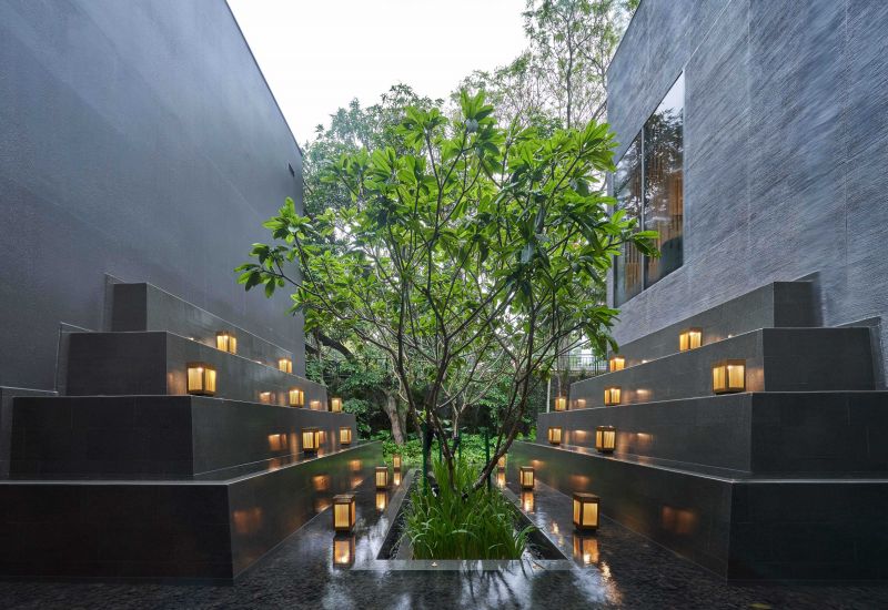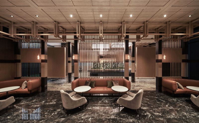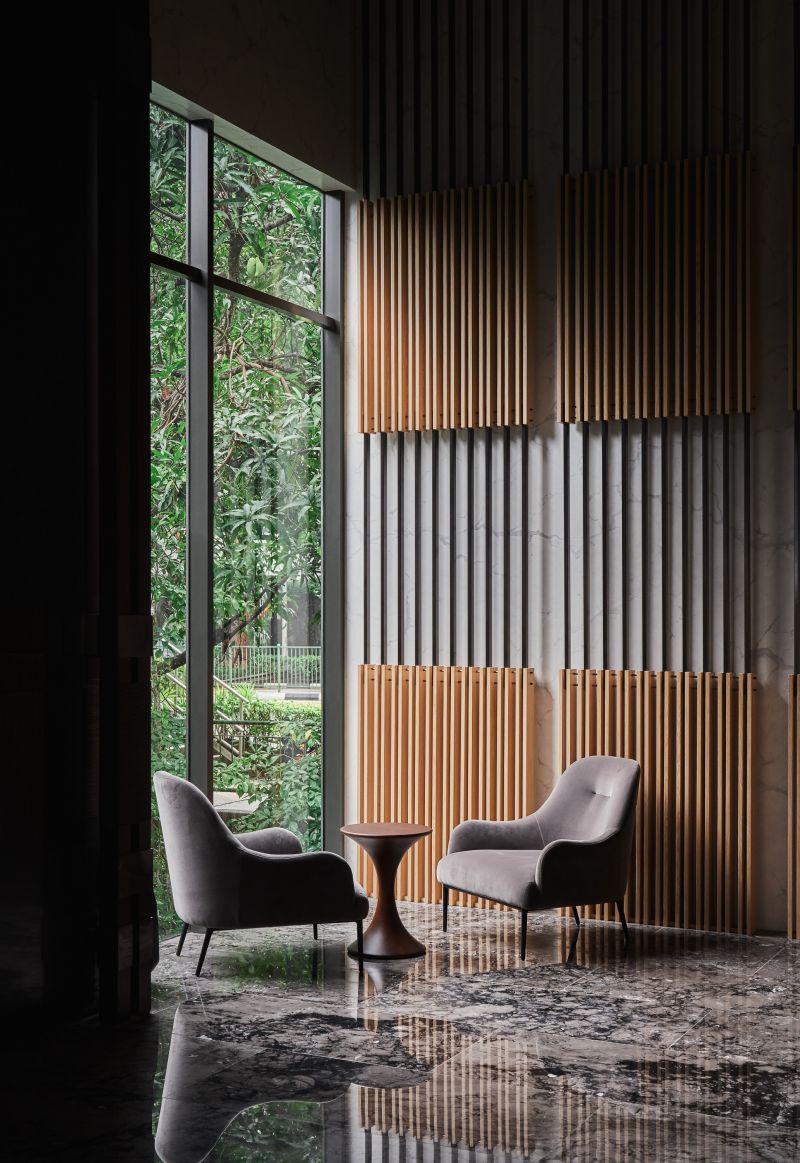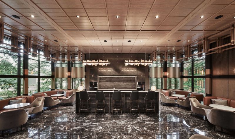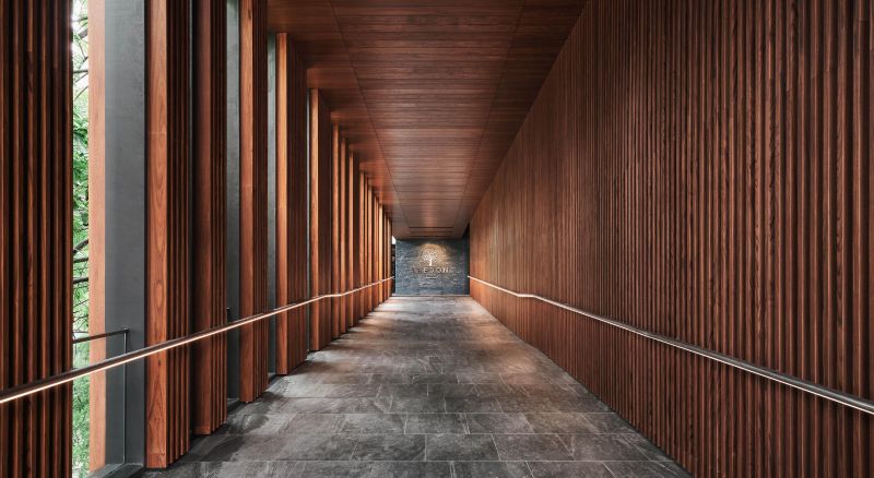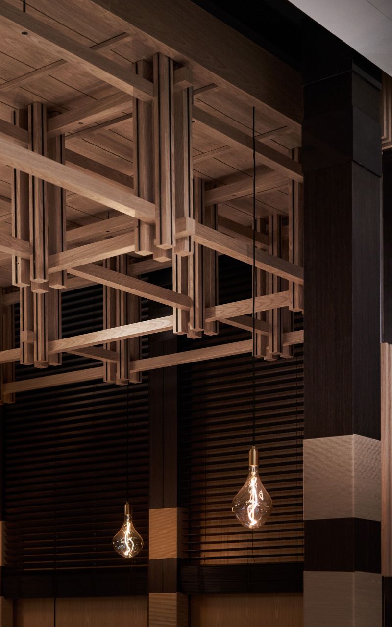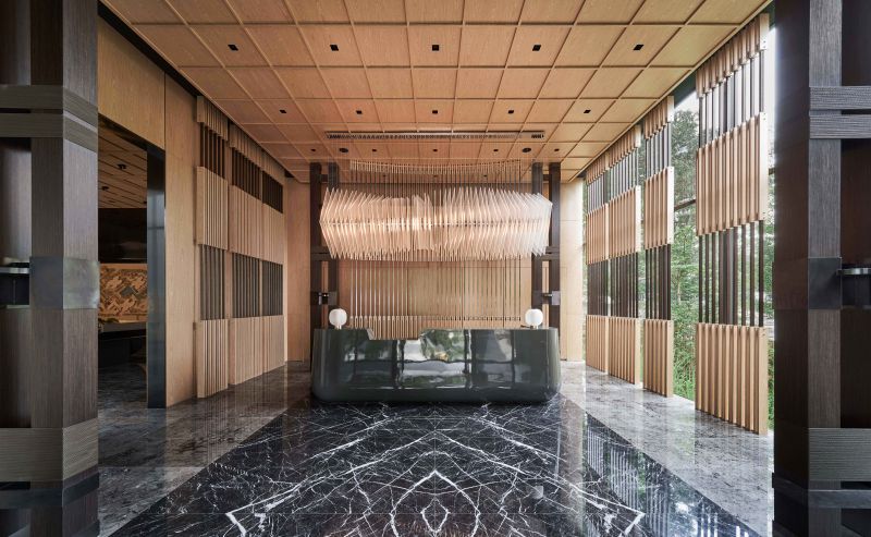 To celebrate the distinctive conceptualized tree house architectural form, the interior wooden feature with refined details, highlighted with deliberately selected furniture, creates a strong connection with the surrounding natural elements. Colors and tactility of the materials are also important composition of a calm resort-like atmosphere. The reception hanging feature is a conceptualized representation of the movement of nature when catches wind. Details of the interlocking ceiling feature together with the splendid lighting fixture adds on a luxurious touch to the spatial quality.