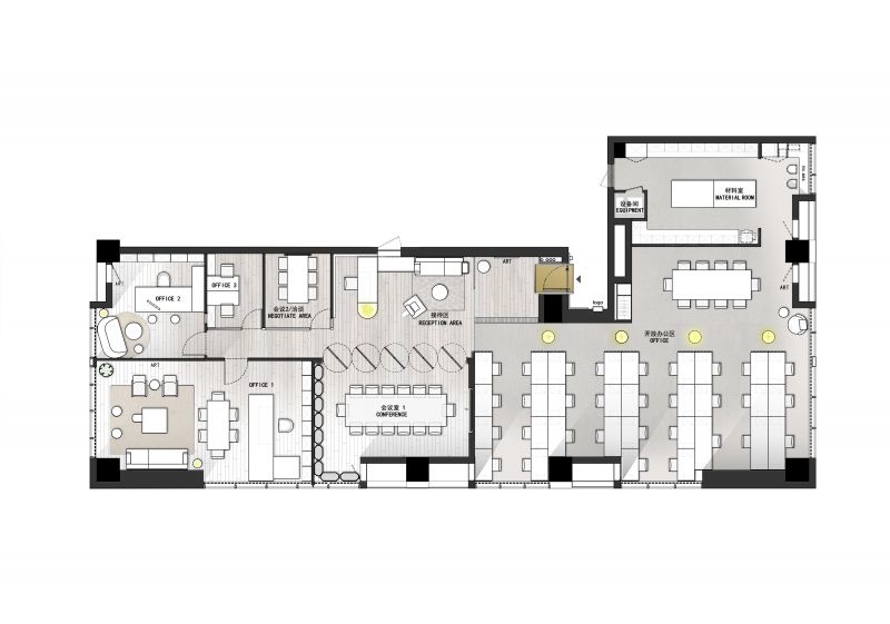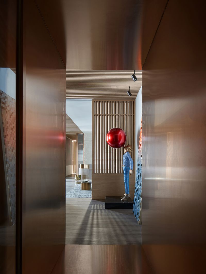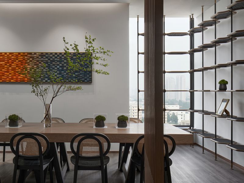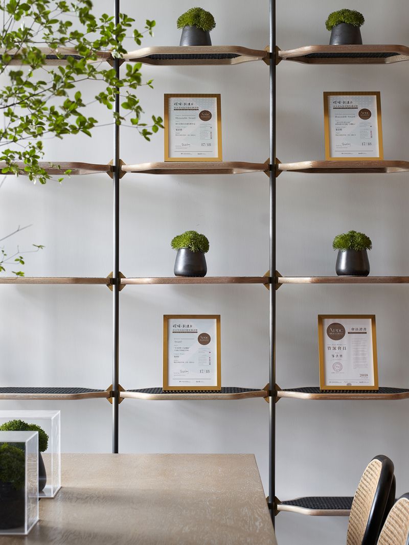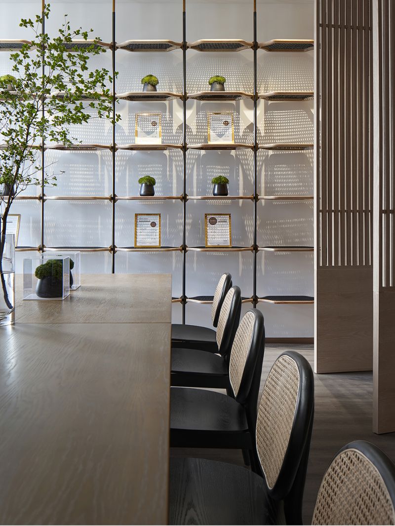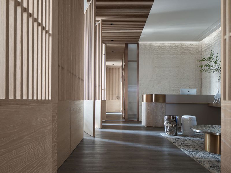 Through the ancient copper steel plate to create a deep mysterious entrance, wooden grille and surrounded hallway through the light to show the light called the light box, through the grille to keep the office space independence and development.