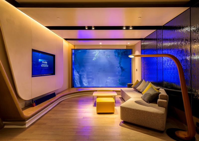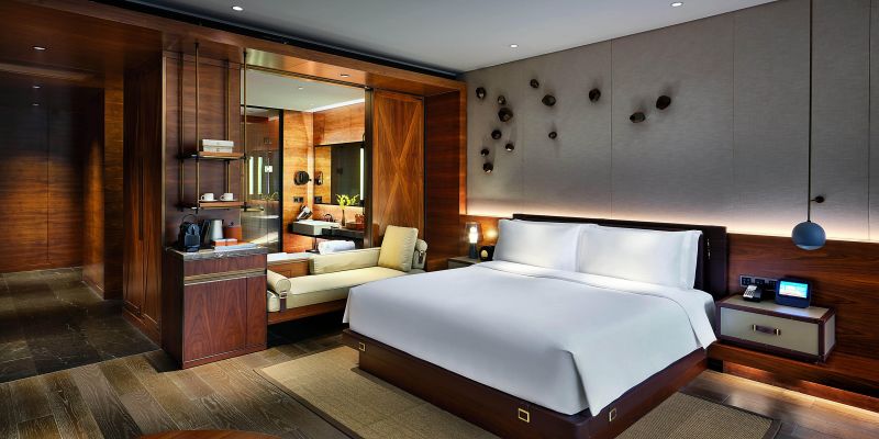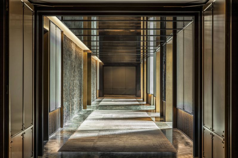 InterContinental Shanghai Wonderland Hotel has been constructed inside an abandoned quarry. As to better fit into the surrounding environment, the inte-rior design of the hotel has applied ‘Aesthetics of Mining ’concept as reference, combining the wild rocks and vertical cliffs with the natural environment, creating a new conceptualized hospitality culture that only belongs to the InterContinental Shanghai Won-derland Hotel.