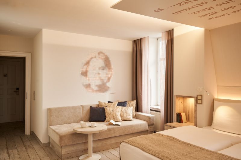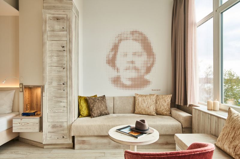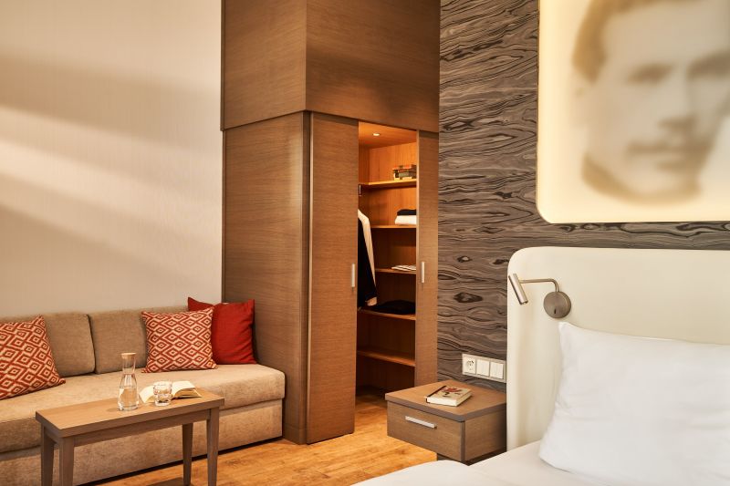 As Gorky and Tolstoi wrote some of their world-famous books there,I took their portraits and imprinted them in a pixel-like fashion on wallpaper in the rooms. Their quotes are also printed on the suspended ceilings above the bed. In the other hotel,their portraits appear behind semi-transparent materials behind the bed.
