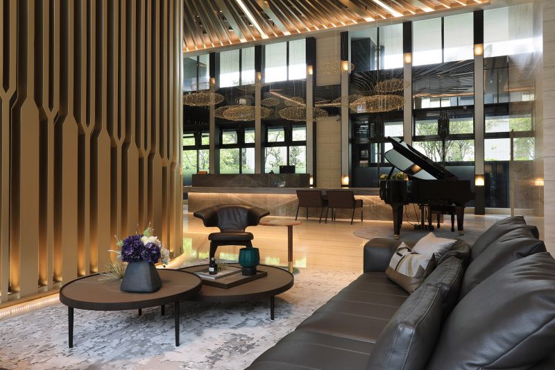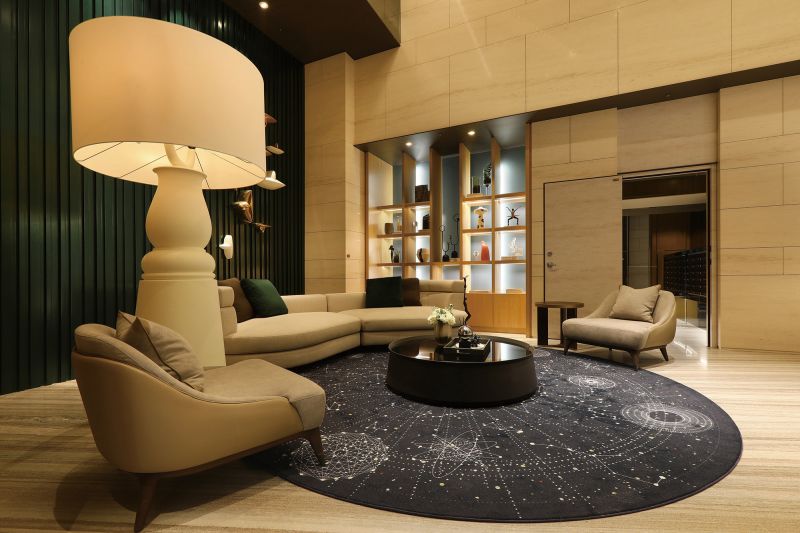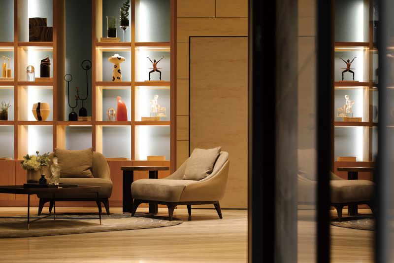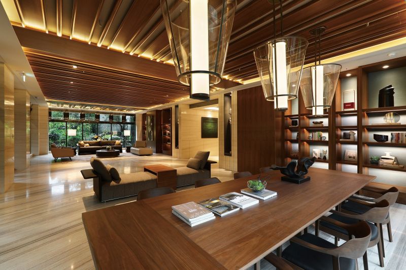 At the lobby center, the installation of an old tree reaches from the ground up to the ceiling in a grand presence, symbolizing a link of all households that share the building.
