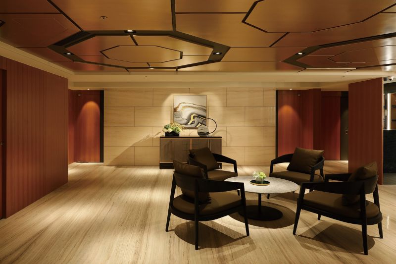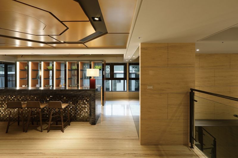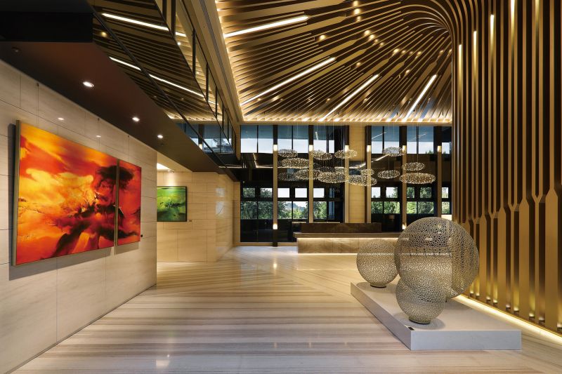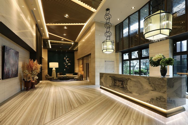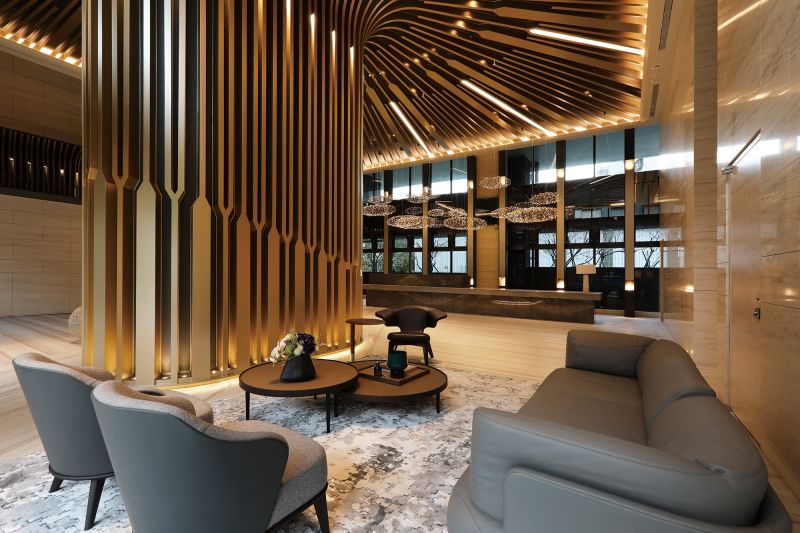 The reception desk in the second hall is decorated with the oriental landscape painting, and the glass was designed with rings of ripples that glow as water waves under sunlight.