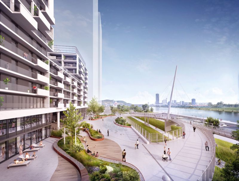 The project with around 500 high-quality residential units, with its location directly on the Danube, has excellent transport links and will also offer a number of extras for residents and the general public. So it is considered to implement a sustainable mobility concept as well as exclusive services such as concierge service and home cinema. The MARINA Deck also opens up the right bank of the Danube, which on the one hand opens up generous public open spaces and also makes an important contribution to urban development.