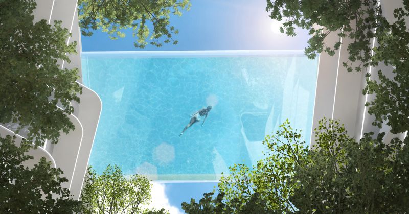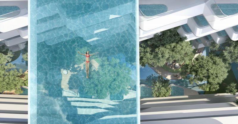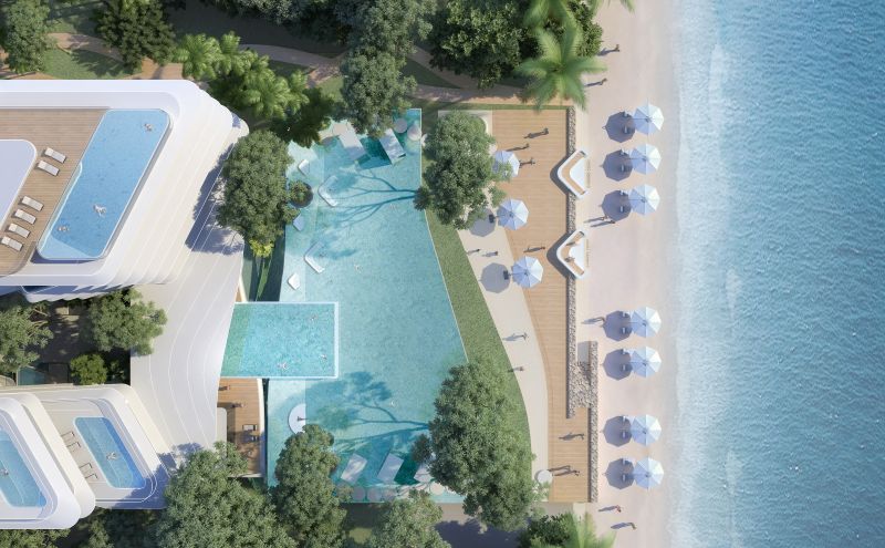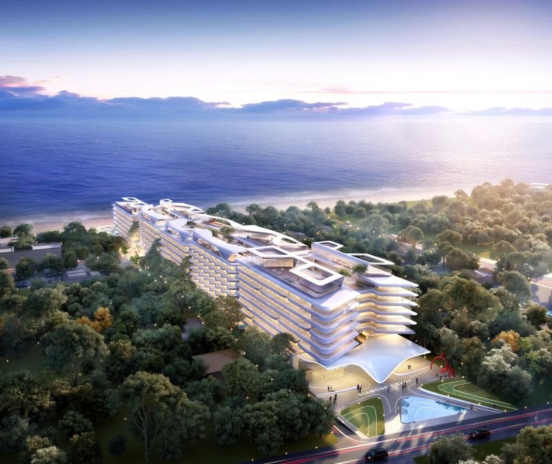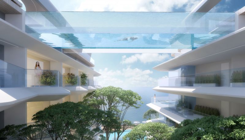 The project is a resort hotel that combines a private beach clubhouse and hotel apartments. The hotel apartments are tucked away in lush greenery. From the stepped-up rooftop pool and terrace one can look across or into the distance. The design uses transparent acrylic across the open views of the roof to create a infinity sky pool. The open space between the building blocks is designed to bring natural light and ventilation into the building interiors for health and energy efficiency purposes. The community gardens between the buildings provide an essential outdoor extension to resort living.