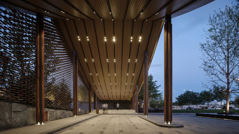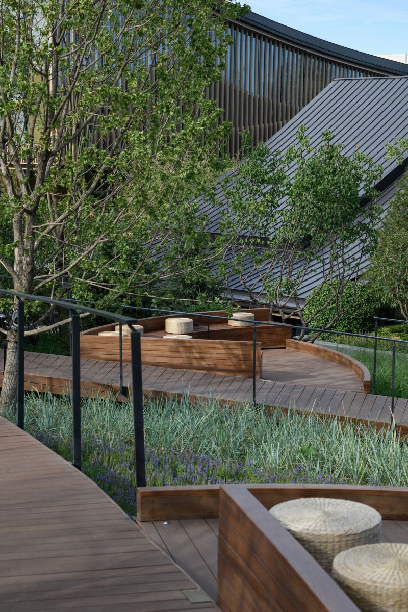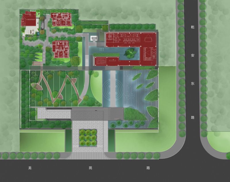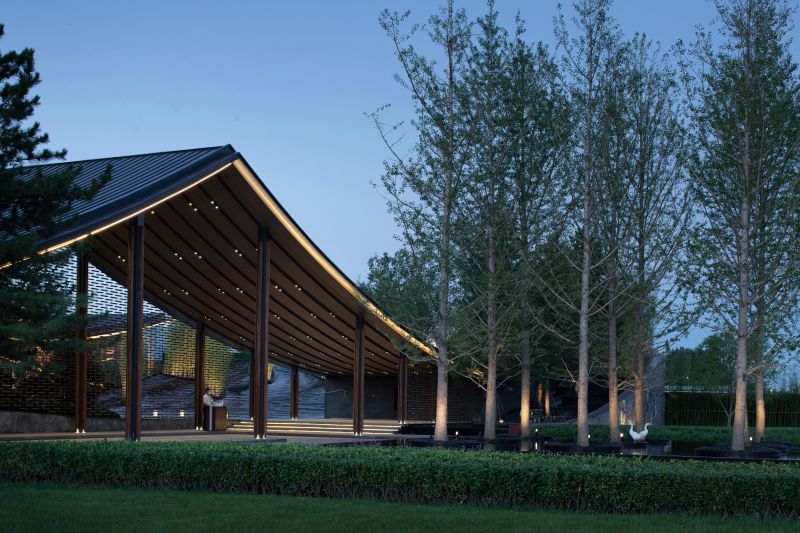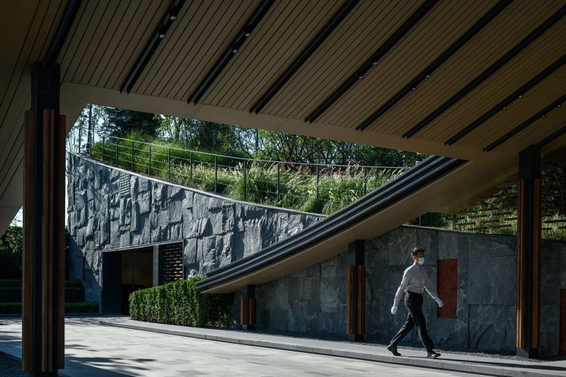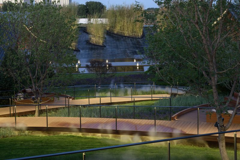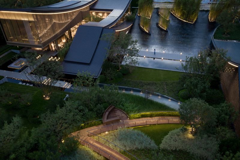 Zhongjian Chenlu is located in Shunyi District, Peking, surrounding by rich nature sources. The site is a square, with a better interface to the south. Different from the high-end Chinese style estate projects that are common in Peking, the design hopes to start from the feeling of space and give customers a brand new experience of Chinese Zen and rustic luxury.The landscape design continues to use the sloping roof element of architecture, choosing Earth Art as a design method to simulate and interpret nature landscape,to create a natural picture of undulating and lush green mountains.
