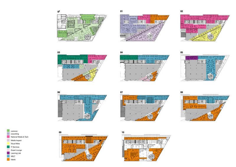 Axel Springer has launched a move from print to digital media. It's new building on the campus in Berlin acts both as a symbol and a tool in this transition - a building to lure the elite of (Germany’s) digital Bohemia. Bisected by a diagonal atrium that opens up to the existing Axel Springer buildings, the essence of the design is a series of terraced floors that together form a ‘valley’ that creates an informal stage at the centre - a place to broadcast ideas to other parts of the company.