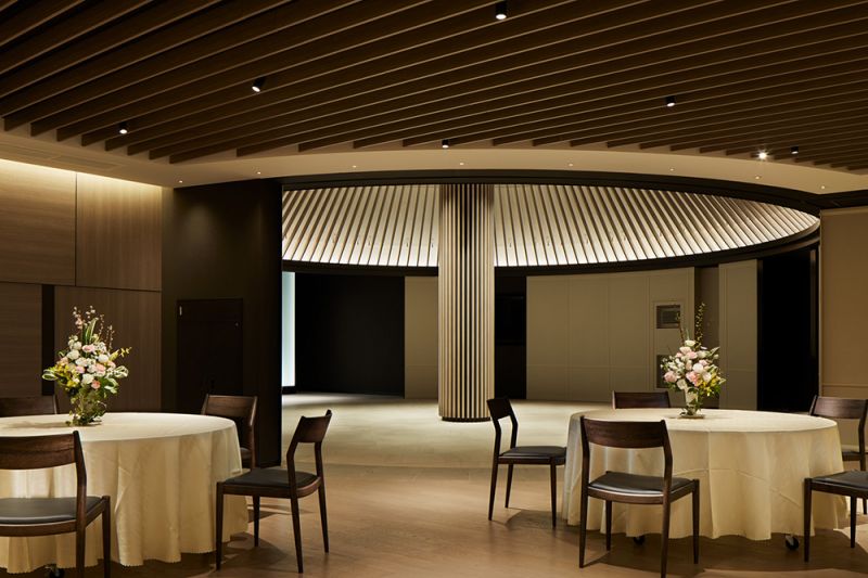 In the main hall with a high sky, a symbolic form was created by the design of the crossed wooden lattice with the motif of a Japanese umbrella on the ceiling. The sunlight leaking from that form creates various fleeting forms, and you can feel the beautiful light that matches the movement of your line of sight.