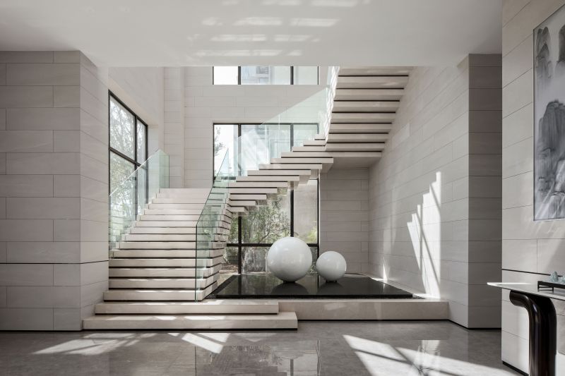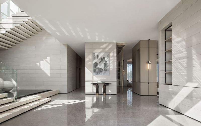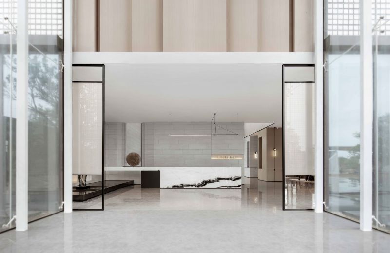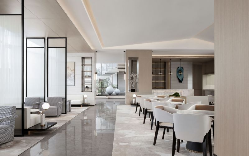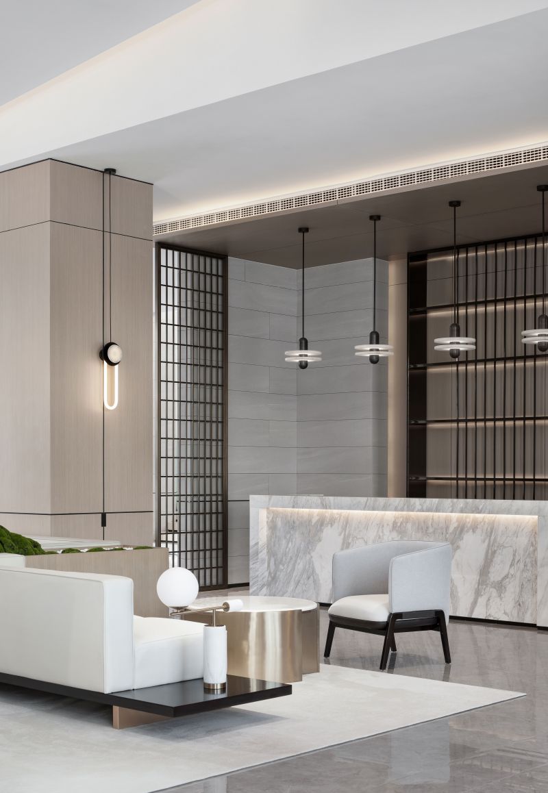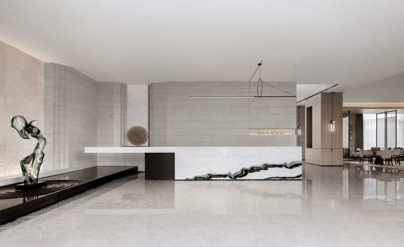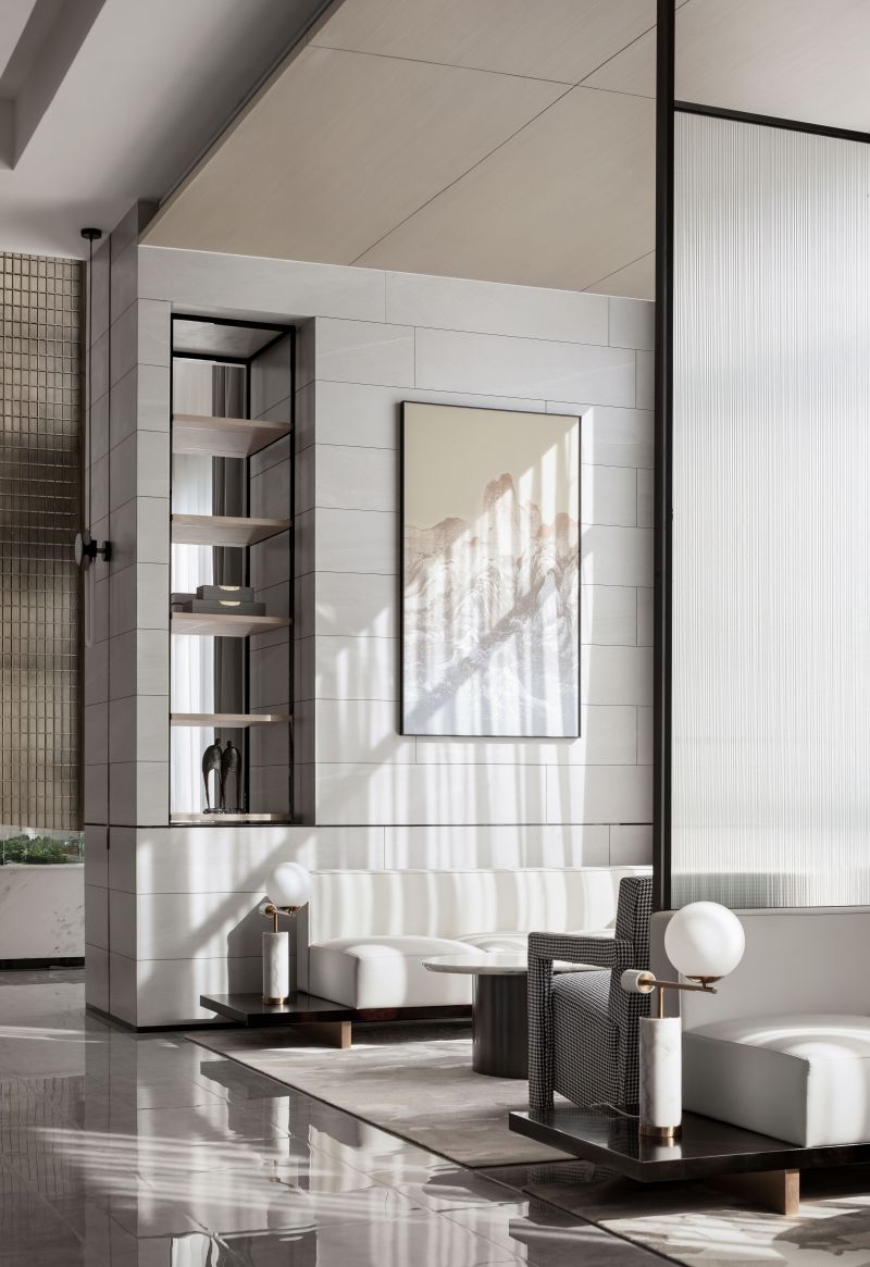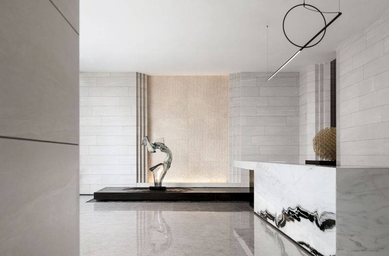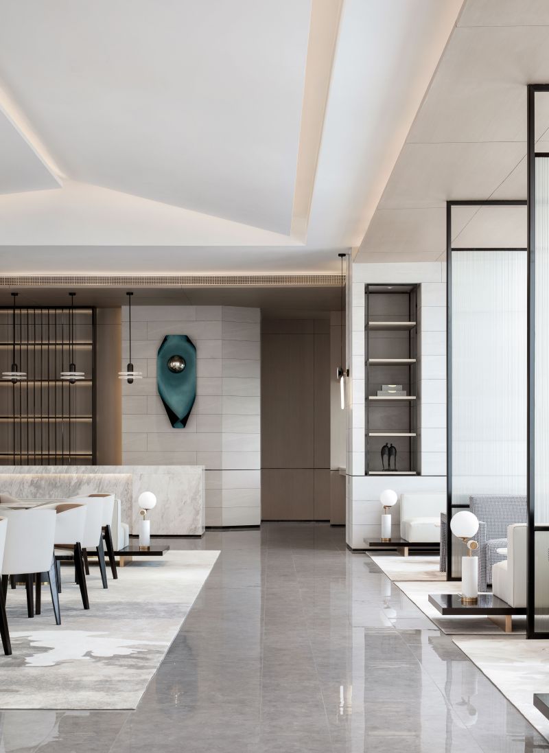 The circulations shift in a gentle manner. The glass sculpture at the reception foyer features a curved, organic form, which integrates with the geometric textures of the space. Its transparent texture reflects varying hues of the space. The whole sculpture is like a “fish” jumping out of water, leaving layers of ripples. Beside it is a round crisscrossed mortise-and-tenon art installation, which presents an abstract image of "moon" and shows the fusion of the real and virtual. With “clear water surface” reflecting the “moon”, the scene reveals a sense of art and a vibrant ambience.