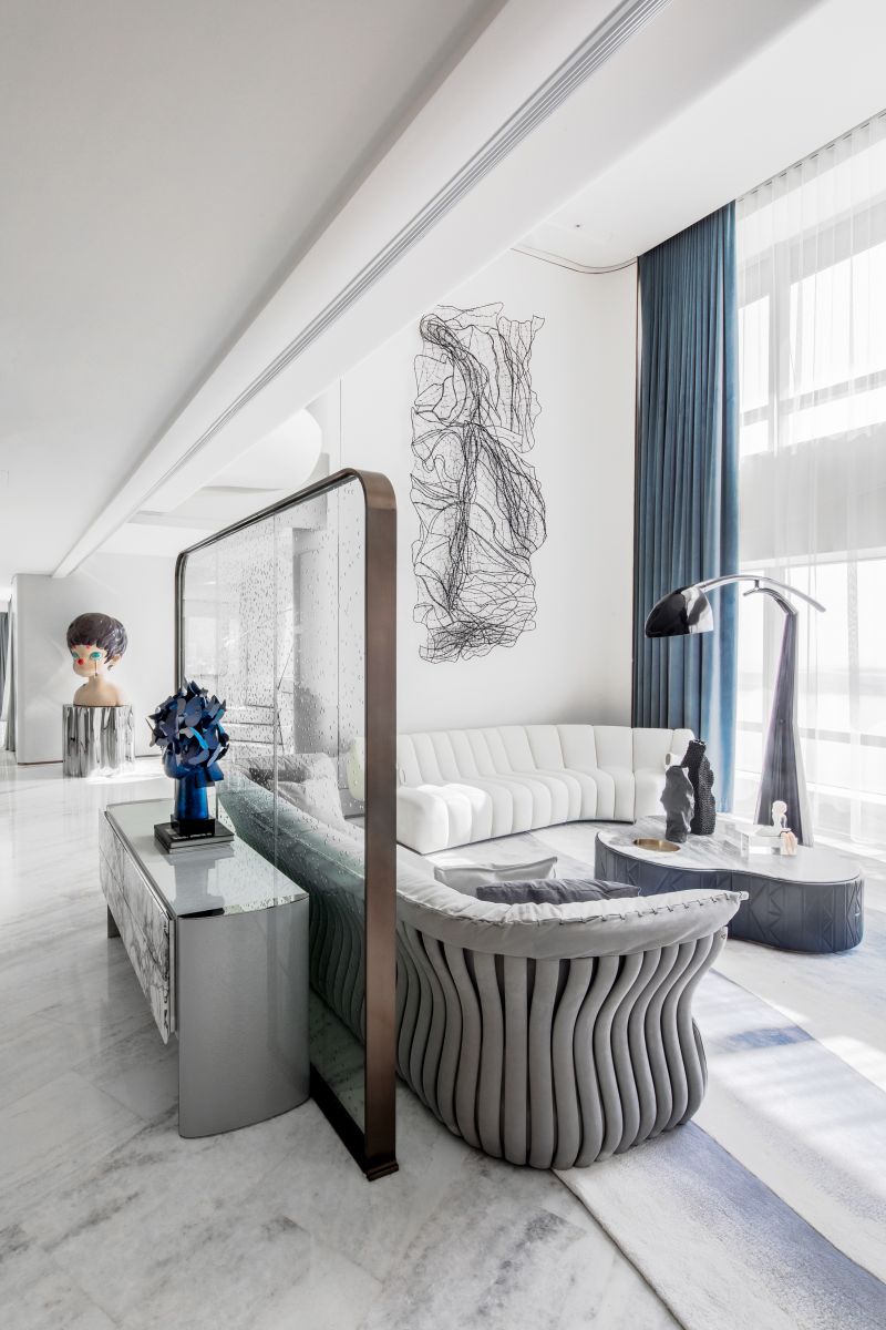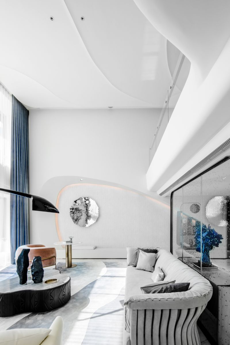 The seaside duplex apartment of Yanlord Marina Center is located in Zhuhai, a littoral city with developing potentials. As a representative of the city, the project merged both marine culture and oriental spirit into the spatial structure, which affected the design strategy of the interior. To dramatize the sea view, the structure, layout and functions were re-organized, hence creating various interactions between dwellers and the sea. What decorated the interior space are abstract patterns related to the sea, composing an ocean-themed poetic space, and echoing the architecture and city.