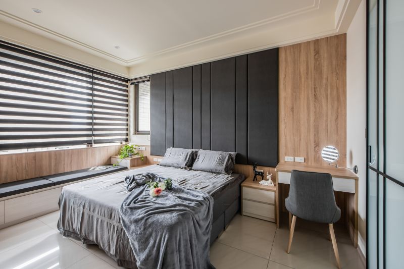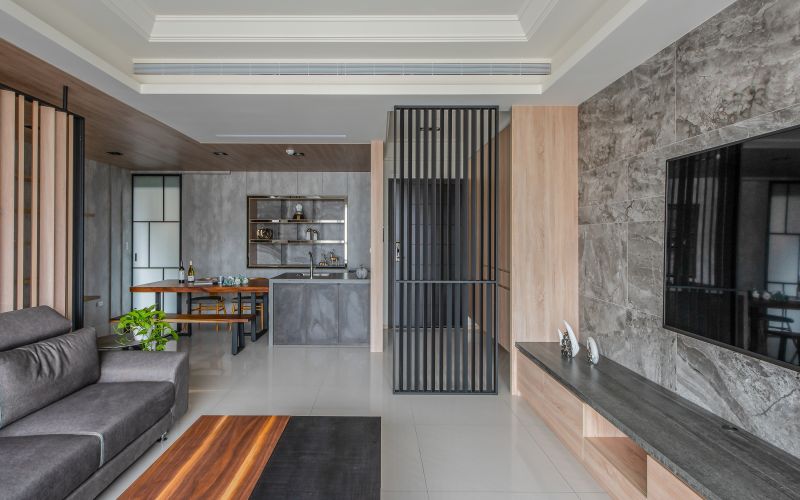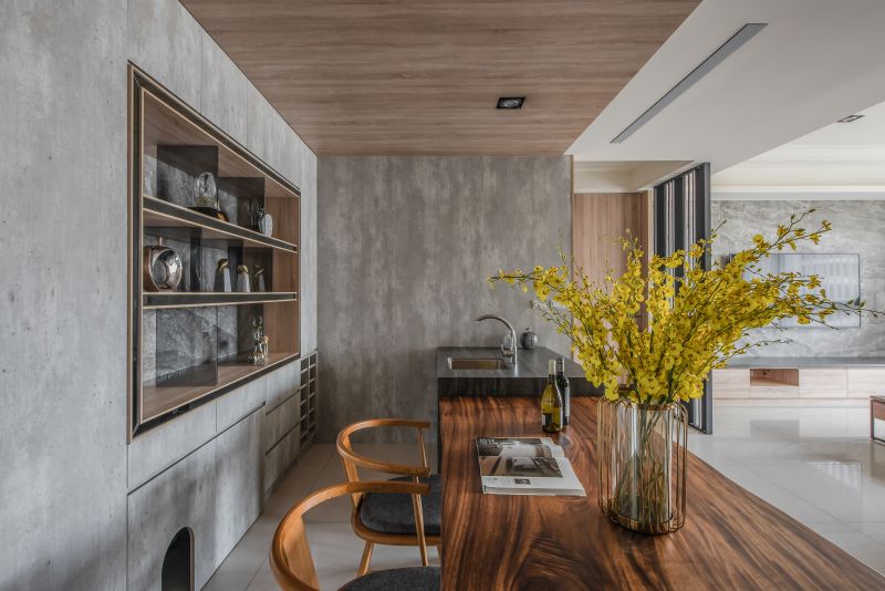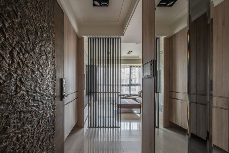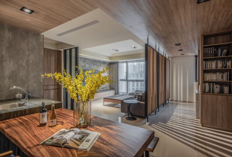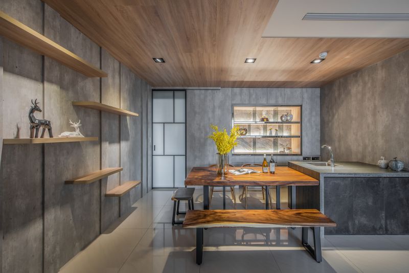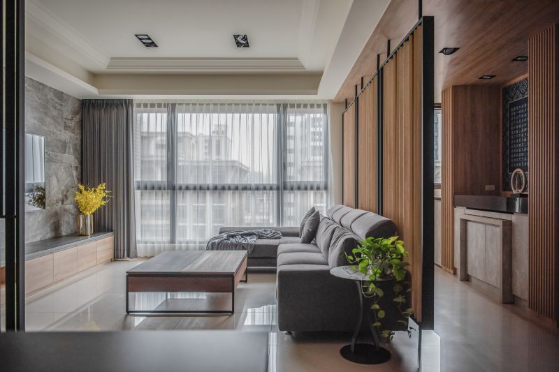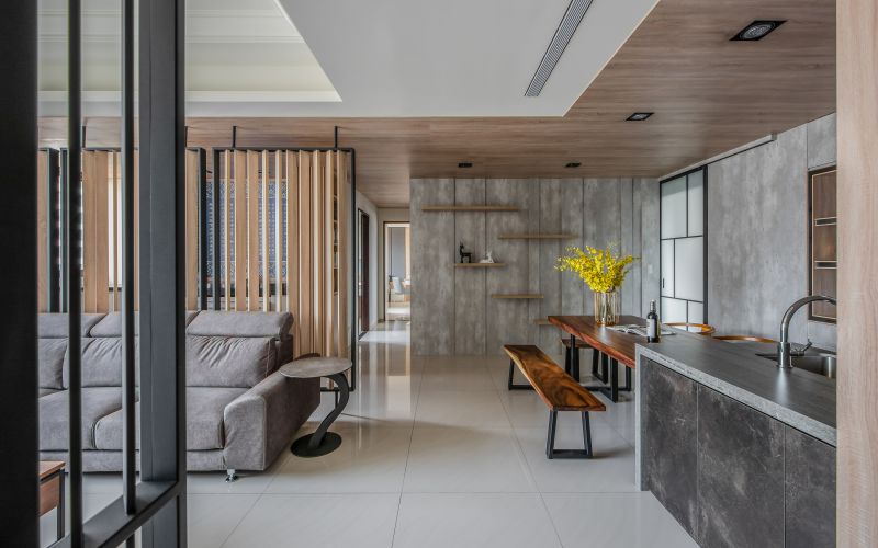 Take advantage of natural timber and stone grain to create the genial and rustic ambiance of Zen style, so that cater to the devout Buddhist couples. The plain and elegant furnishings of gray tone assort with delicate grilles greet the brilliant sunshine from the windows, and the visible-implicit scenes interflow beneath the light and shadow, marvelously indicate the wonderful serene times of a family of four and their two beloved cats.