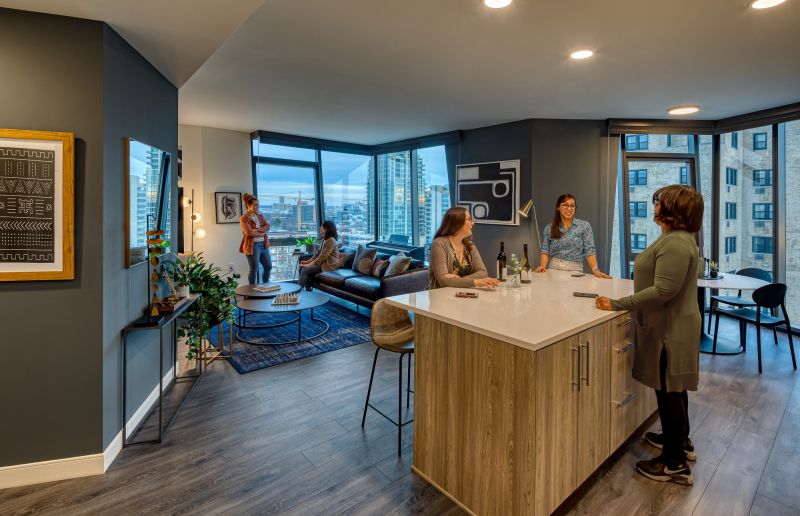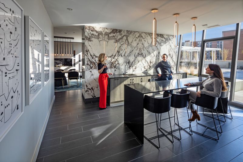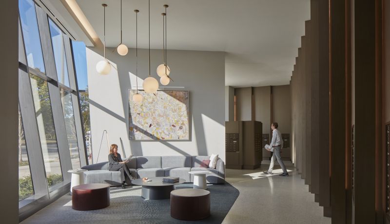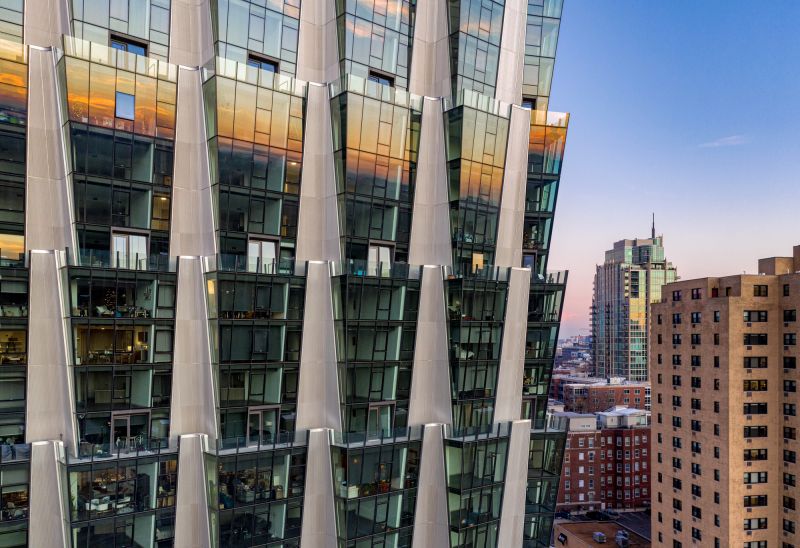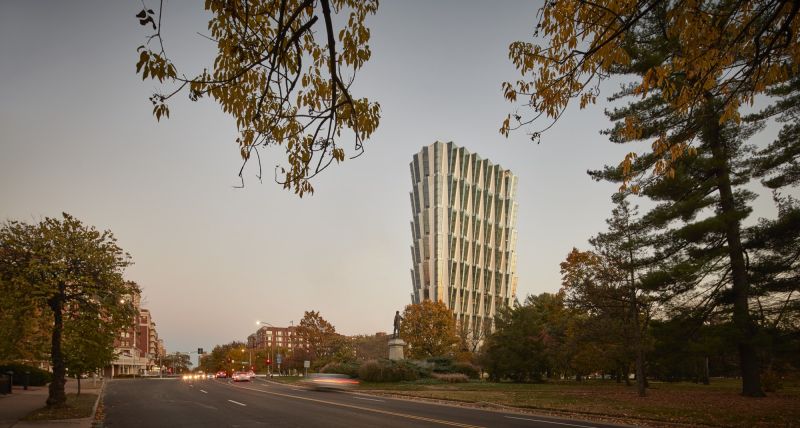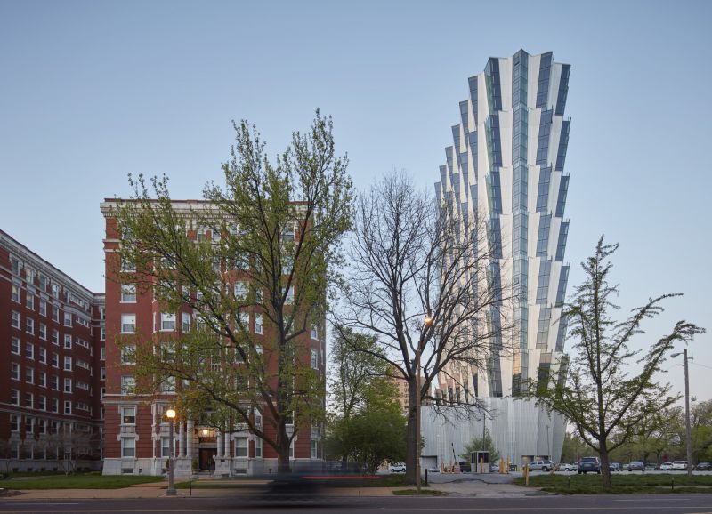 One Hundred is a residential tower overlooking Forest Park in St. Louis. The tower, Studio Gang’s first project in the city, will rise to over 380 feet and include retail, amenities, parking, and residential apartments with views of the park to the west and the Gateway Arch to the east.Four-story tiers are stacked over the height of the tower. The facade is angled to create generous outdoor spaces on top of each tier, providing terraces for a quarter of the apartments, as well as shared amenity space for the resident community atop the green roof podium.