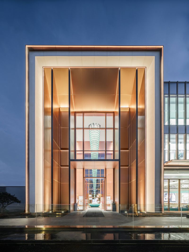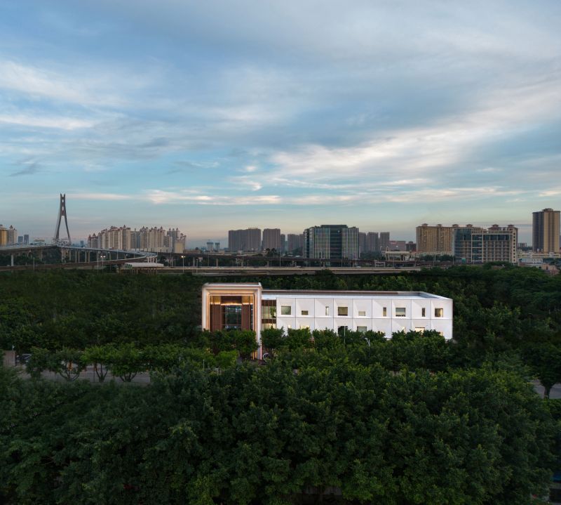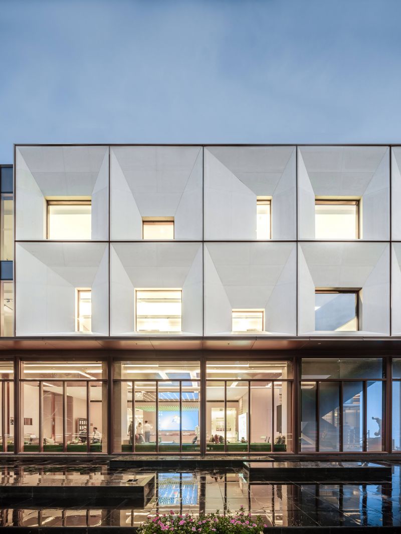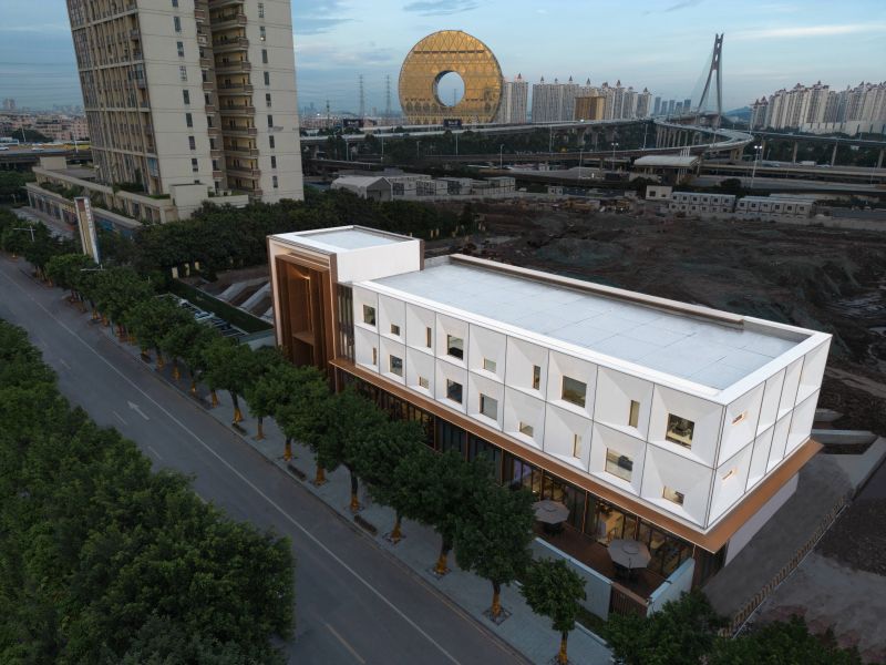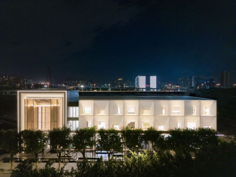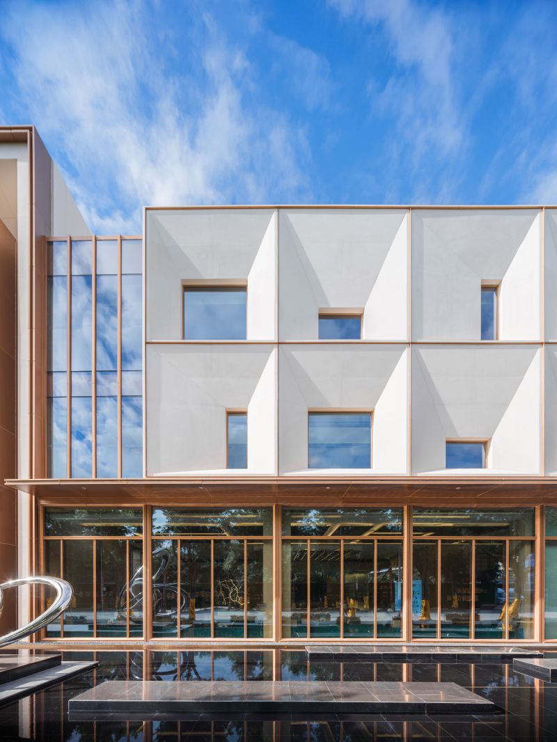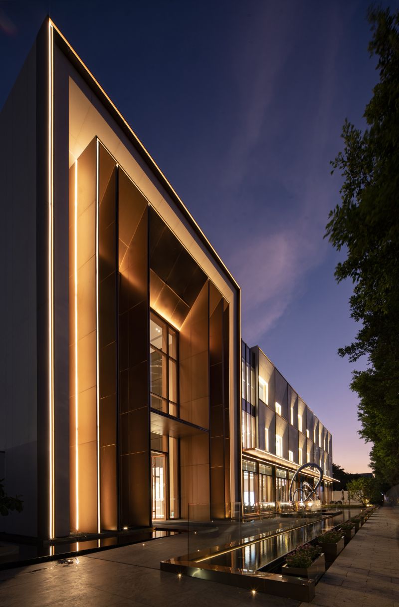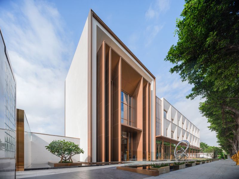 Bronze metal plates, as a local feature of Guanggang, is matched with white stone materials on the exteriors of the building through modern design strategies. The building is thus endowed with a unique temperament which contributes to a highly artistic atmosphere along with changing light and shadows.