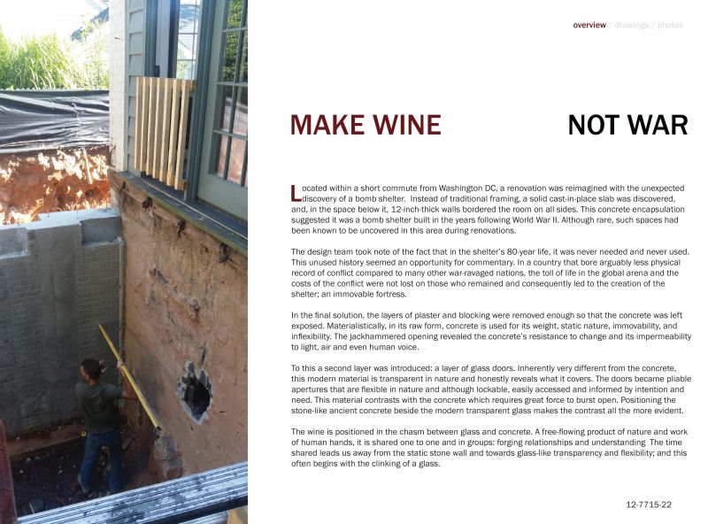 Near Washington a bomb shelter inspires a wine room. Jackhammered concrete openings are left exposed. A layer of glass doors is added. The suspended wine, centered between transparent movable glass and static concrete, symbolize the mediator inviting conversation in during conflict. Even if the design is questioned, it at least fosters valuable conversation while judging. Perhaps done over a glass of wine.