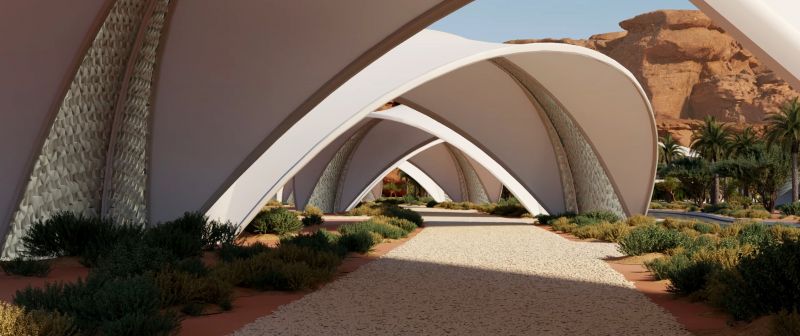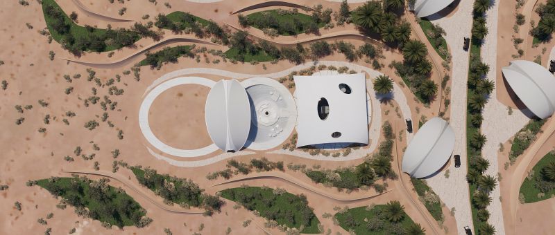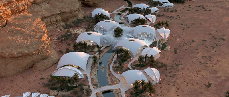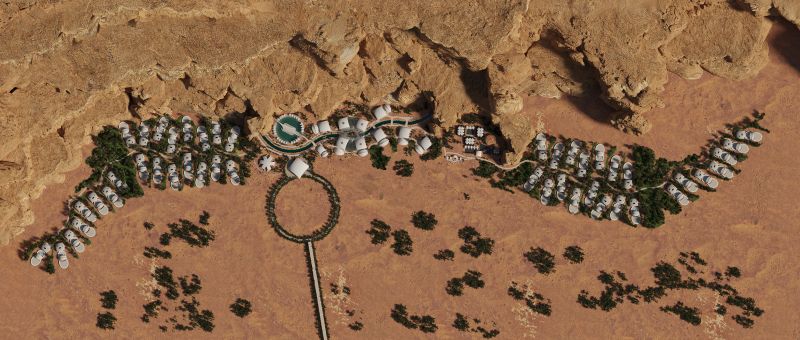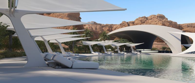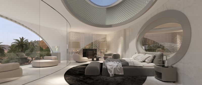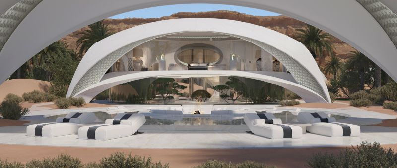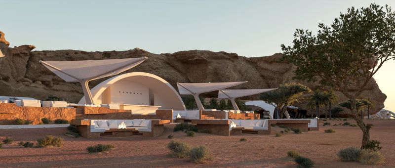 The ultra-modern seven-star boutique MARQUEE hotel with 40 villas is an embodiment of a true oasis. Each villa offers a private patio, a swimming pool and a stunning view of the desert and canyons. Here privacy go together with comfortable relaxation, poetic images are embellished by innovative technologies, and state-of-art architecture addresses the challenging climatic conditions.
