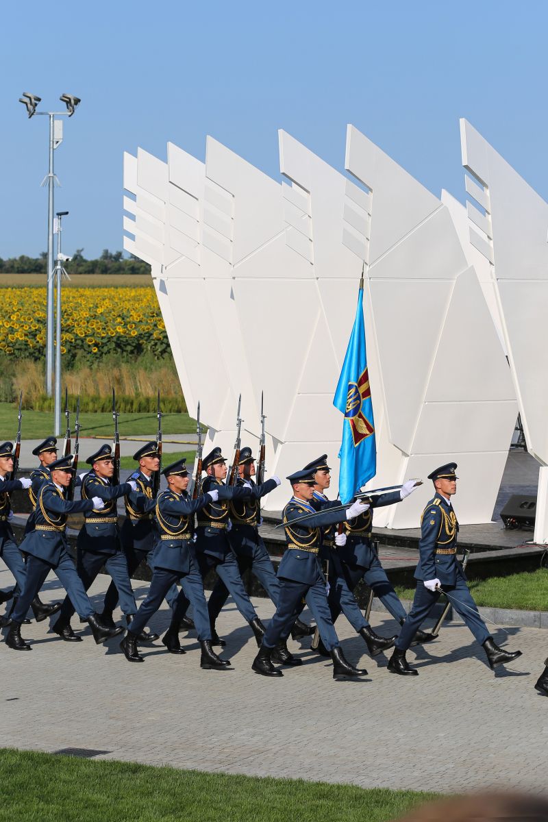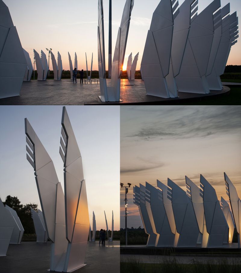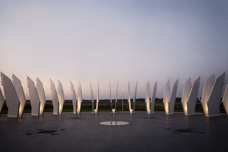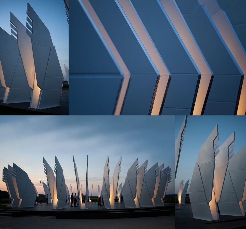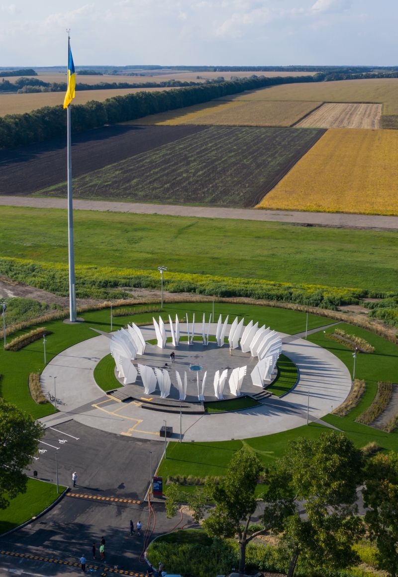 The Geographical Center - "Heart of Ukraine" is a spatial composition. The main component of the installation is a platform measuring a diameter of 25.46 meters and an area of 582.0 m2 with 25 pairs of sculptural wings placed around the perimeter. Each pair symbolizes a country’s region including Crimea and Sevastopol. The Center of Ukraine is a “lens” focused on living history. Dreaming about the future people forget about the present, hence they do not exist neither in the present nor for the sake of the future.