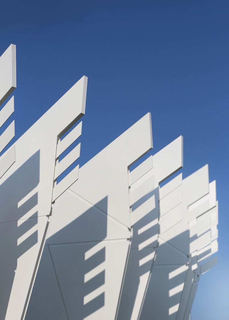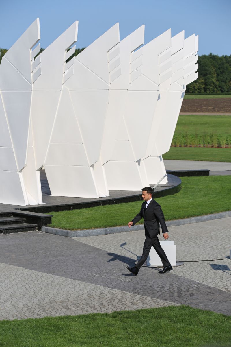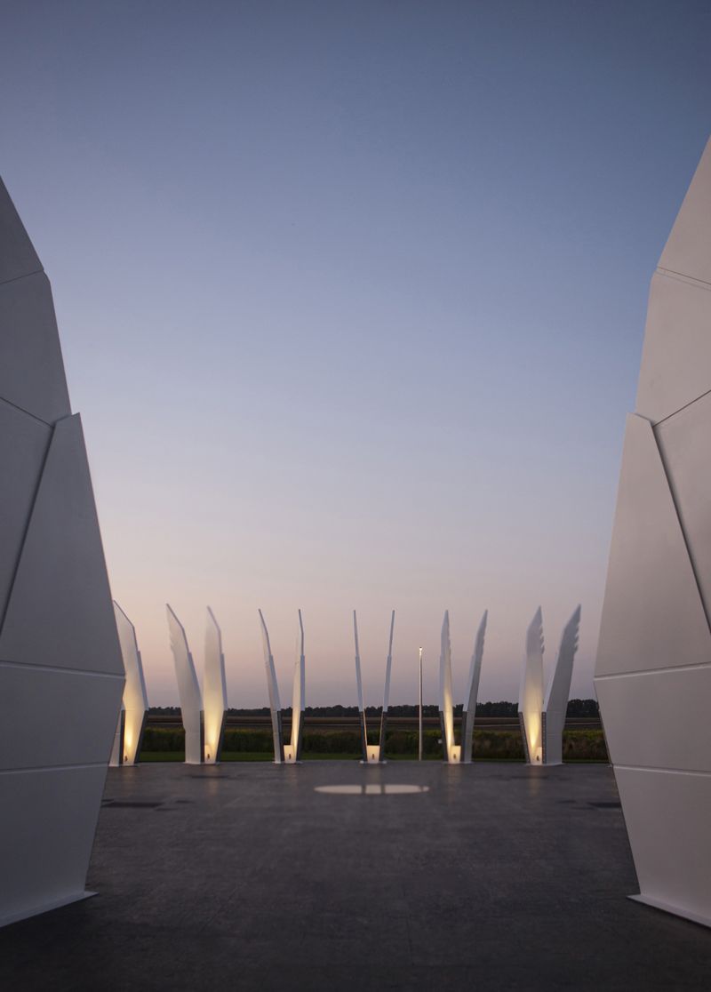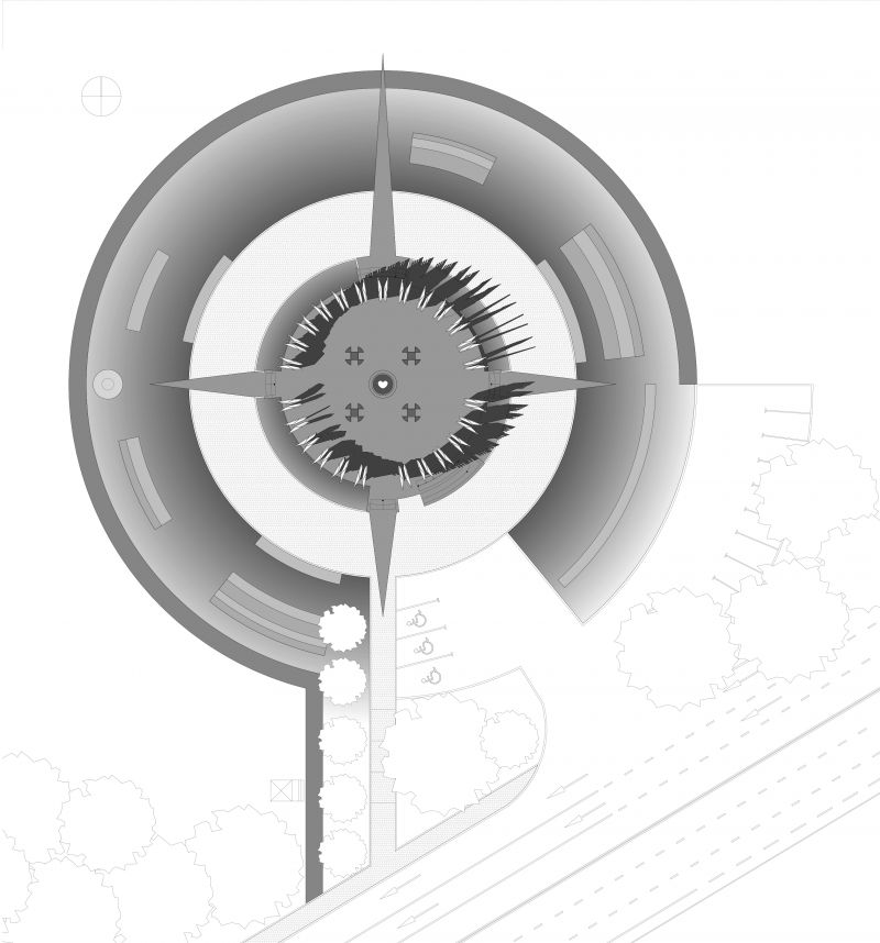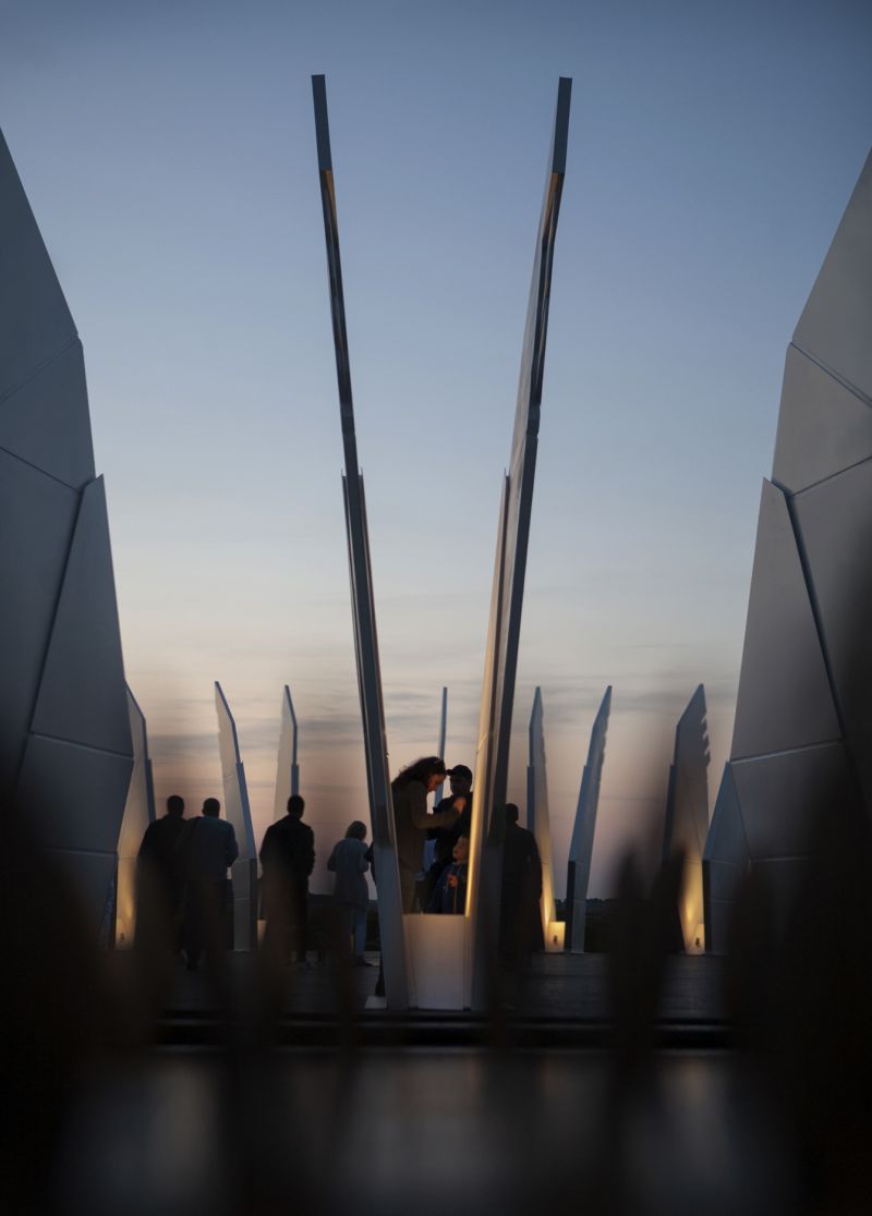 The Geographical Center - "Heart of Ukraine" is a spatial composition. The main component of the installation is a platform measuring a diameter of 25.46 meters and an area of 582.0 m2 with 25 pairs of sculptural wings placed around the perimeter. Each pair symbolizes a country’s region including Crimea and Sevastopol. The Center of Ukraine is a “lens” focused on living history. Dreaming about the future people forget about the present, hence they do not exist neither in the present nor for the sake of the future.
