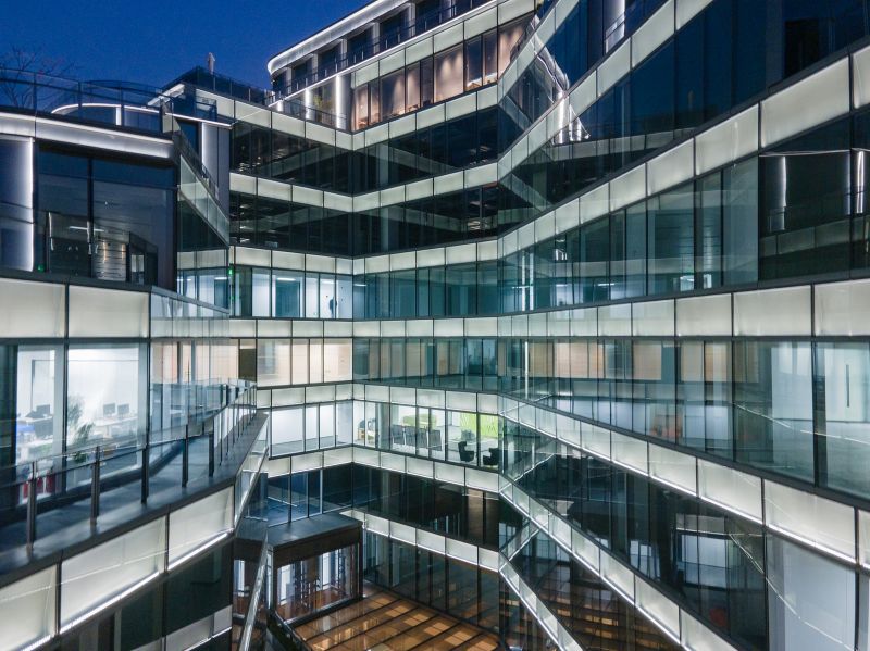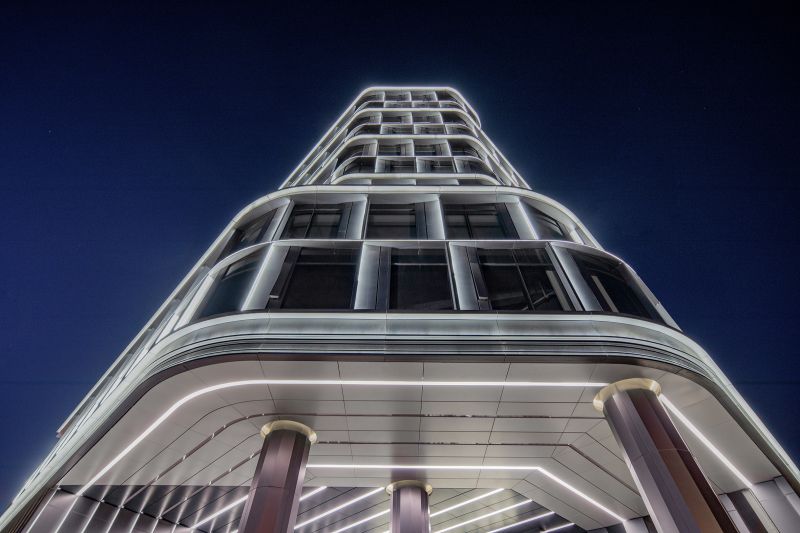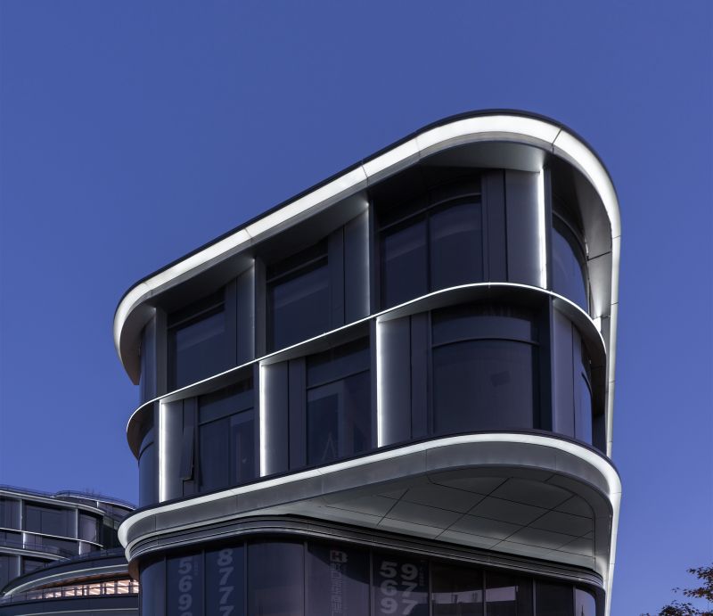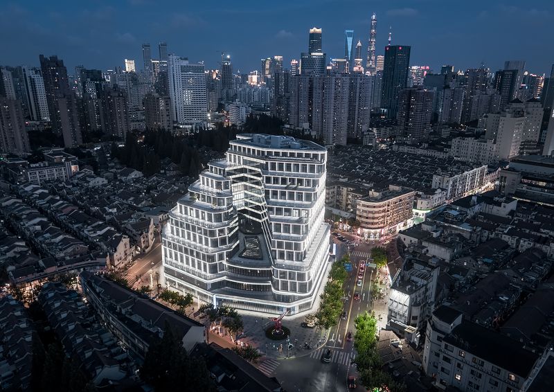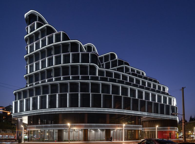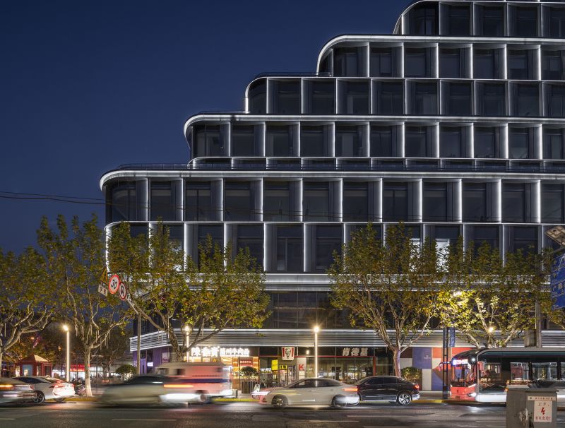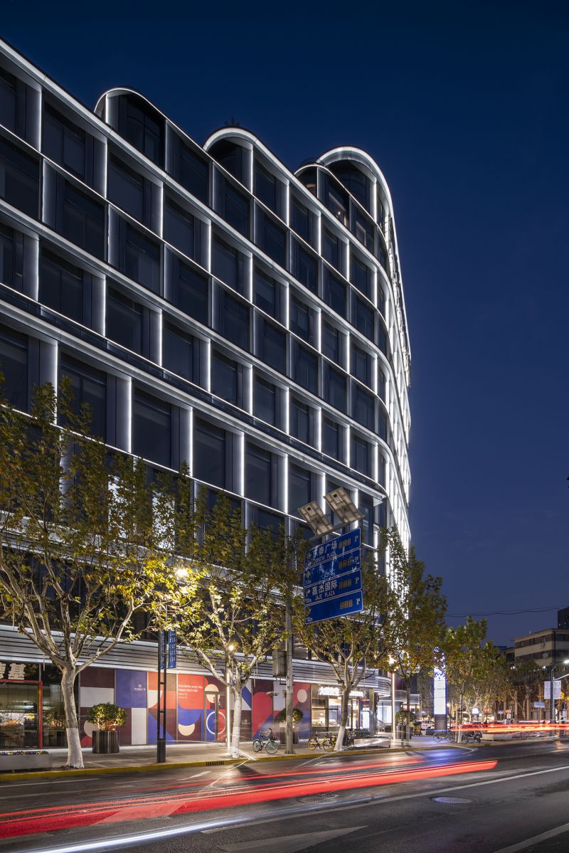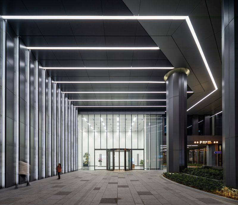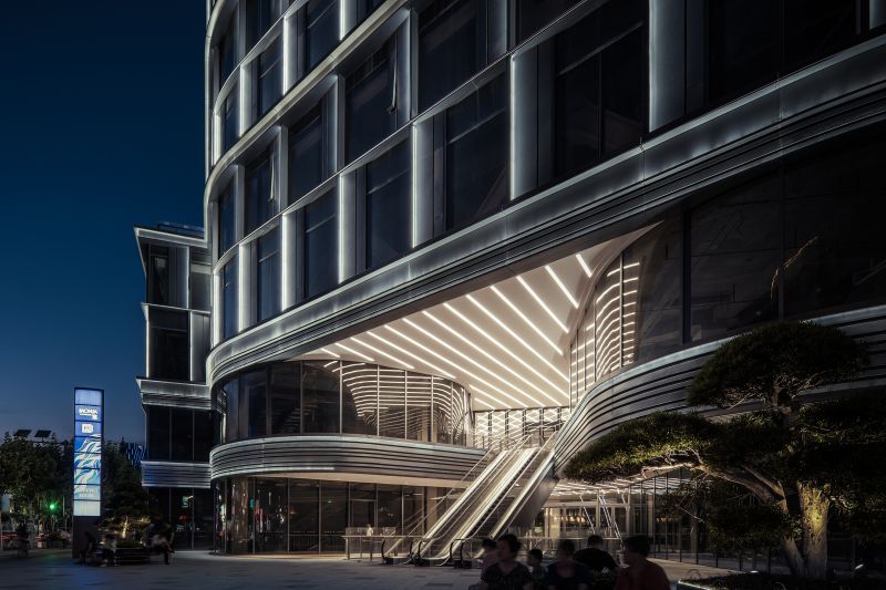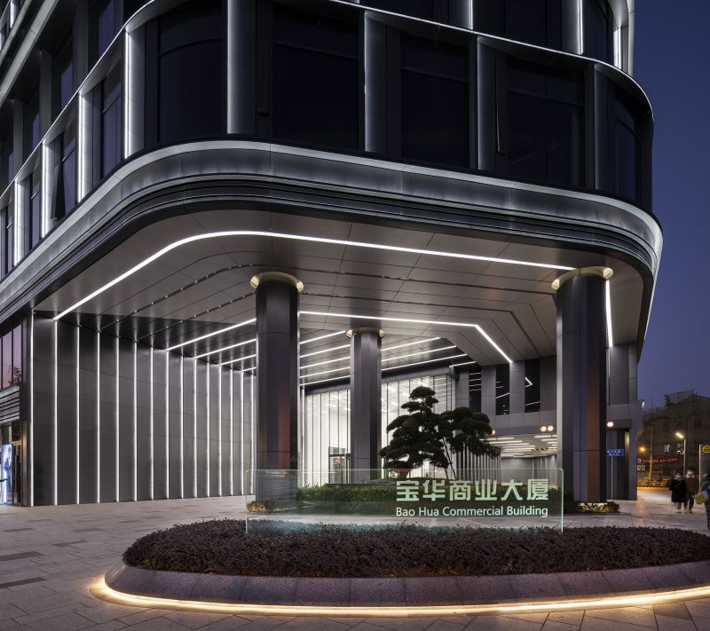 BaoHua Plaza, simulates the shape of a valley at its facade, presenting cavernous beauty through an imitation of natural jade-stone and jewelry-like folding art. The lighting design perfectly combines the lamps with the curtain wall components so that the lamps illuminating the folded panels are completely hidden. At night, the texture of the curtain wall is strengthened and presented through light and shadow. The bright white light enriches layers of undulating contours, while its dazzling visual effect presenting a natural gem-like building as a whole.
